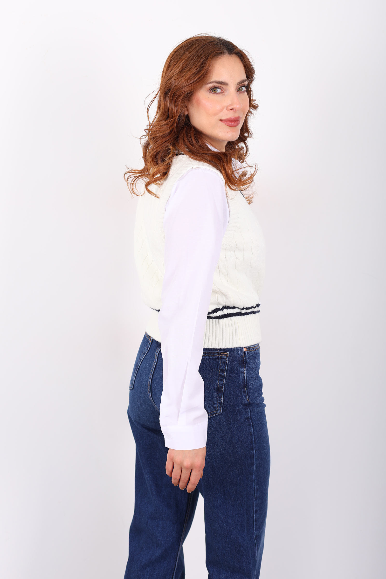 Çizgili Triko Krem Kadın Crop Kazak