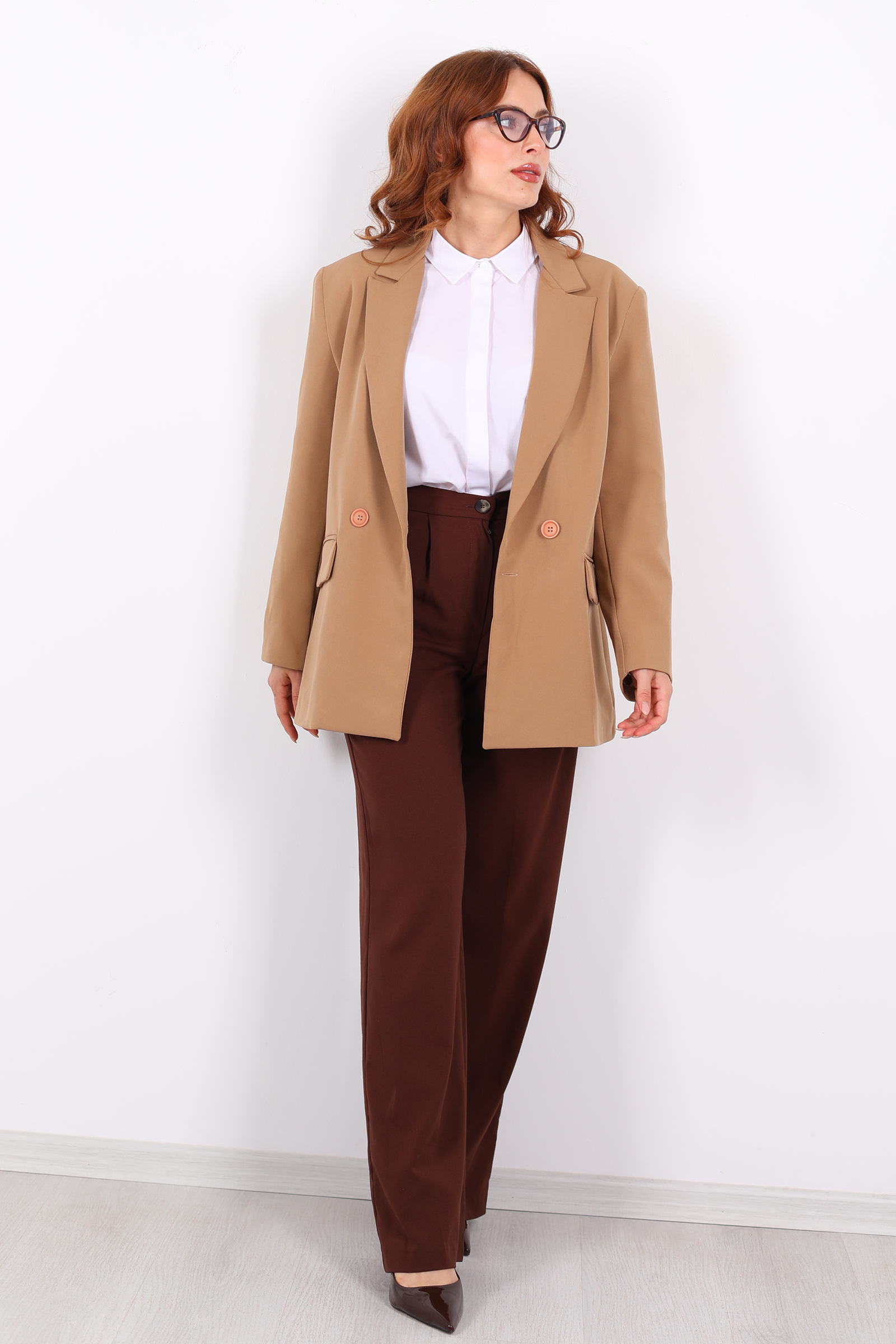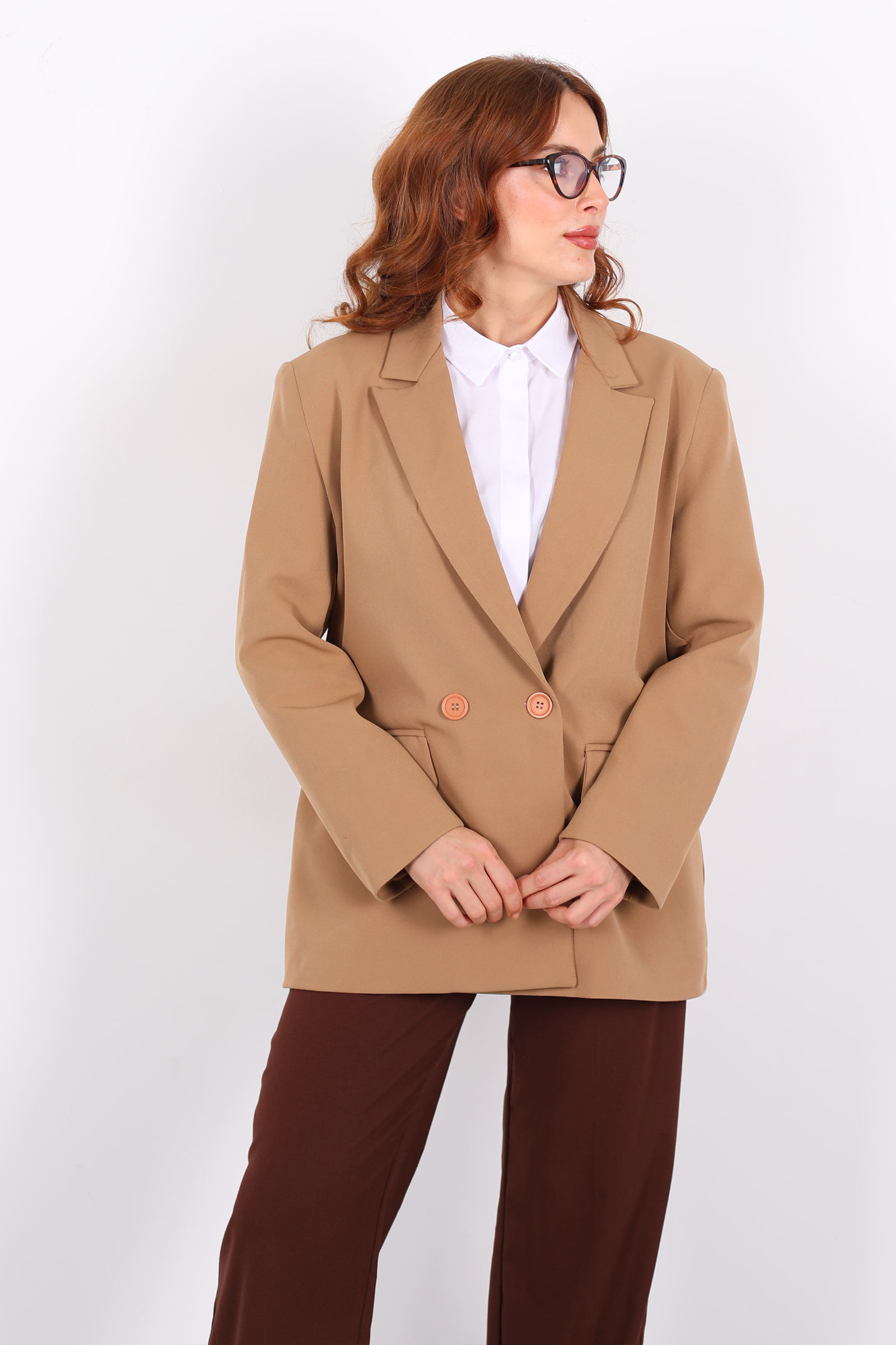 Vatkalı Kruvaze Yaka Kadın Vizon Blazer Ceket