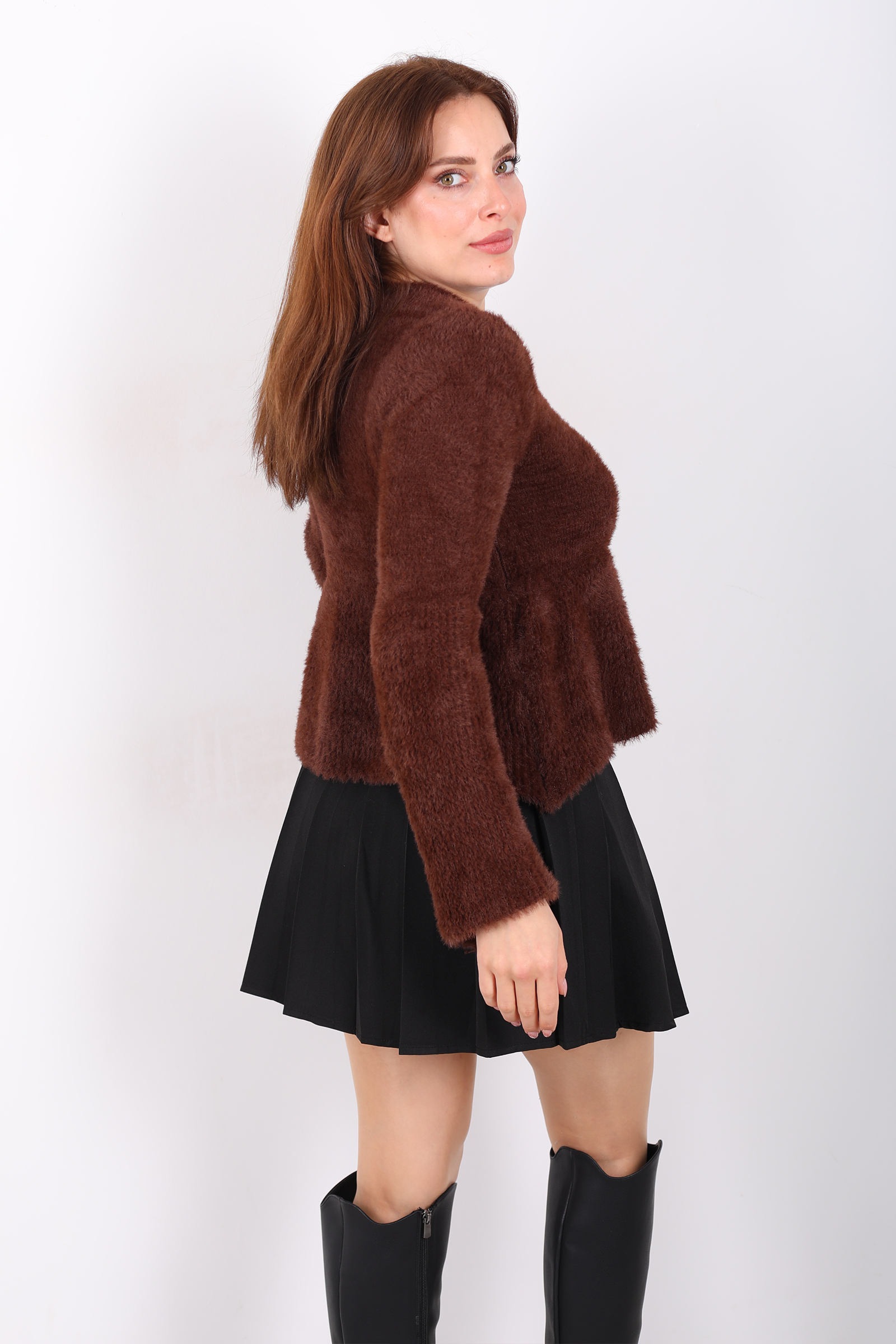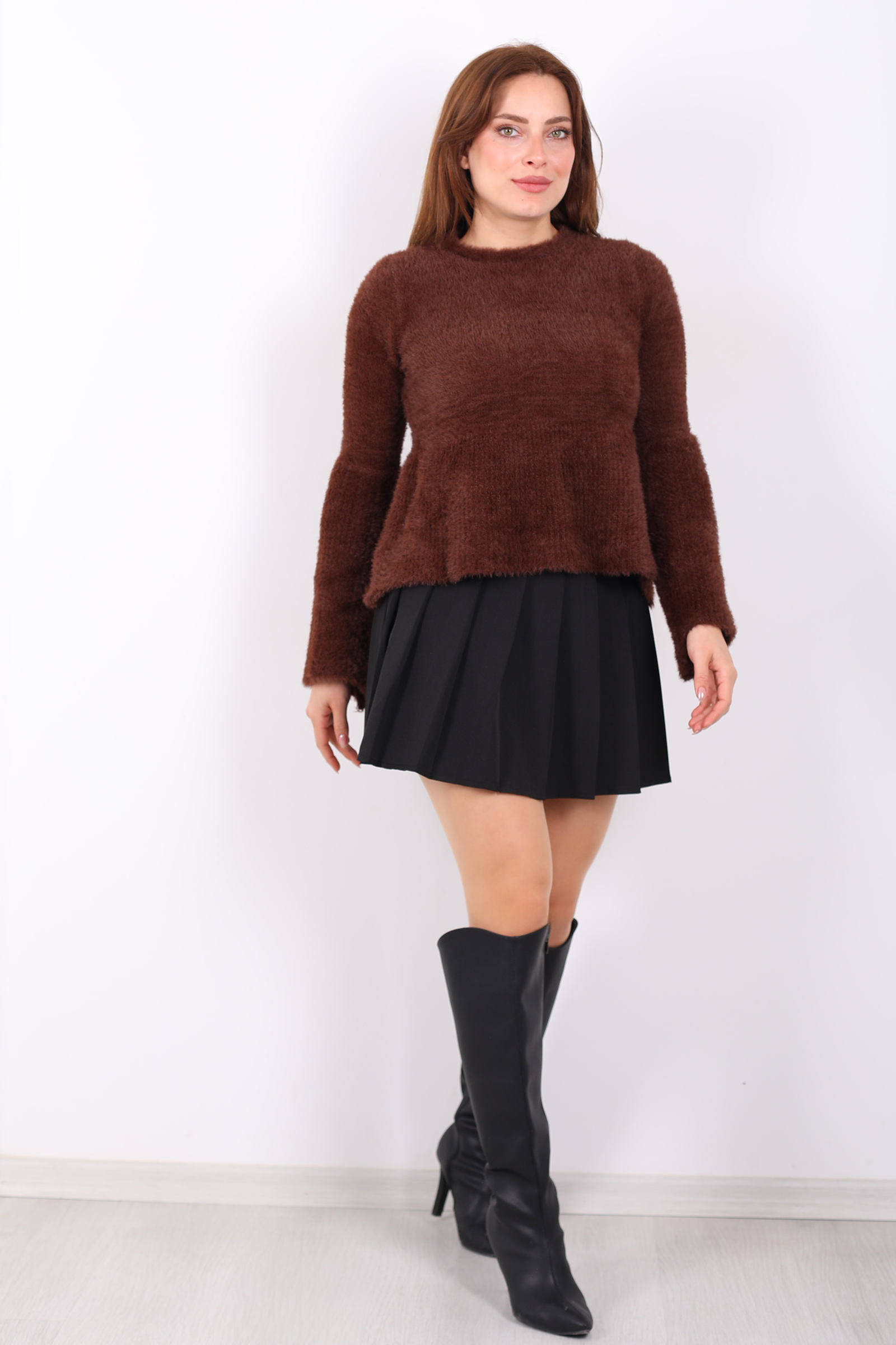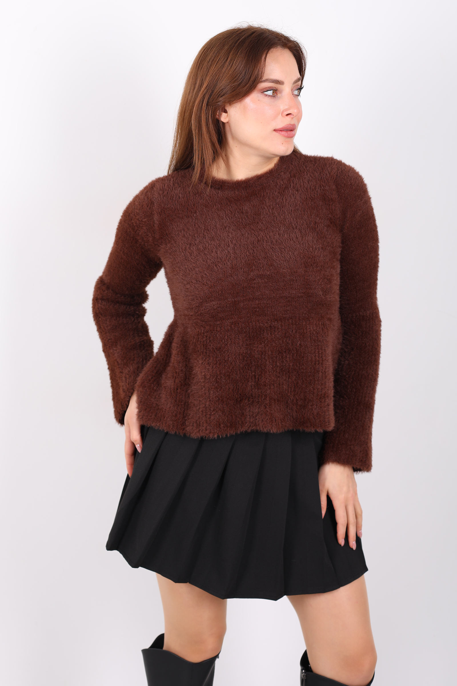 Bu kahverengi volanlı sakallı triko kazak, hacimli örgü dokusuyla dokunuşta zengin bir his yaratır. Volan detayları omuz ve kol hatlarını yumuşak bir şekilde vurgulayarak parçaya hareket katar. Hafif esnek yapısı, gün boyu rahat kullanım sunarken sade çizgilerle farklı alt parçalarla kolayca eşleşir. Derin kahverengi tonu, jean veya kumaş pantolonlarla uyumlu bir uyum sağlar; gündelik kombinlerinize zarif bir stil dokunuşu ekler. Minimal ama karakterli tasarımıyla hem şehir stilinde hem de hafta sonu görünümünde öne çıkan bir kazak.