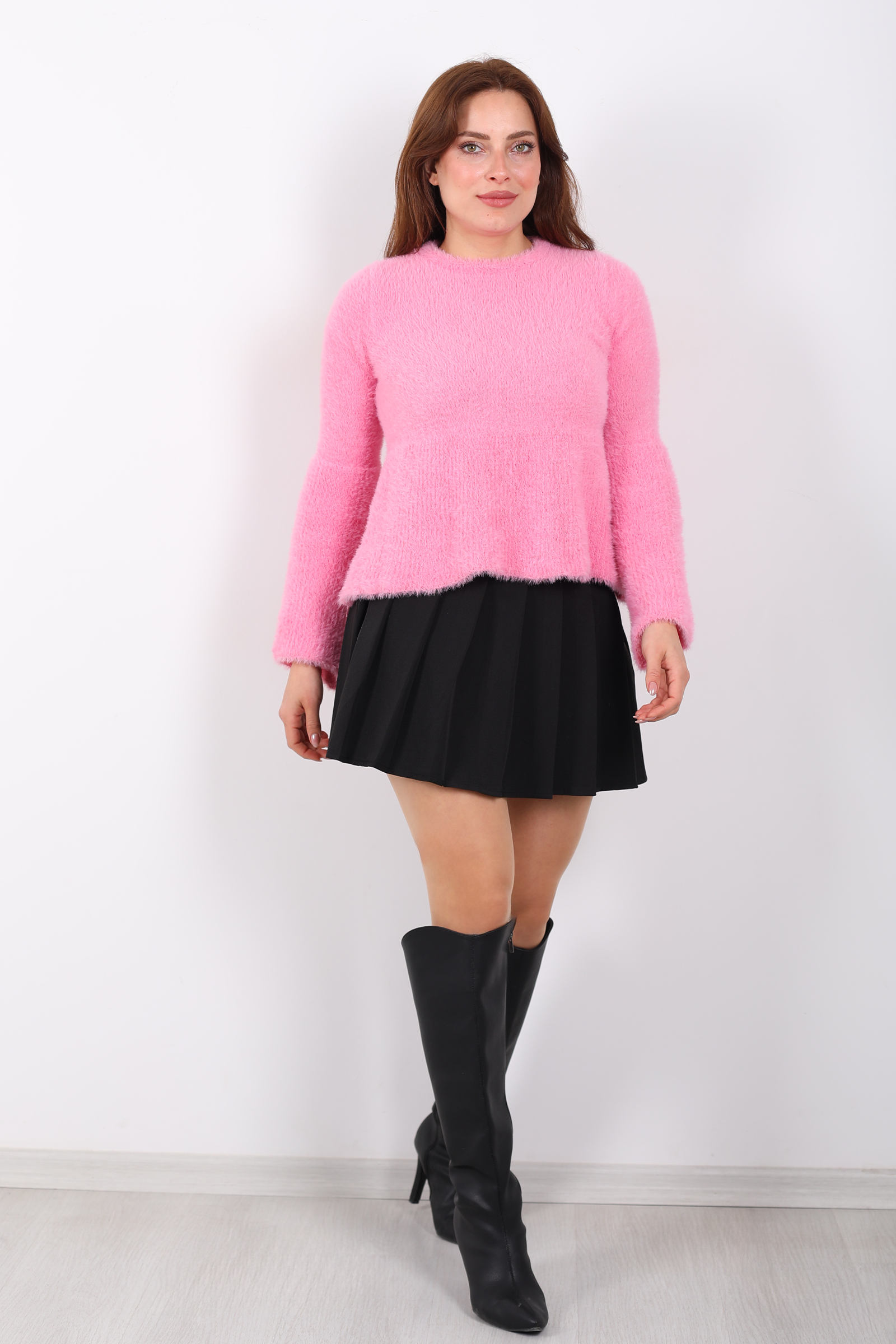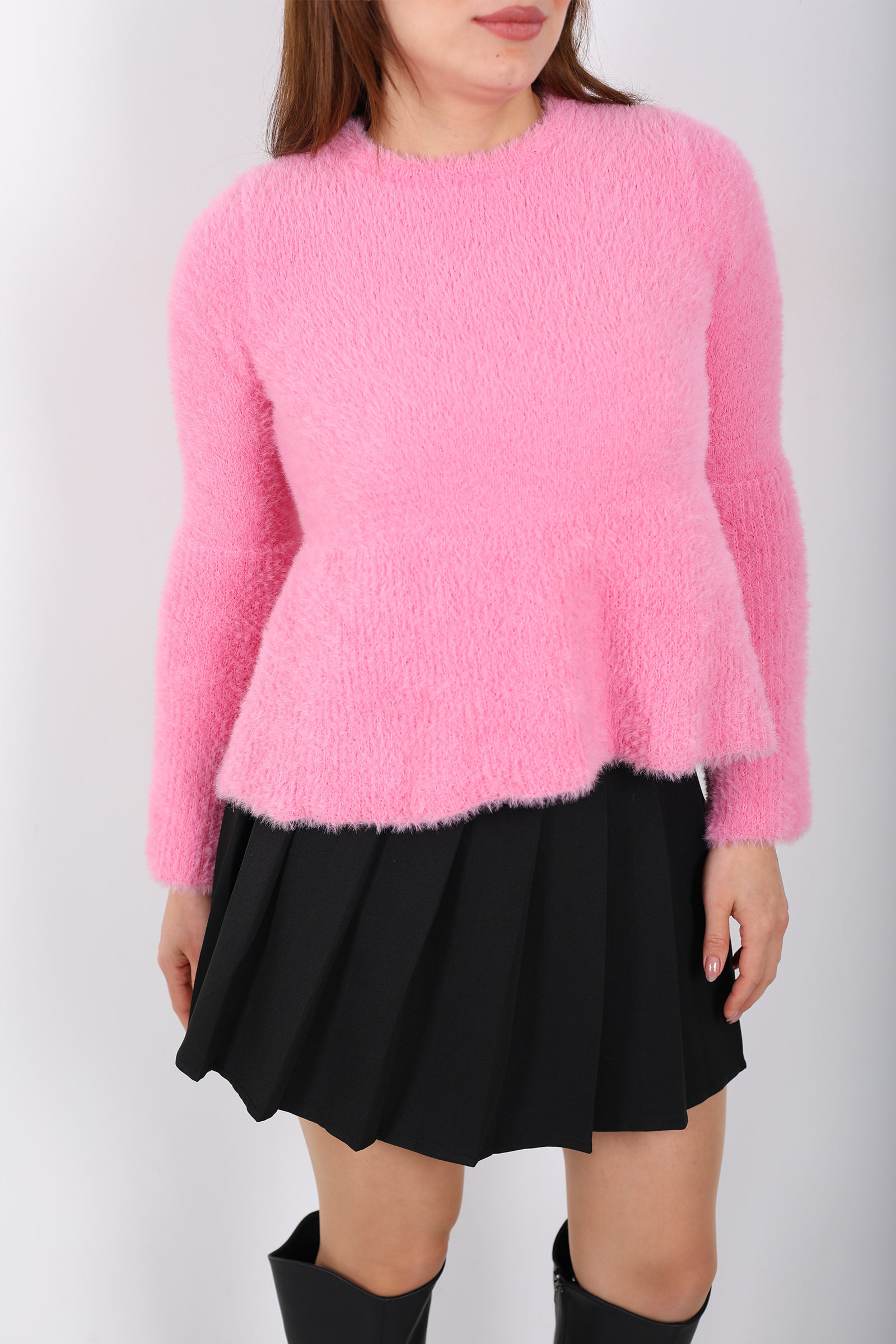 Bu pembe volanlı sakallı triko kazak, hacimli örgü yapısını feminen detaylarla birleştirerek her kombinize tatlı bir vurgu ekler. Volanlar omuz hattını yumuşatırken, sakallı doku kazağa belirgin bir hacim sağlar ve hareketli bir etki yaratır. Soft pembe ton, jean veya kumaş altlarla uyumlu bir kontrast yakalar ve gündelik kombinlerinize sıcak bir hava katar. Kendine özgü tasarımıyla hem sade hem dikkat çekici bir stil isteyenler için uygun bir parça. (berox.com.tr)