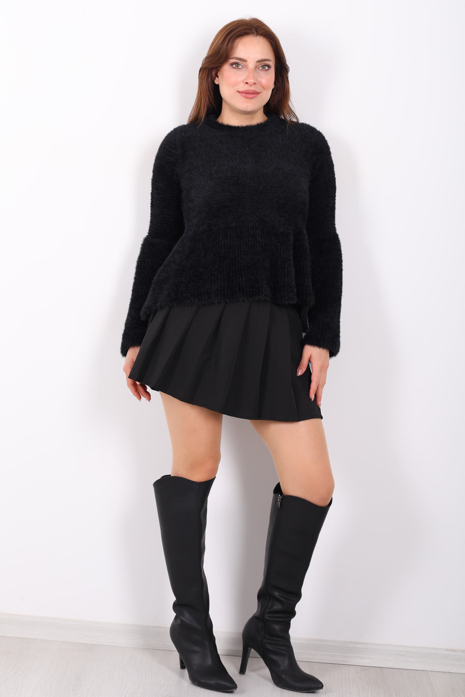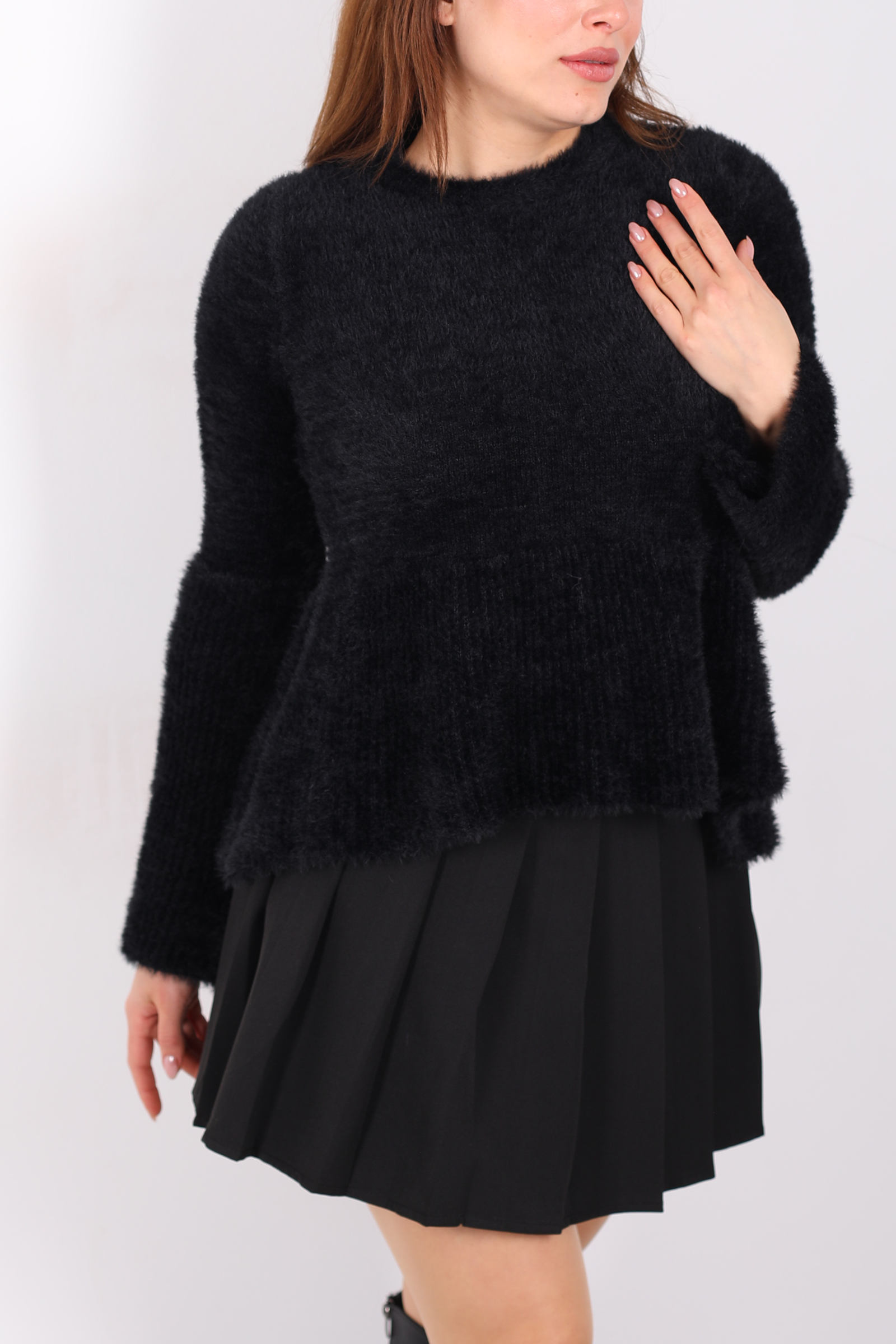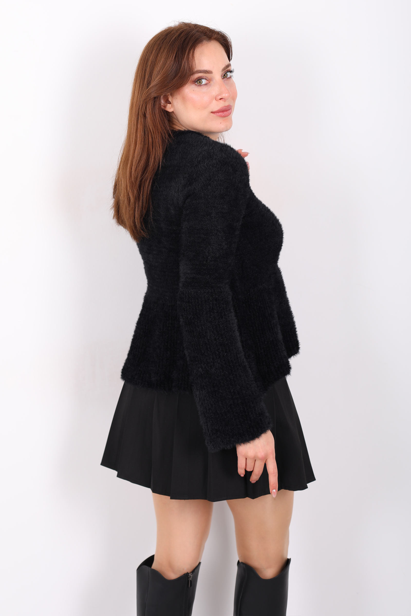 Bu siyah volanlı sakallı triko kazak, zengin örgü dokusunu feminen ayrıntılarla birleştirerek stilinize karakter katar. Volan detayı omuz çizgisini yumuşakça vurgularken, sakallı örgü yapısı hacimli bir görünüm sunar. Esnek kumaşı, farklı üstlerle kolayca kombinlenebilir ve konforlu bir his sağlar. Derin siyah tonu, jean veya kumaş pantolonlarla dengeli bir uyum yakalar; günlük şehir stilinde rahat ama zarif bir ifade oluşturur. Minimal ama etkileyici detaylara sahip bu kazak, gardırobunuzda modern ve dikkat çekici bir parça olarak öne çıkar.