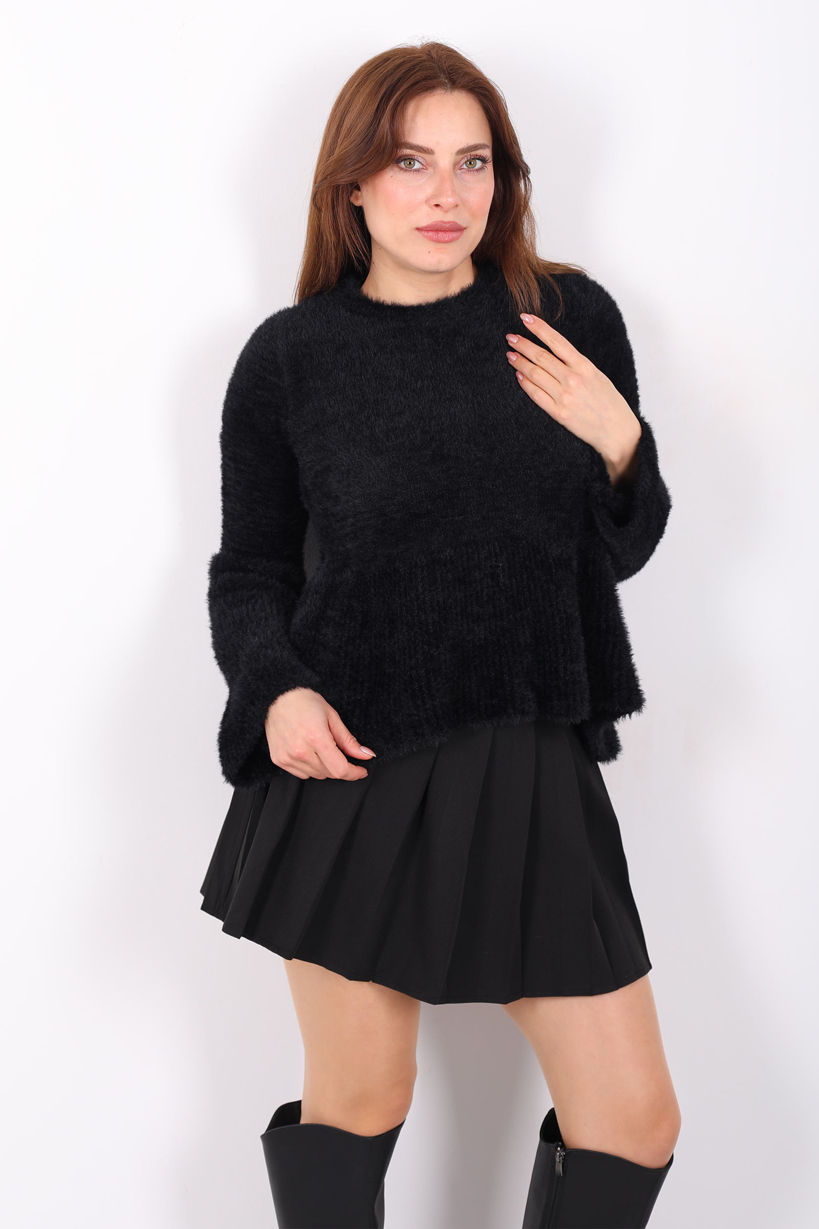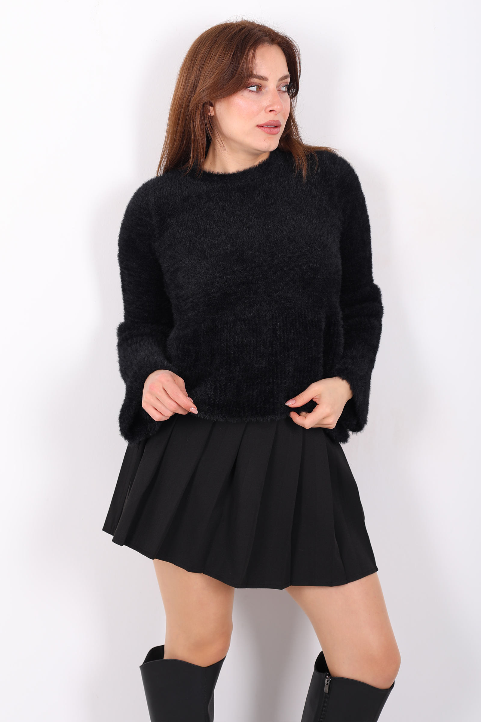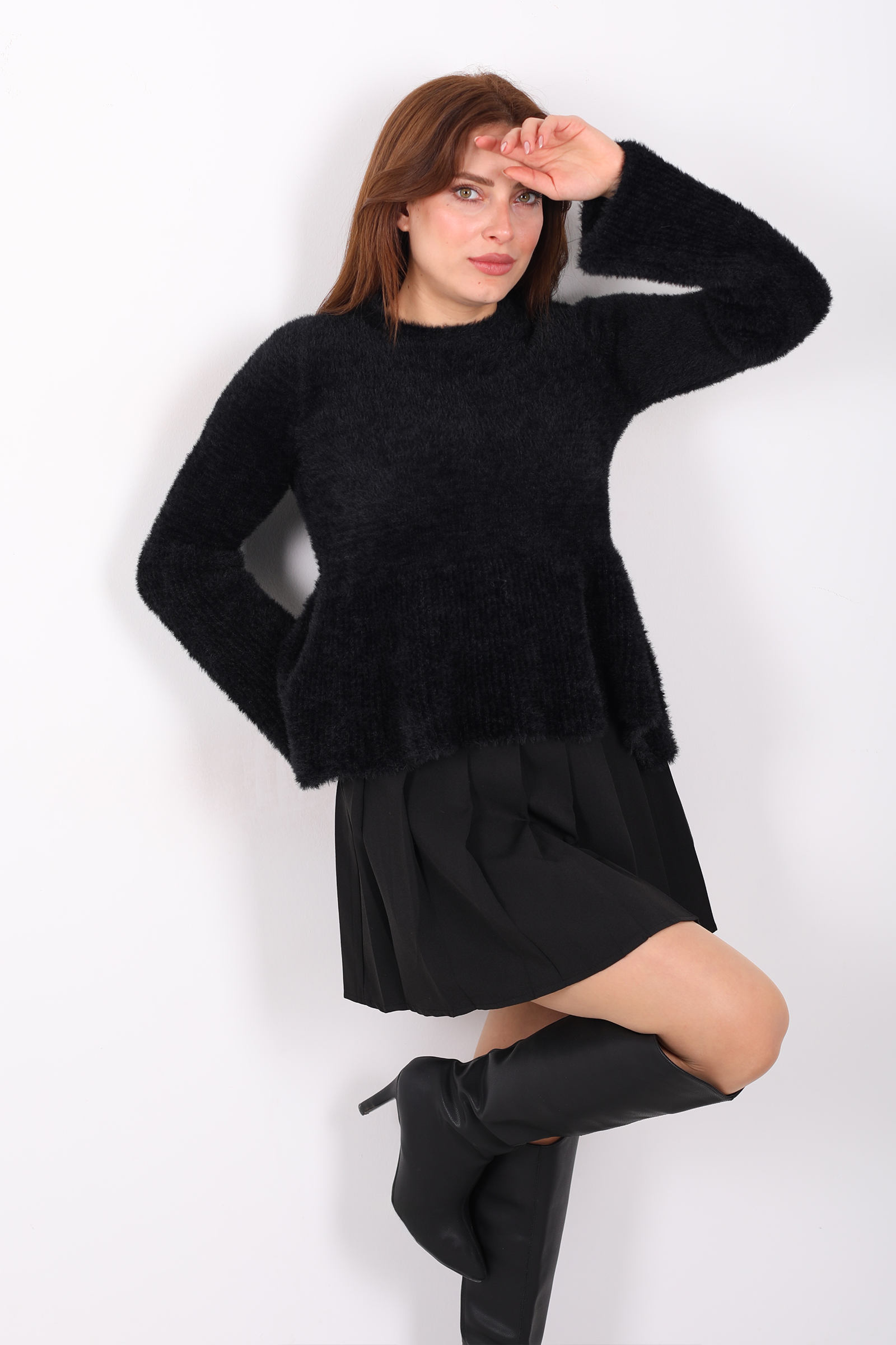 Bu siyah volanlı sakallı triko kazak, zengin örgü dokusunu feminen ayrıntılarla birleştirerek stilinize karakter katar. Volan detayı omuz çizgisini yumuşakça vurgularken, sakallı örgü yapısı hacimli bir görünüm sunar. Esnek kumaşı, farklı üstlerle kolayca kombinlenebilir ve konforlu bir his sağlar. Derin siyah tonu, jean veya kumaş pantolonlarla dengeli bir uyum yakalar; günlük şehir stilinde rahat ama zarif bir ifade oluşturur. Minimal ama etkileyici detaylara sahip bu kazak, gardırobunuzda modern ve dikkat çekici bir parça olarak öne çıkar.