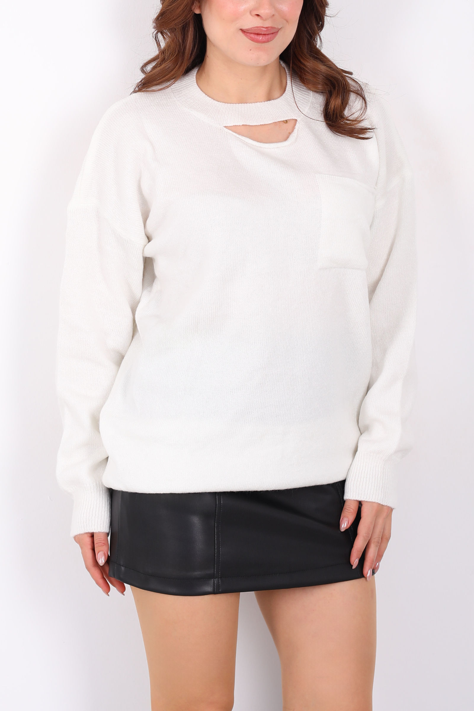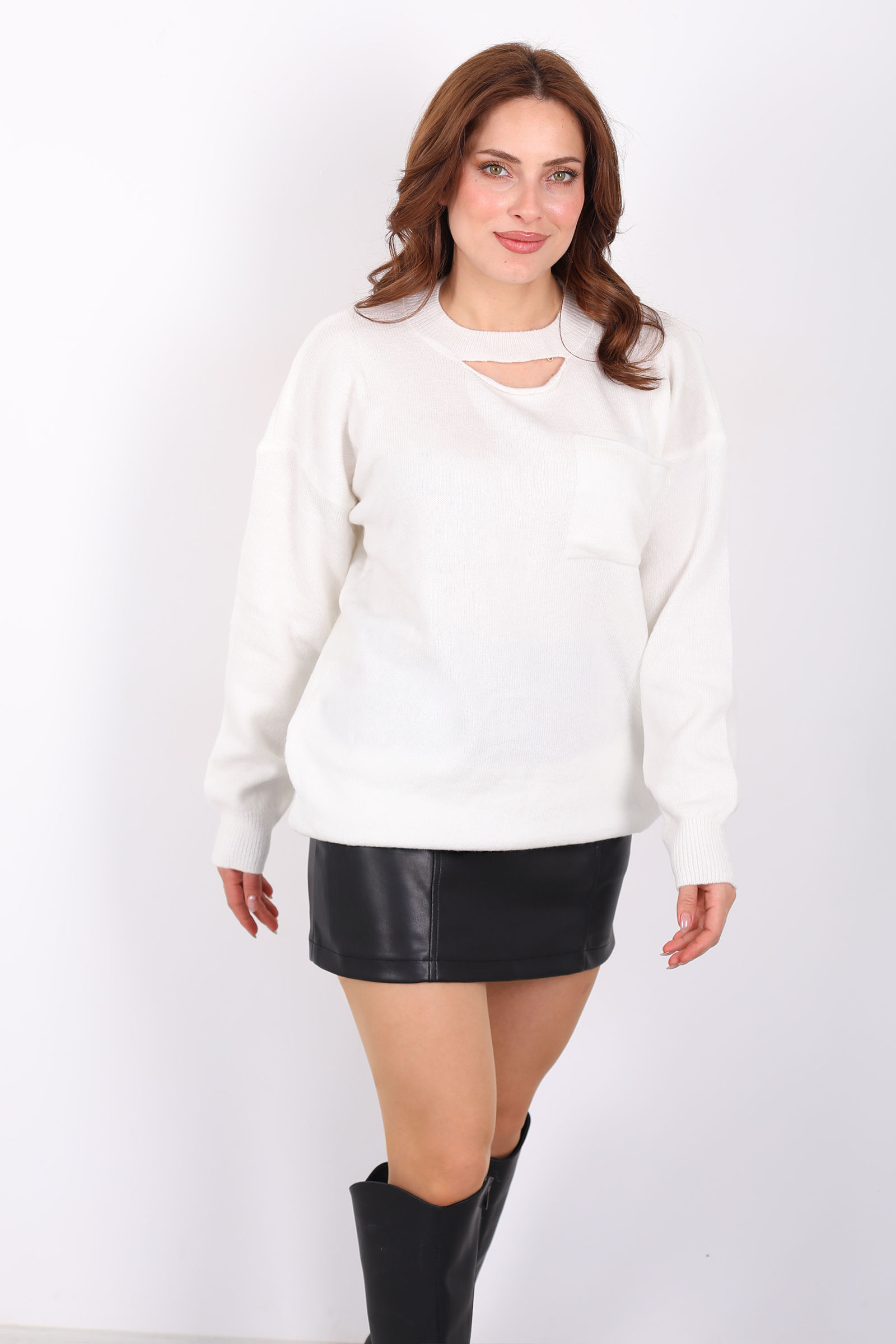 Bu ekru triko kazak, zarif yaka dekolte detayıyla feminen bir dokunuş sunar. Yumuşak triko kumaşı sayesinde gün boyu konforlu ve sıcak bir kullanım sağlar. Ekru tonunun sade ve şık görünümü, farklı tarz kombinlerle kolayca uyum sağlar. Modern kesimi, rahat kalıbı ve ince detaylarıyla hem günlük stilinizde hem de özel buluşmalarınızda öne çıkan bir parça olur. Klasik pantolonlar, etekler veya jeanlerle kombinleyerek kendi stilinizi özgürce ifade edebilirsiniz.