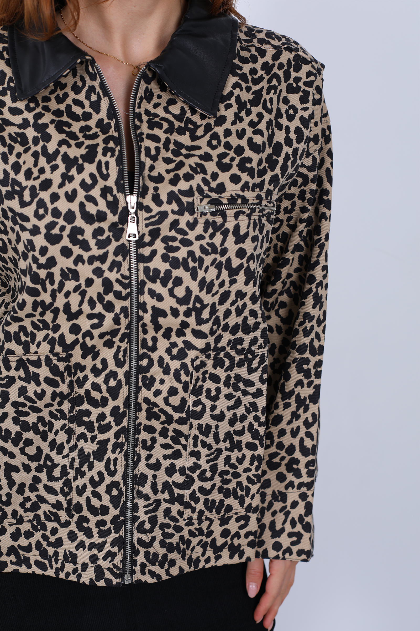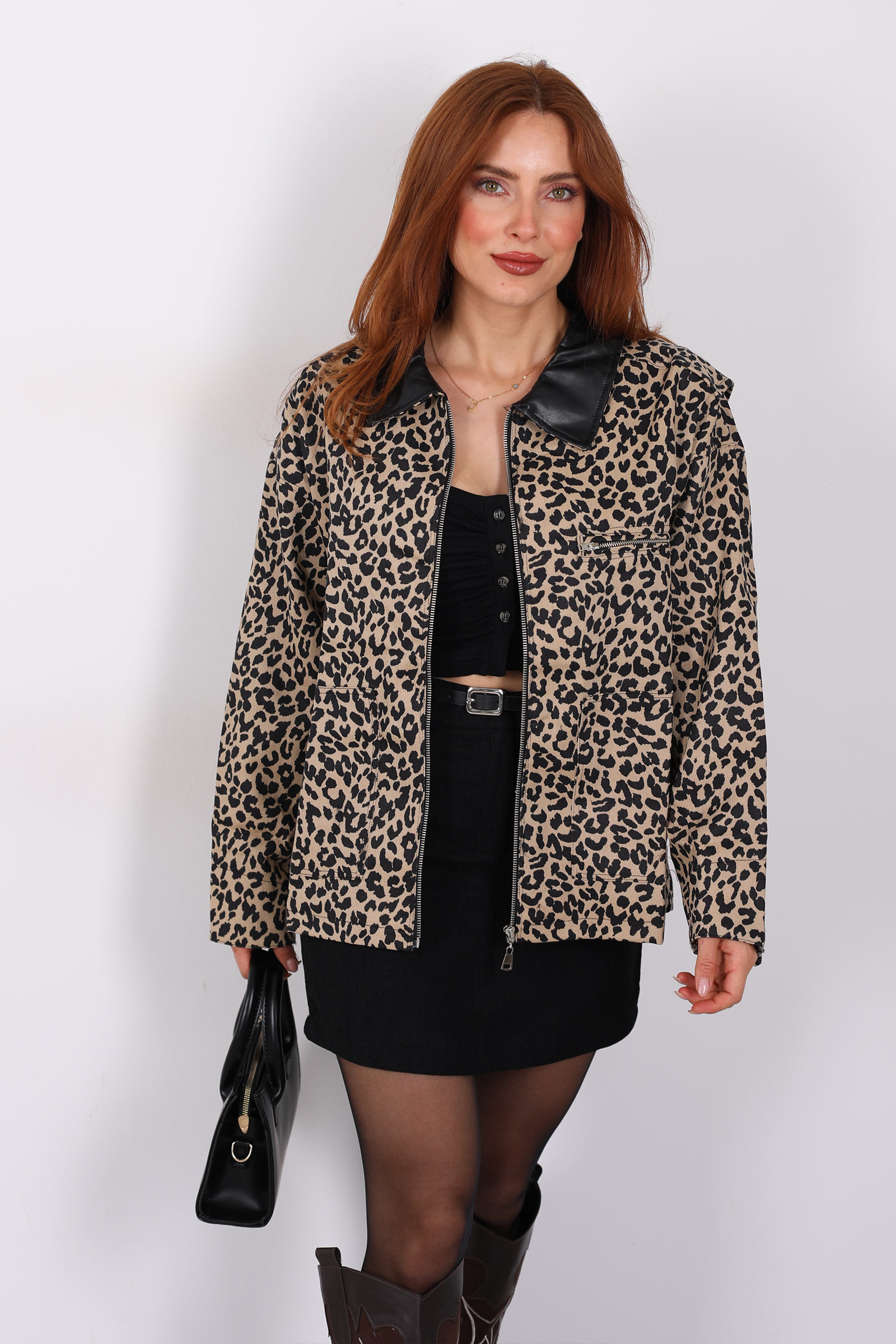 Bu ceket, derin leopar deseni ile siyah deri yaka detayı birleştirerek güçlü ve zarif bir stil sunuyor. Vahşi desenin enerjisi, deri yakanın sertliğiyle dengelenmiş; hem şehirli hem asi bir duruş yaratıyor.Leopar baskılı kumaşı, yumuşak dokulu ancak yapılandırılmış bir yüzey sağlar; deri yaka ise hem görsel kontrast hem de kalite vurgusu yapar.Önden fermuarlı kapanışı sayesinde pratik ve modern bir hava kazandırıyor; istenirse açık takılarak daha gevşek bir siluet oluşturulabilir.