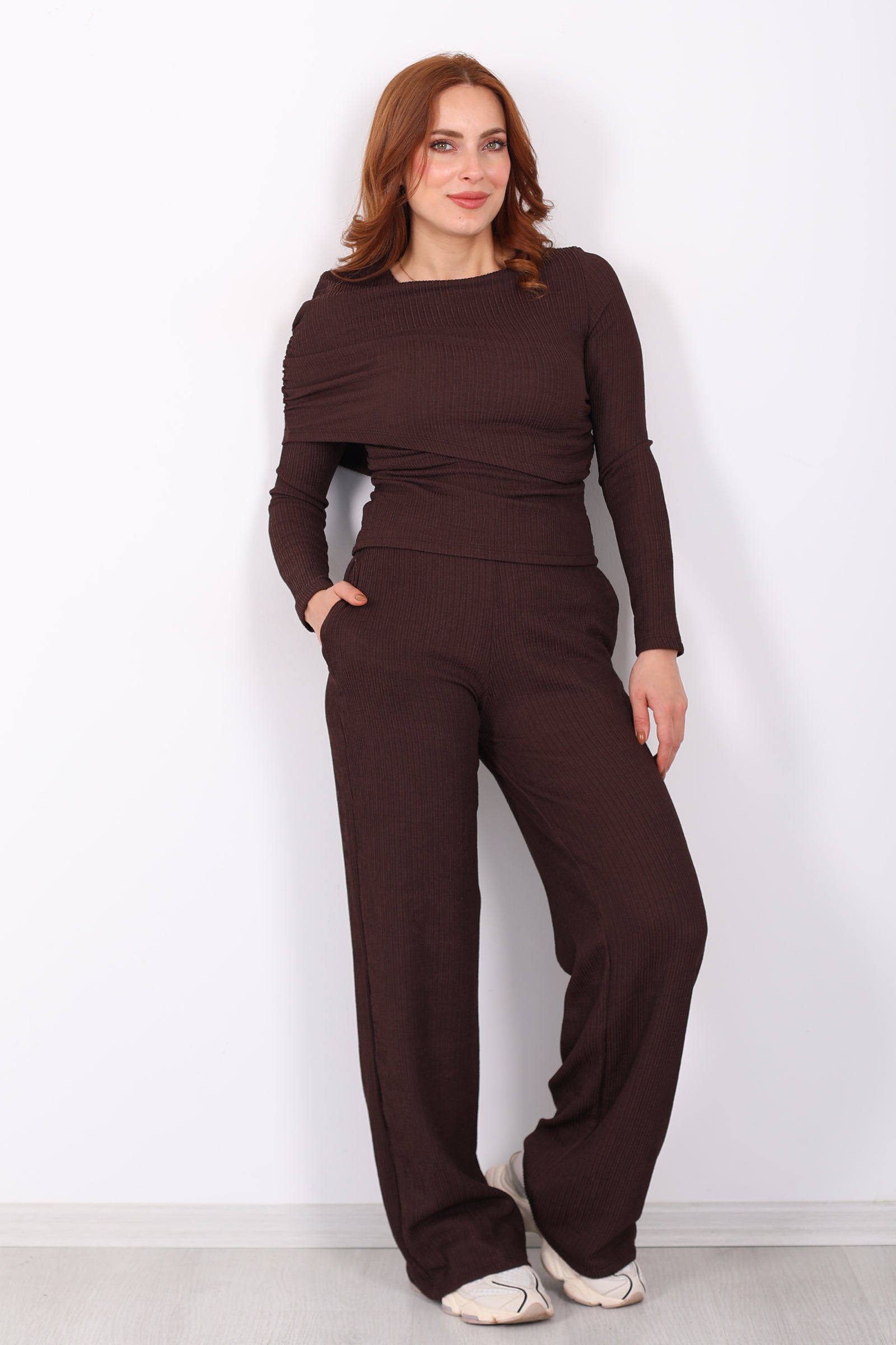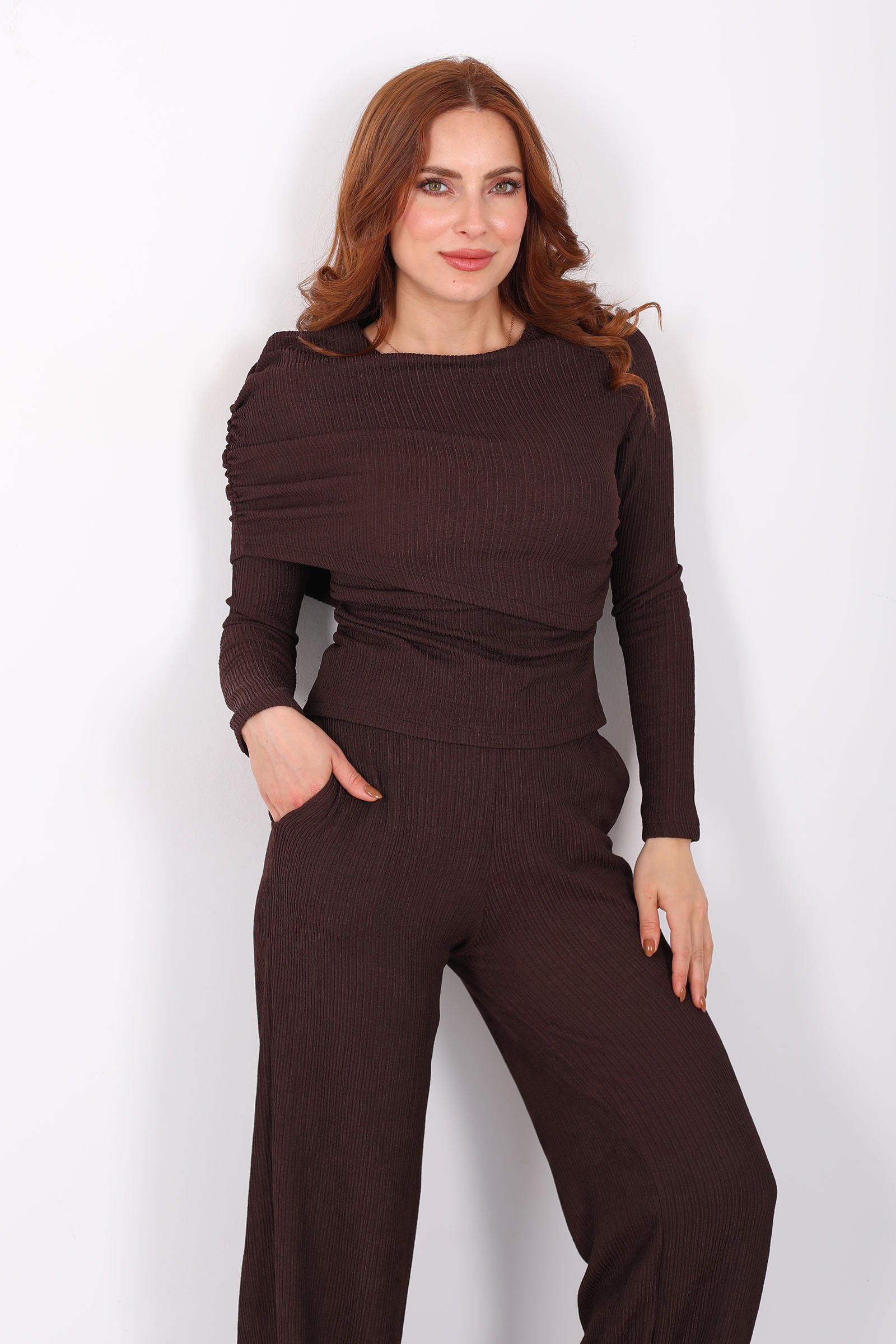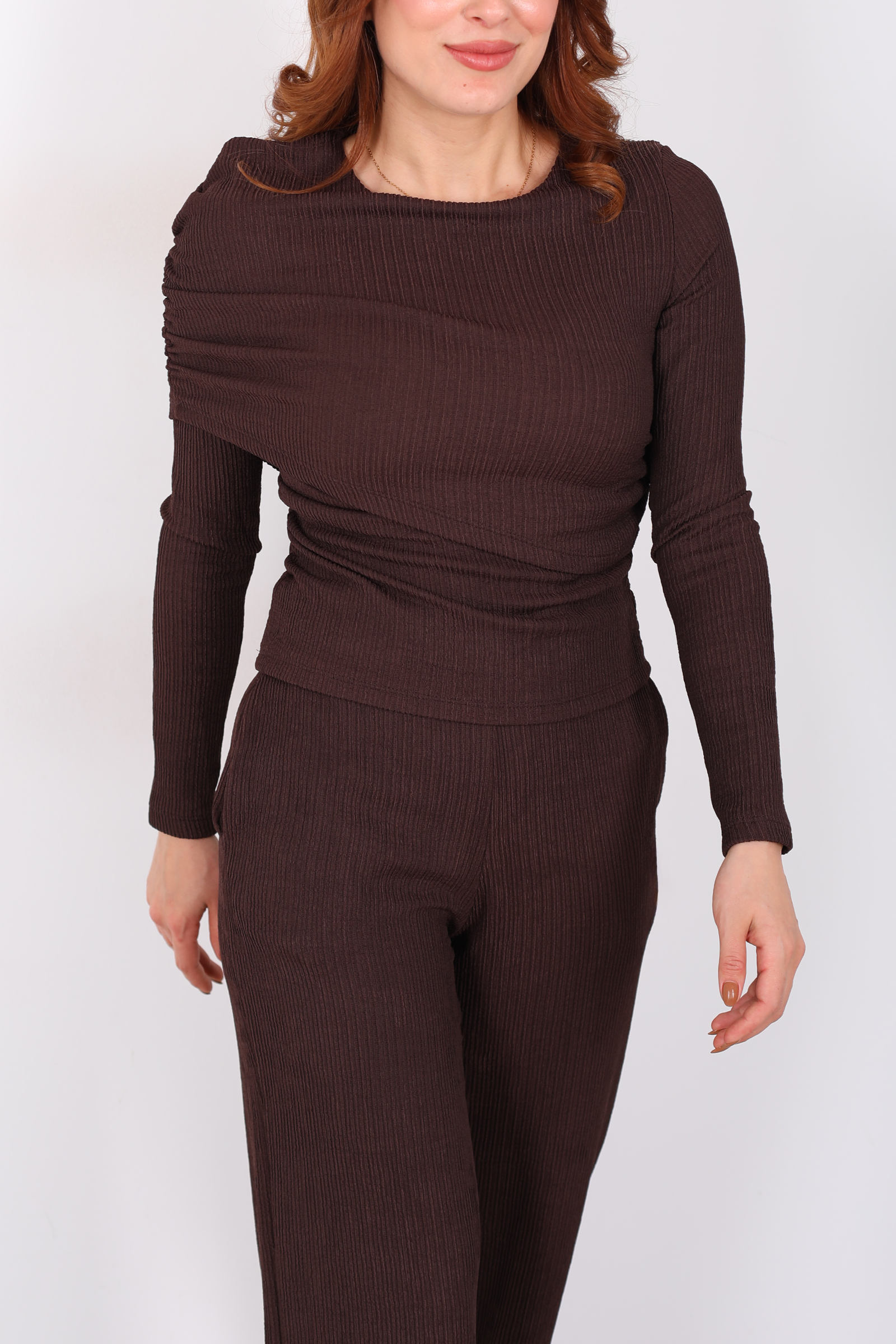 Yaka Detaylı Büzgülü Kahverengi Kadın Fitilli Takım