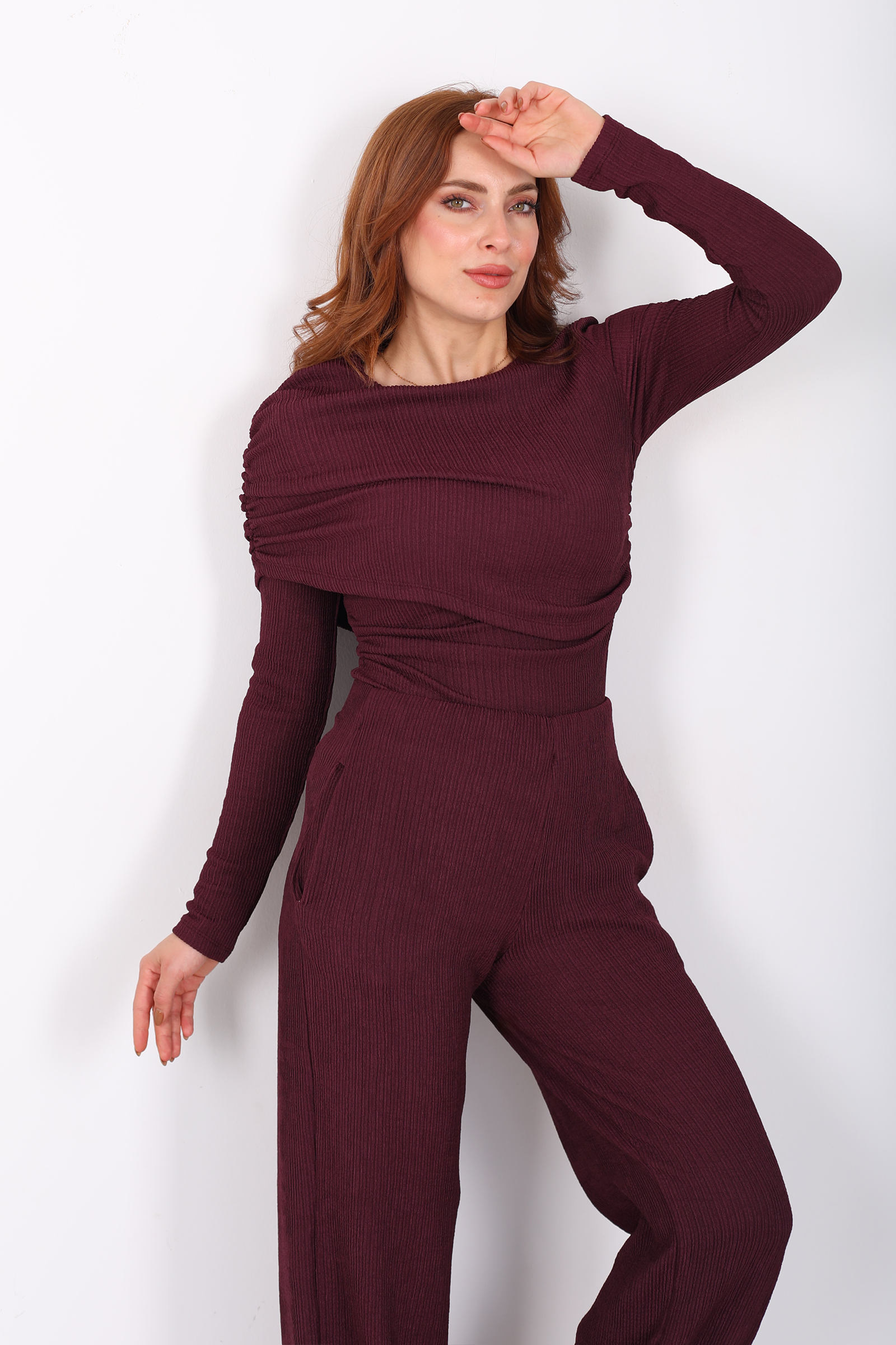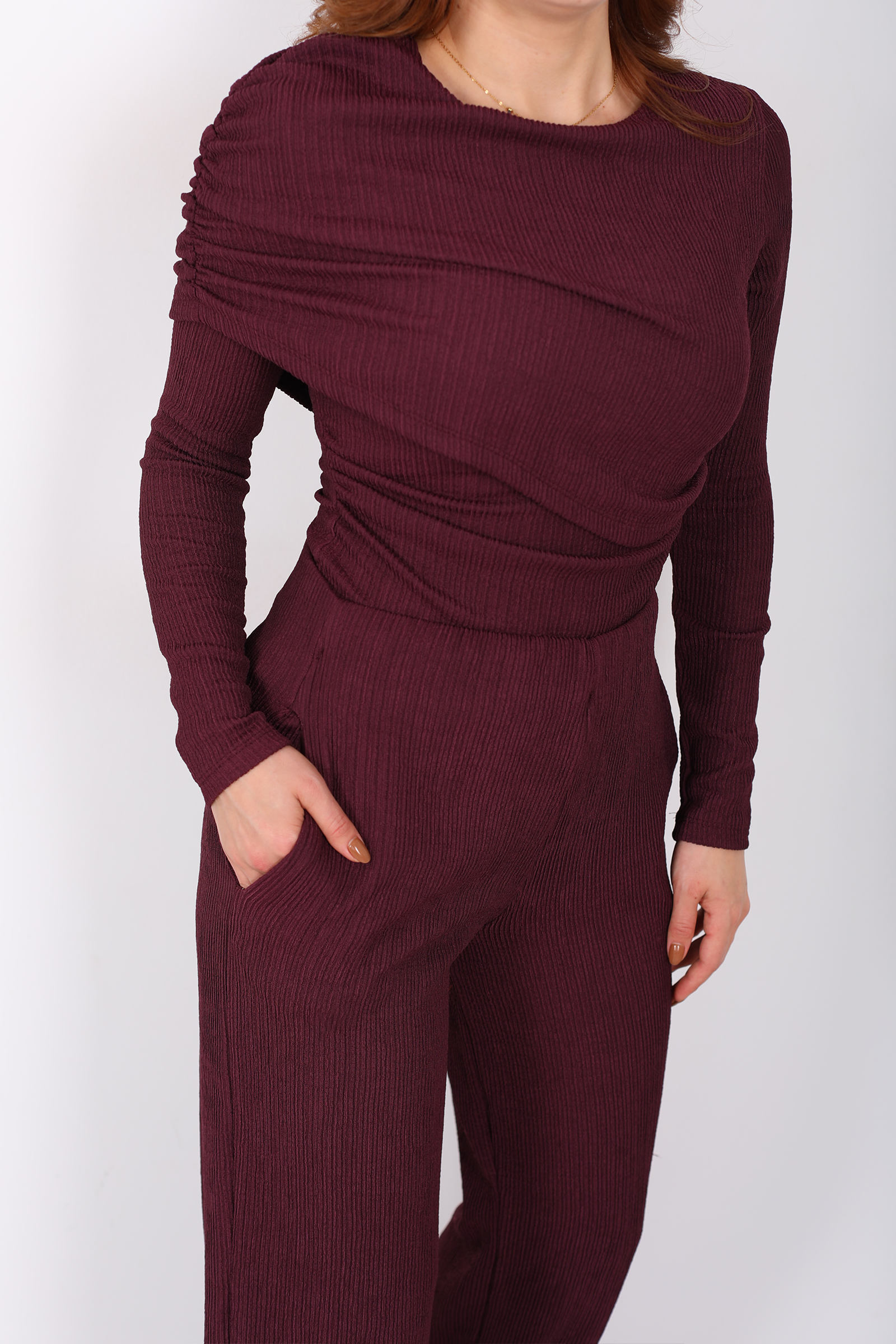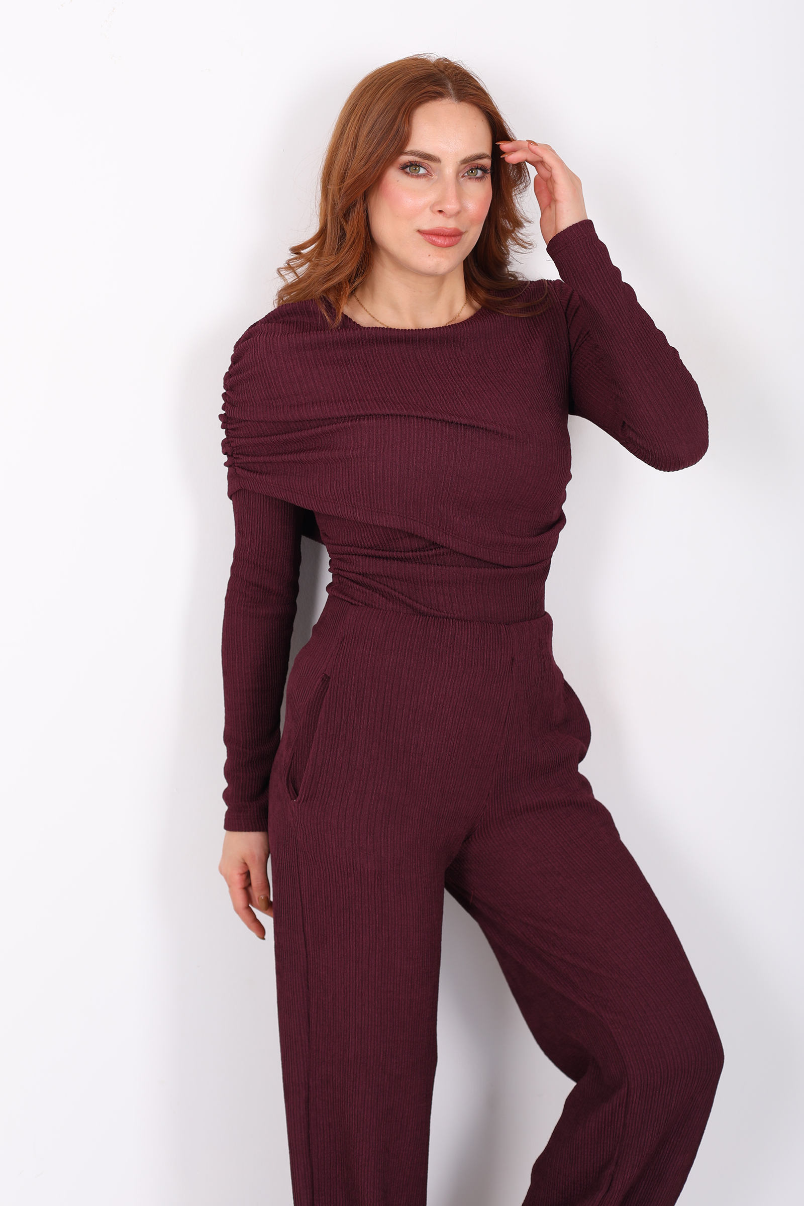 Yaka Detaylı Büzgülü Mürdüm Kadın Fitilli Takım