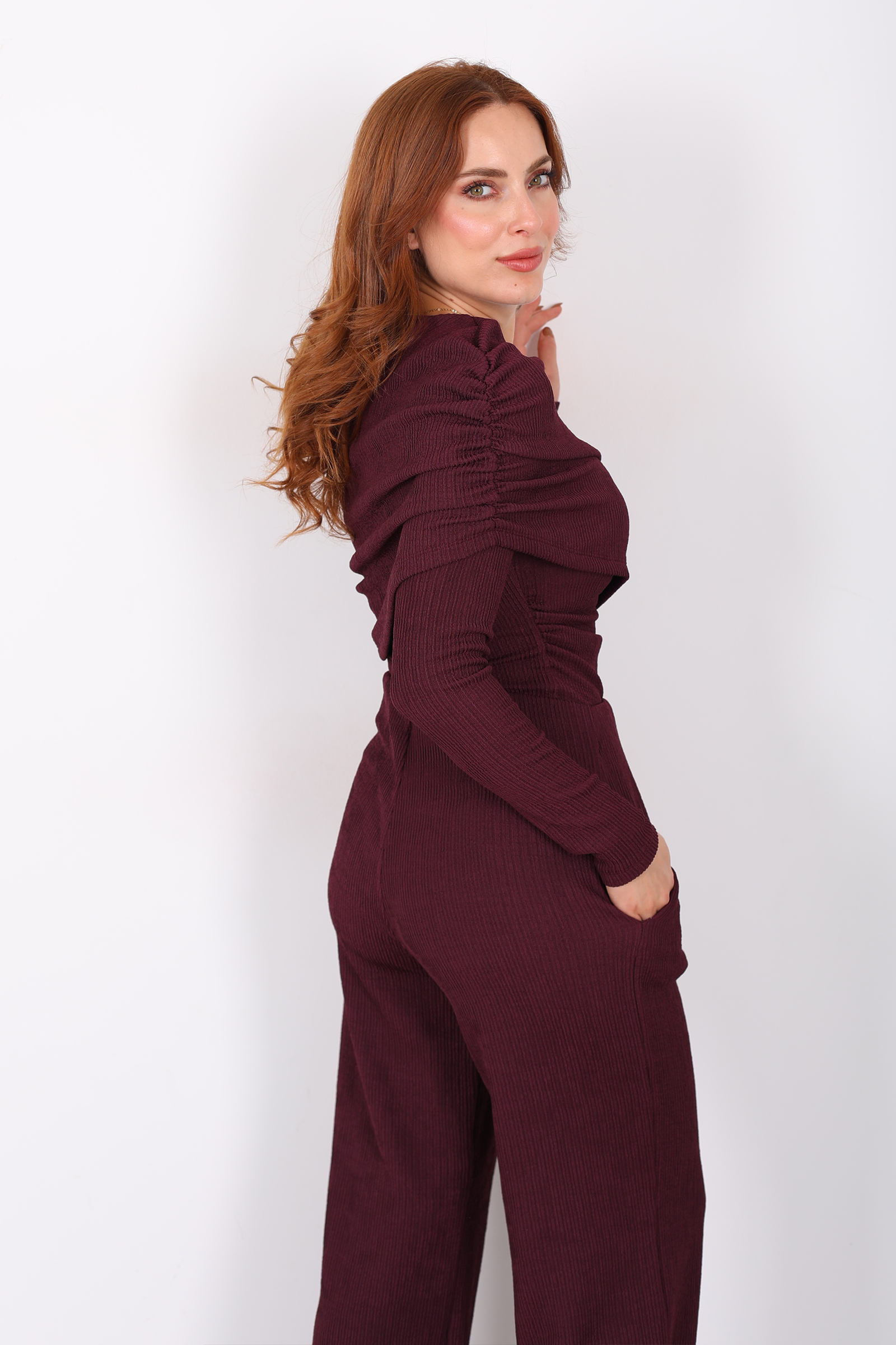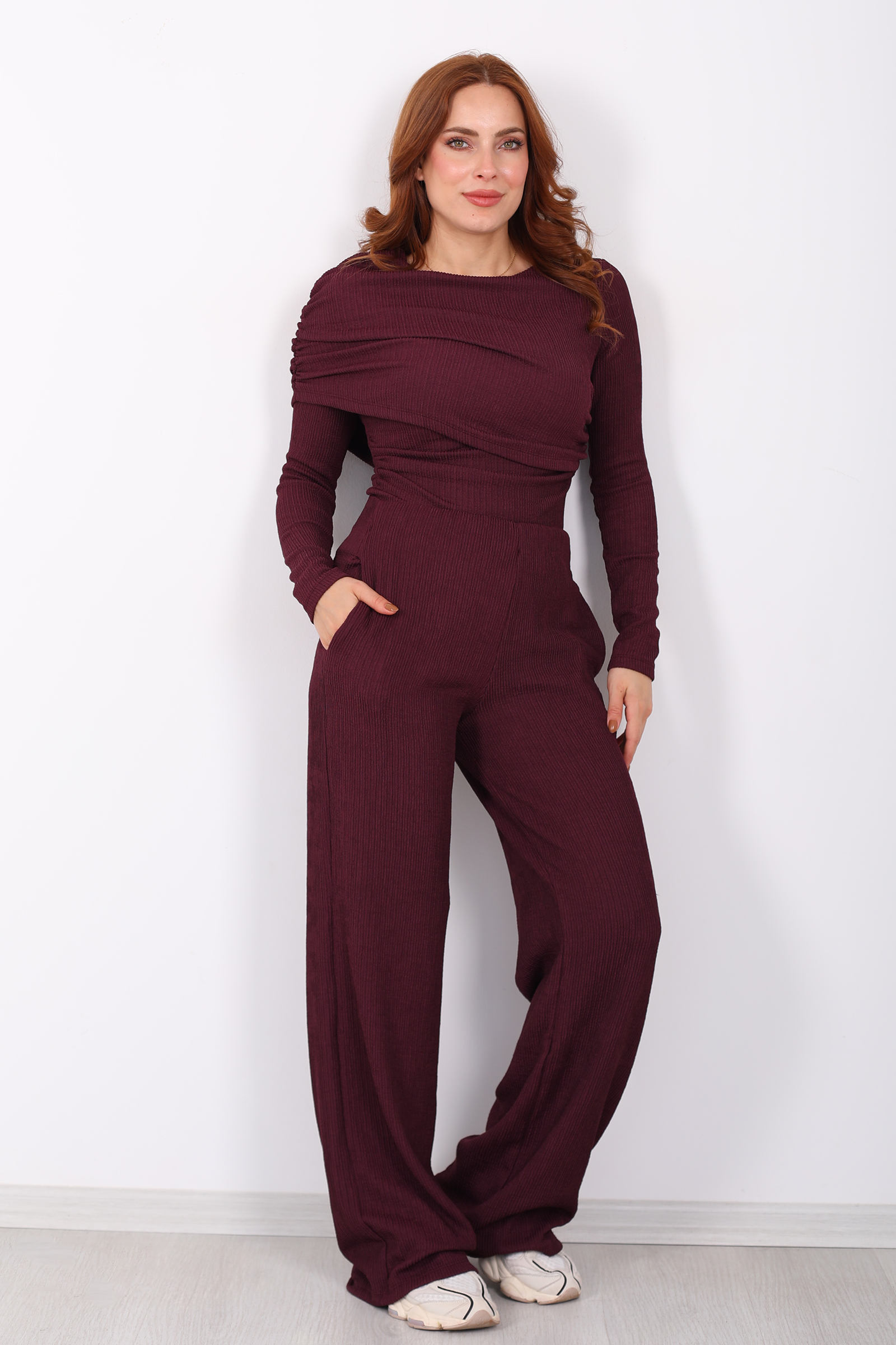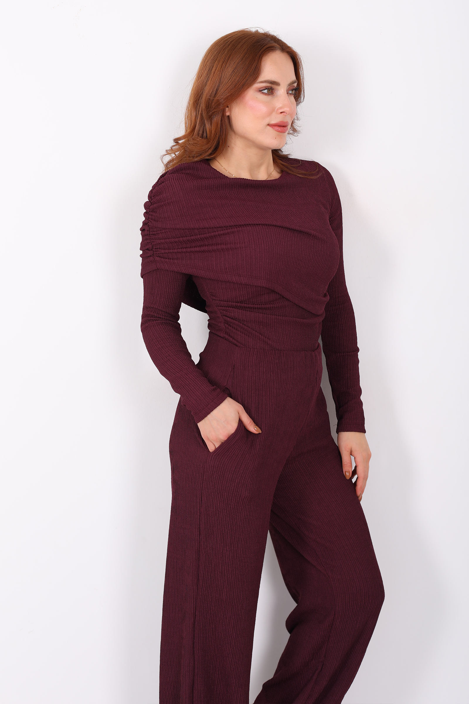 Yaka Detaylı Büzgülü Mürdüm Kadın Fitilli Takım