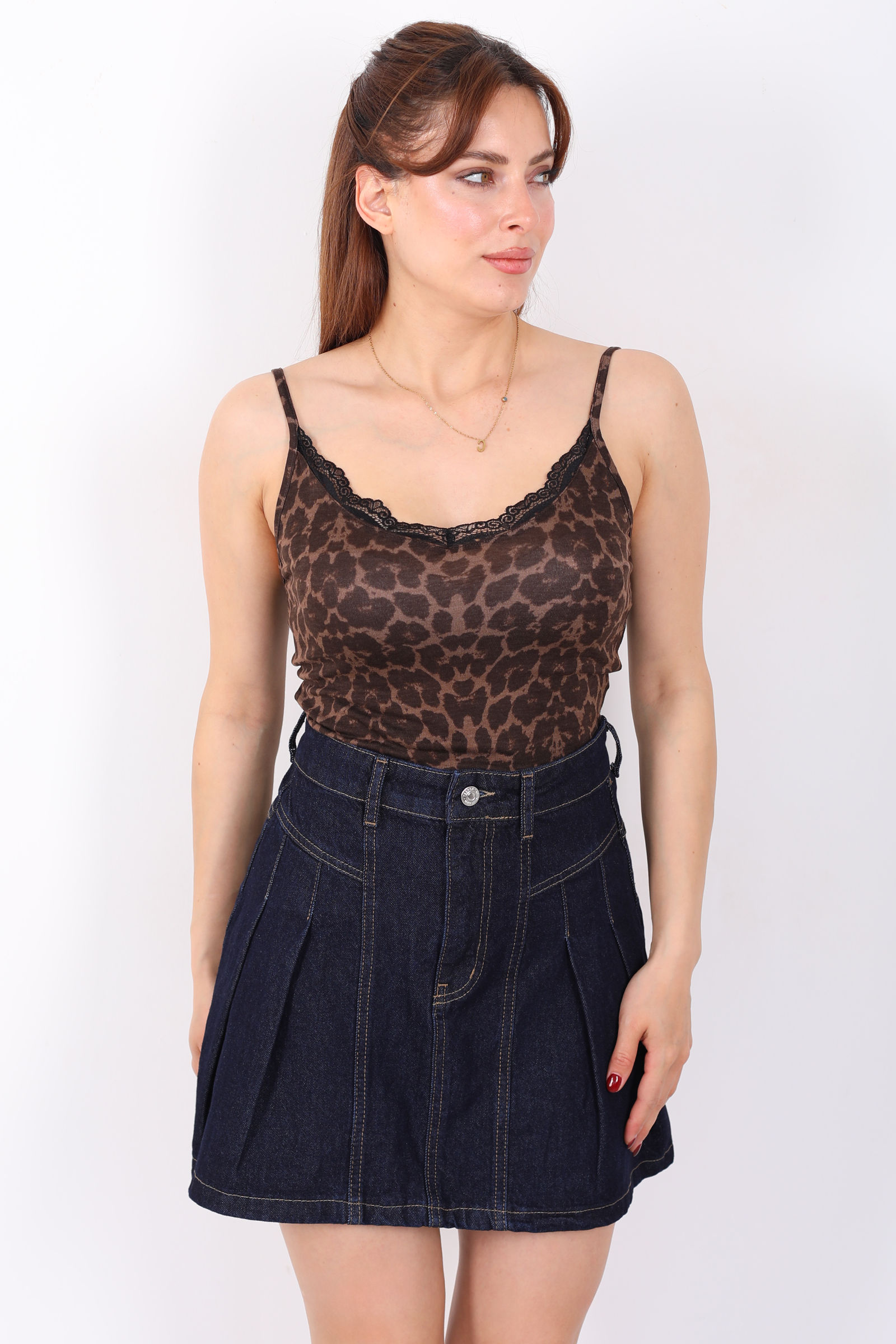 Yaka Güpürlü Askılı Kadın Leopar Bluz