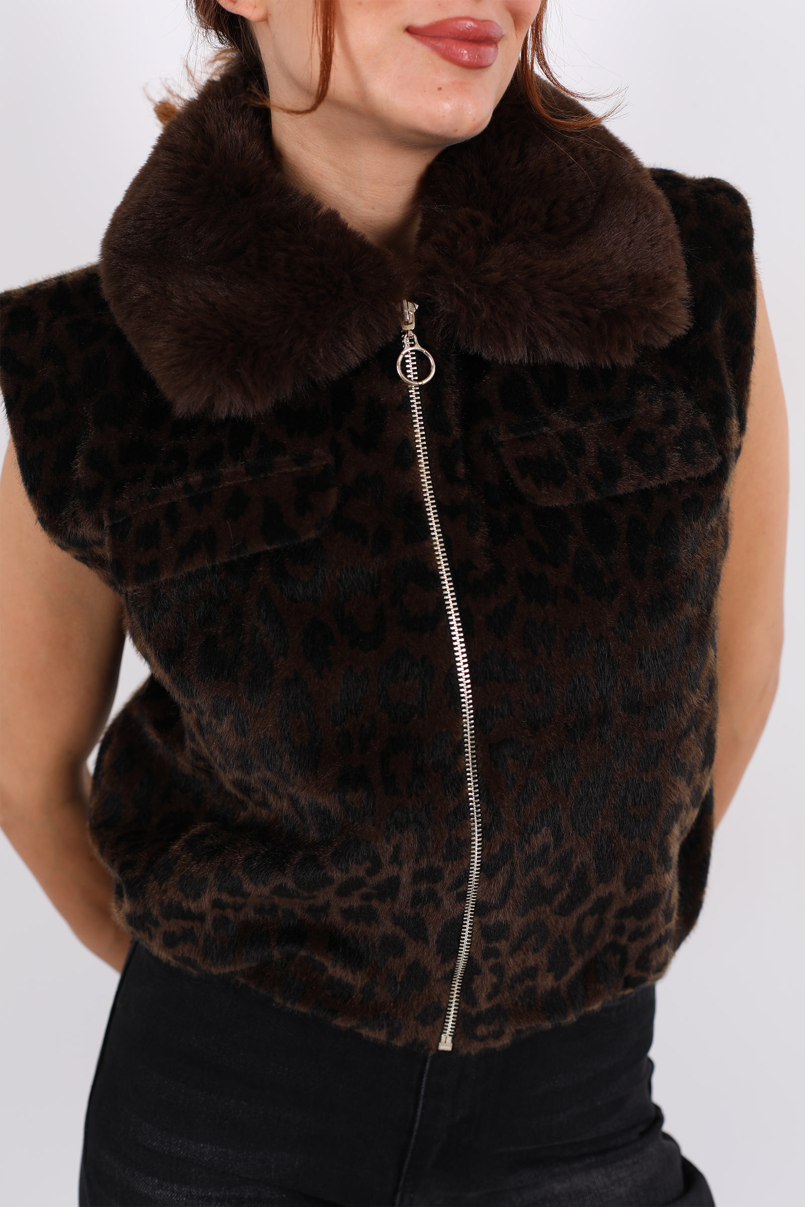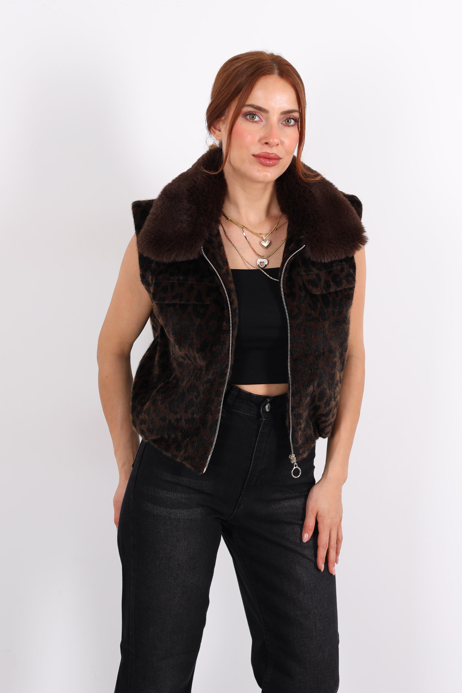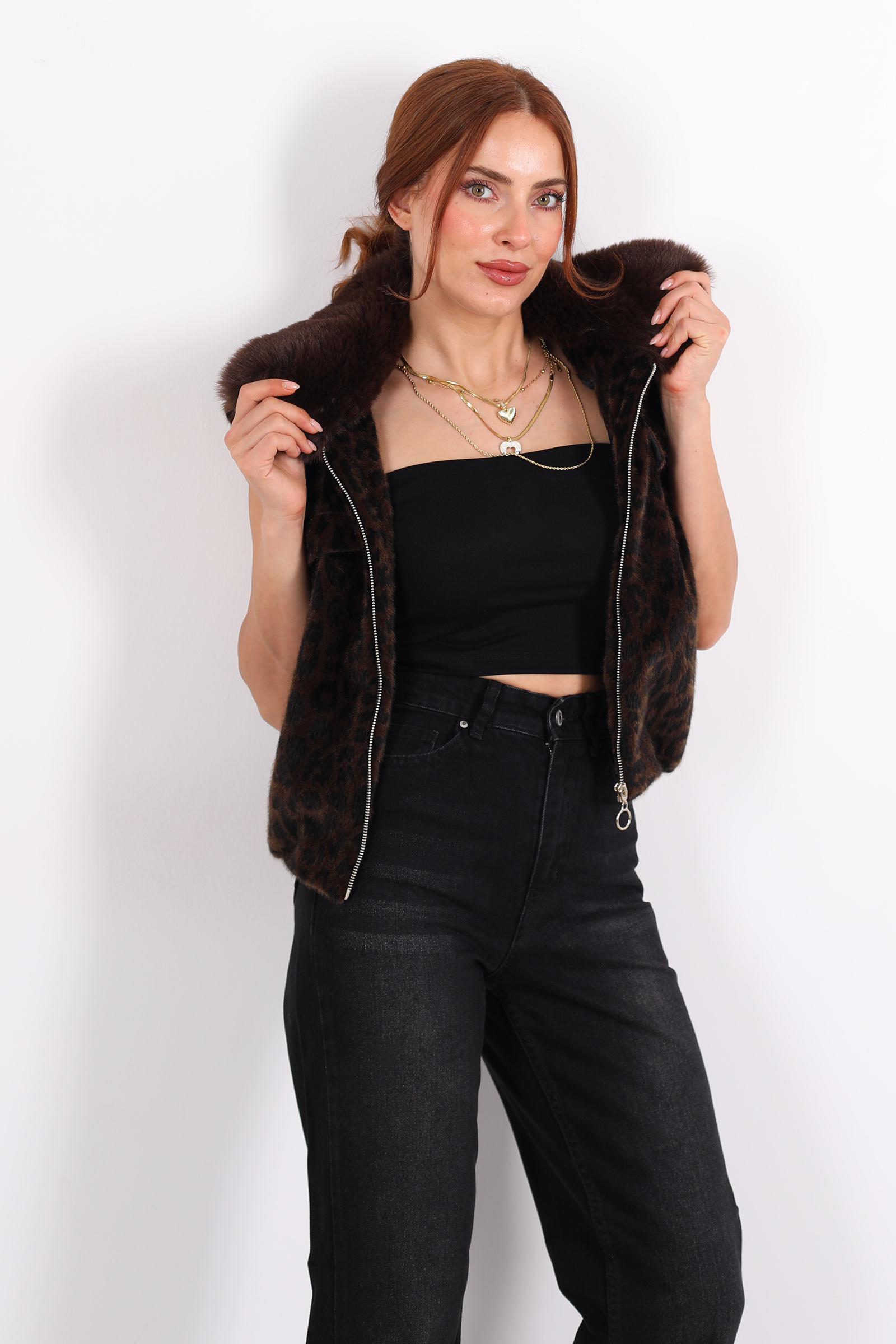 Leopar deseninin sıcak açık kahve tonuyla buluştuğu bu yelek, kurklu yaka ve fermuar detaylarıyla stilinize güçlü bir karakter katıyor. Kurklu yaka tasarımı, hem koruyucu bir hava yaratır hem de boyun çizginizi zarifçe çerçeveler. Fermuar kapama ise pratiklik sağlarken sportif bir dokunuş sunar.Kalıp olarak yelek, modern ve hafif yapılandırılmış bir formda tasarlanmış ne çok dar ne çok bol bir siluet sunar.