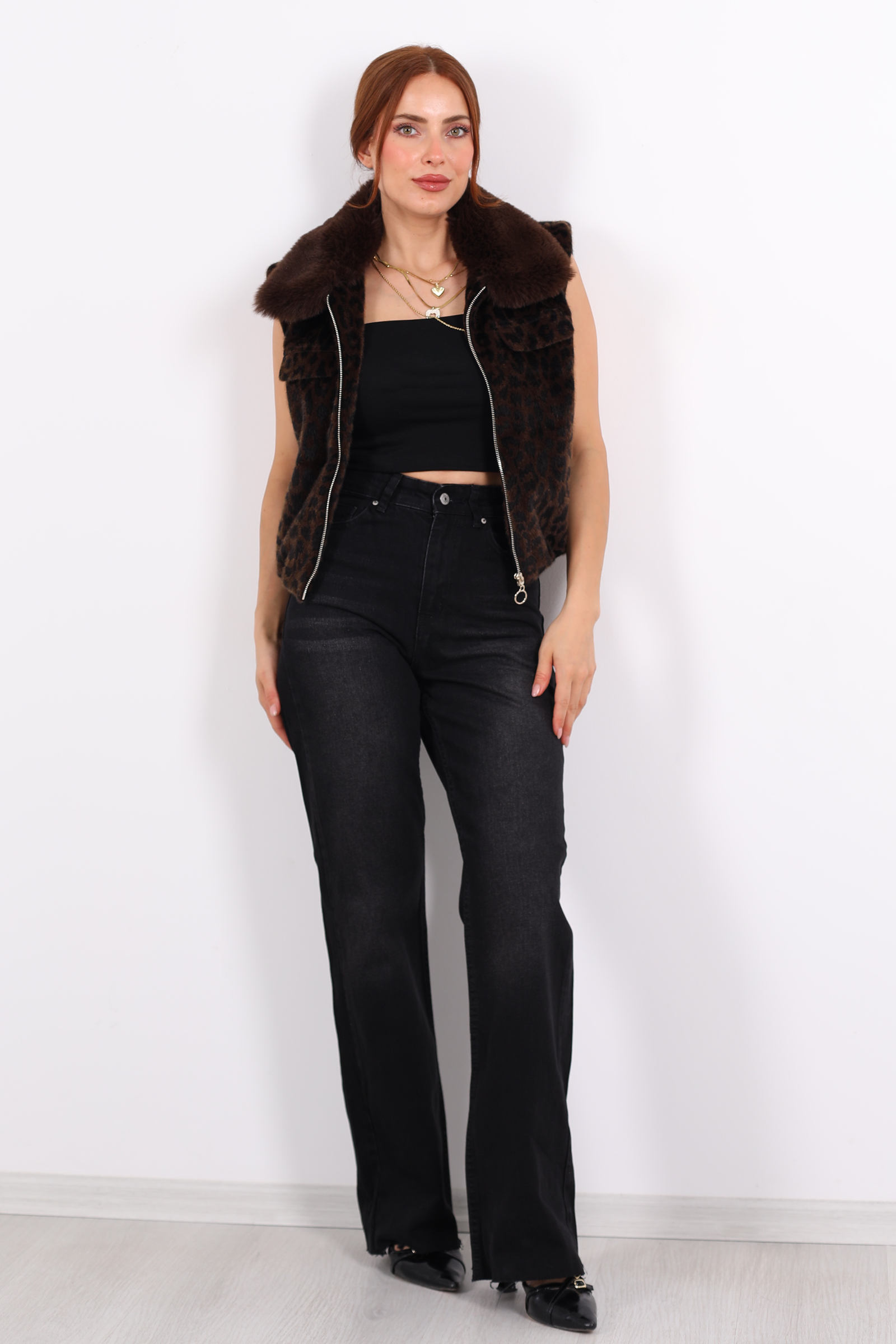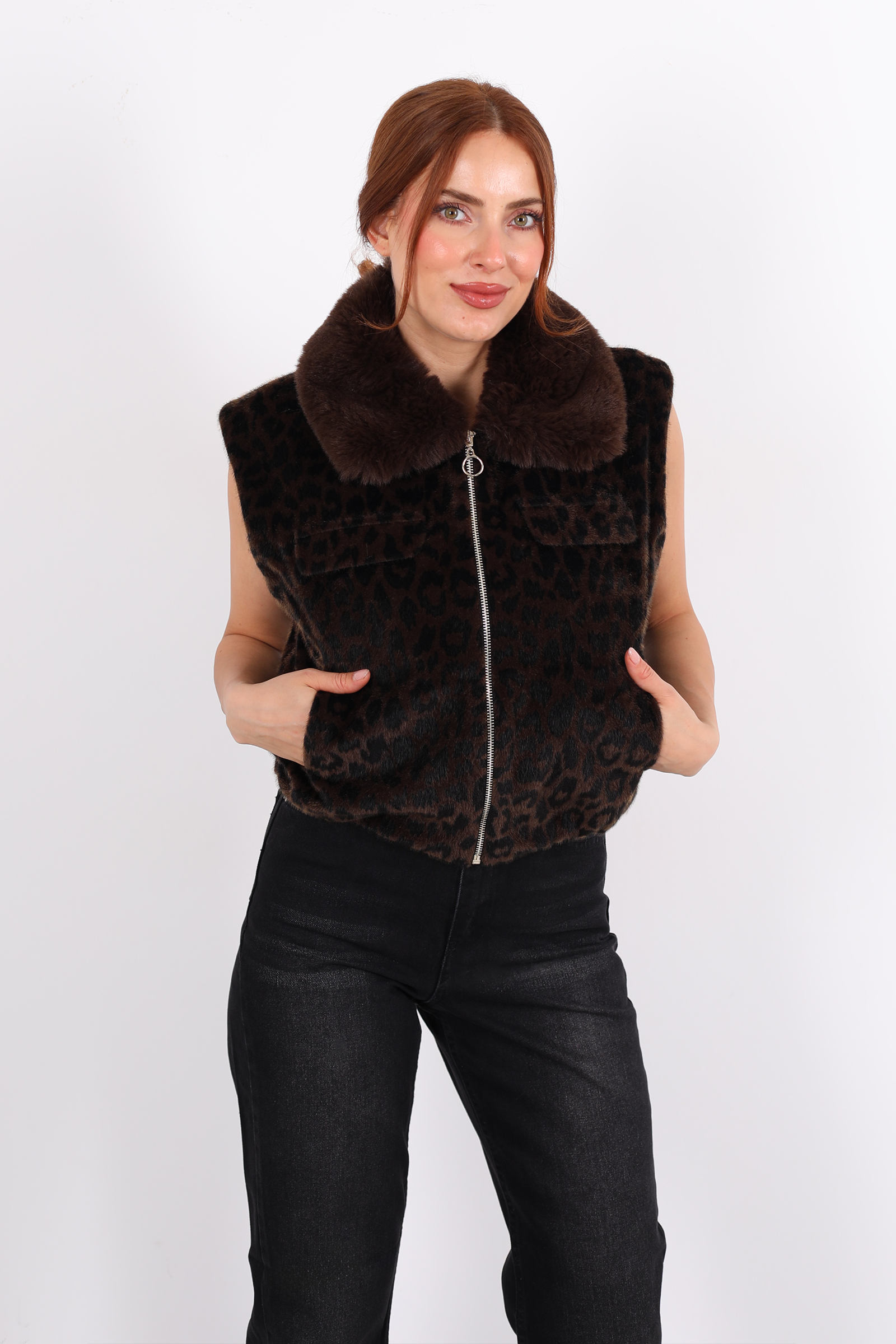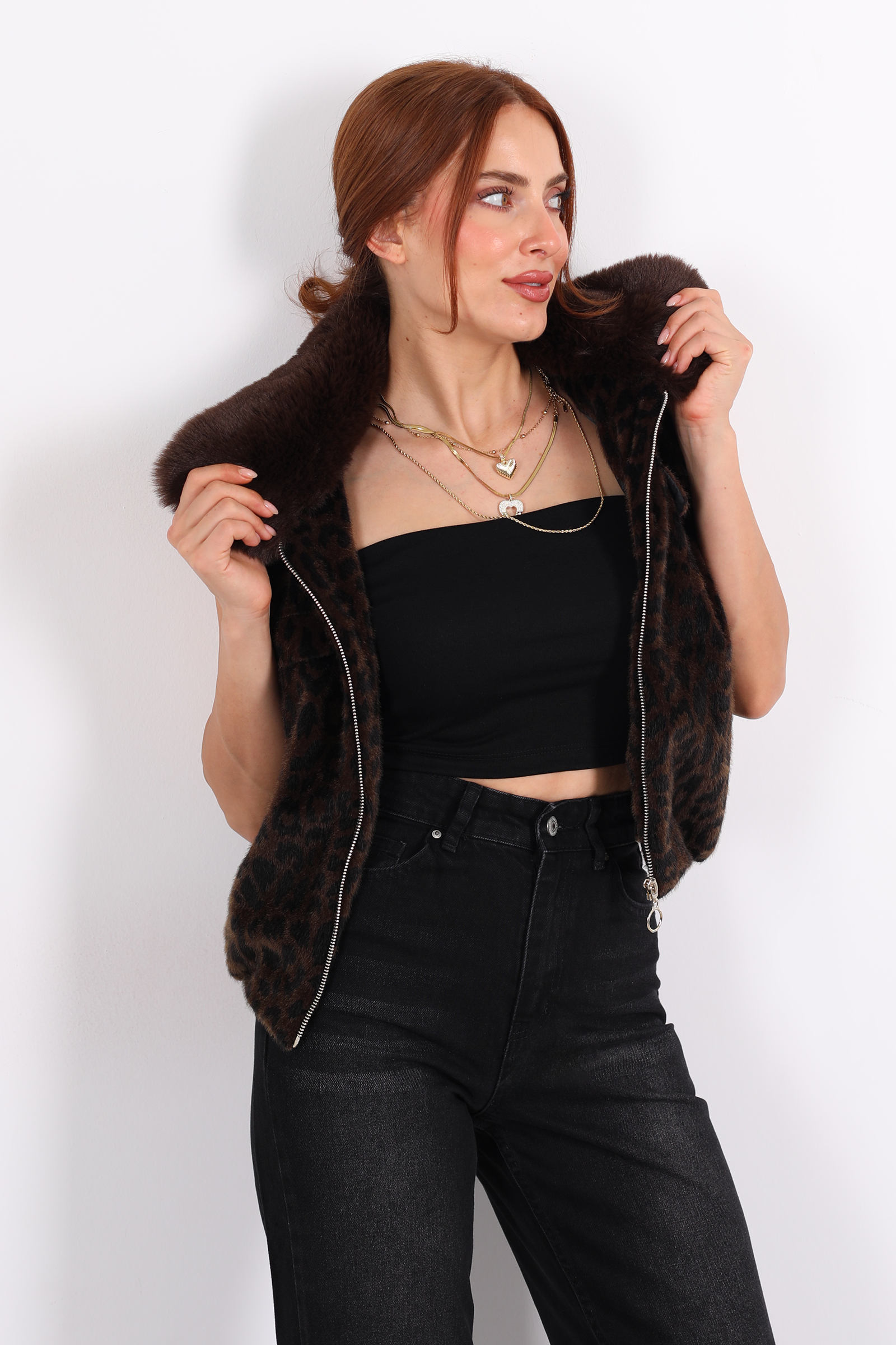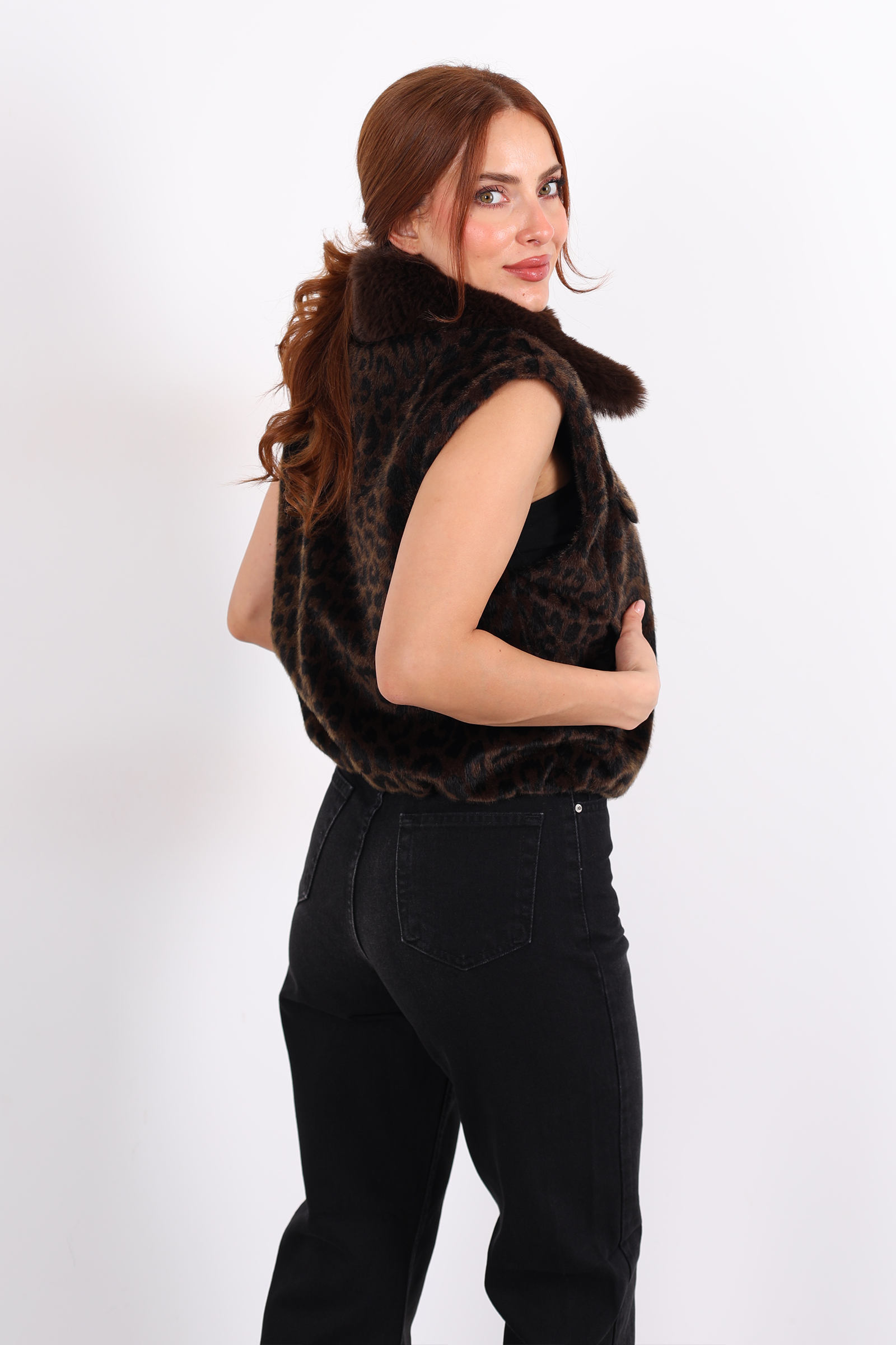Leopar deseninin sıcak açık kahve tonuyla buluştuğu bu yelek, kurklu yaka ve fermuar detaylarıyla stilinize güçlü bir karakter katıyor. Kurklu yaka tasarımı, hem koruyucu bir hava yaratır hem de boyun çizginizi zarifçe çerçeveler. Fermuar kapama ise pratiklik sağlarken sportif bir dokunuş sunar.Kalıp olarak yelek, modern ve hafif yapılandırılmış bir formda tasarlanmış ne çok dar ne çok bol bir siluet sunar.