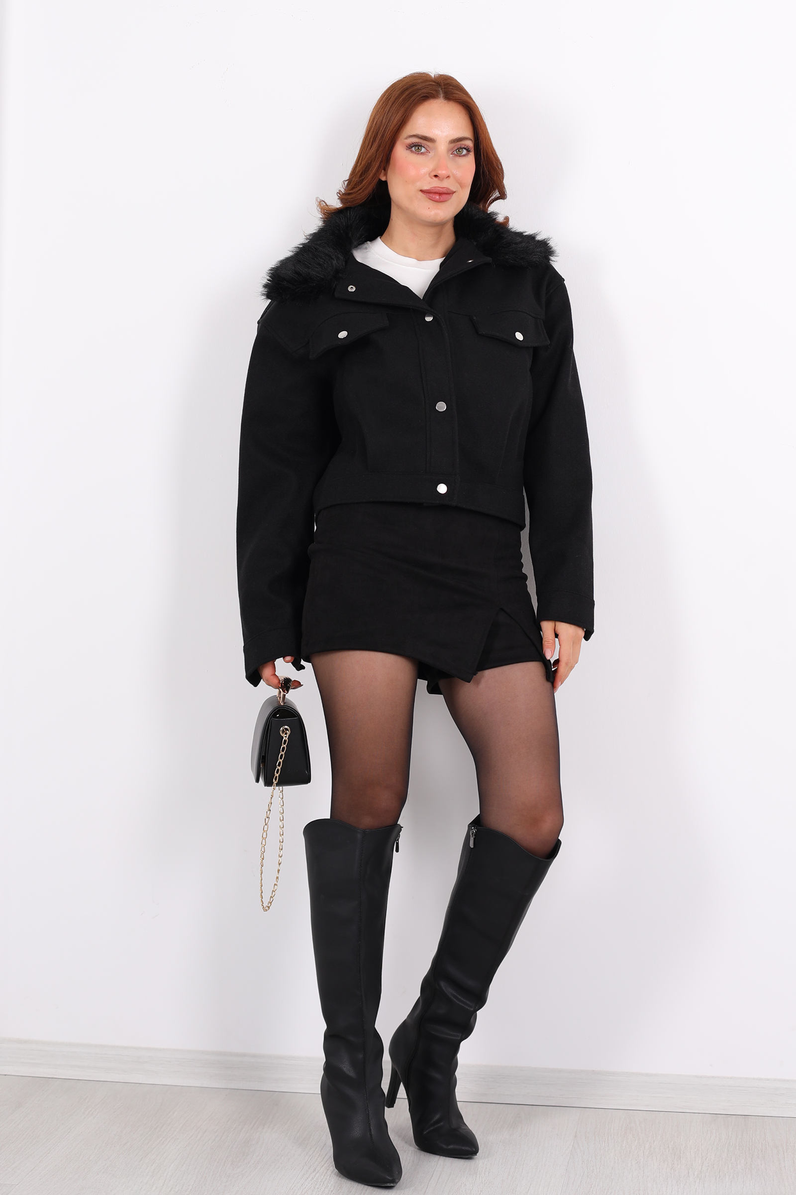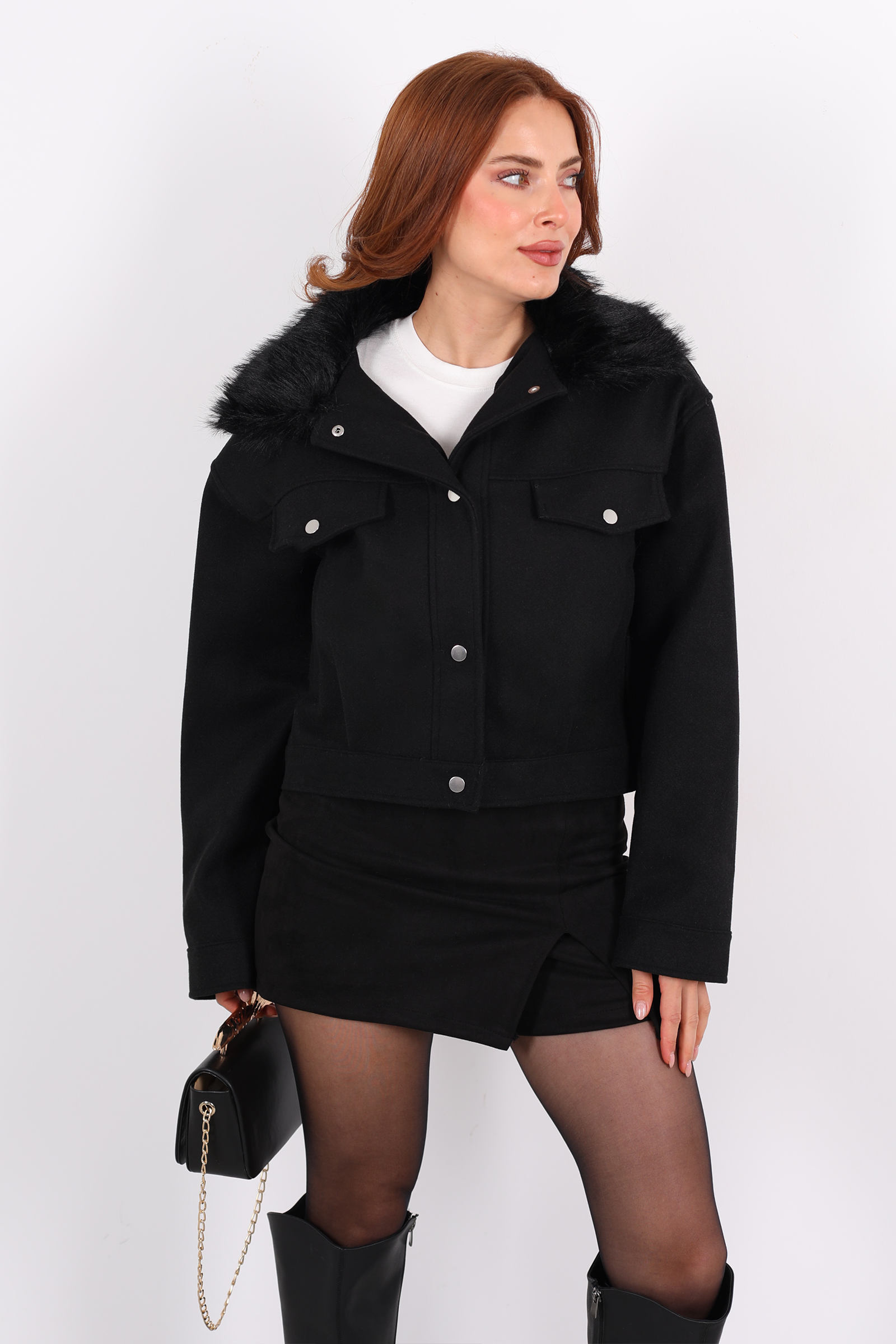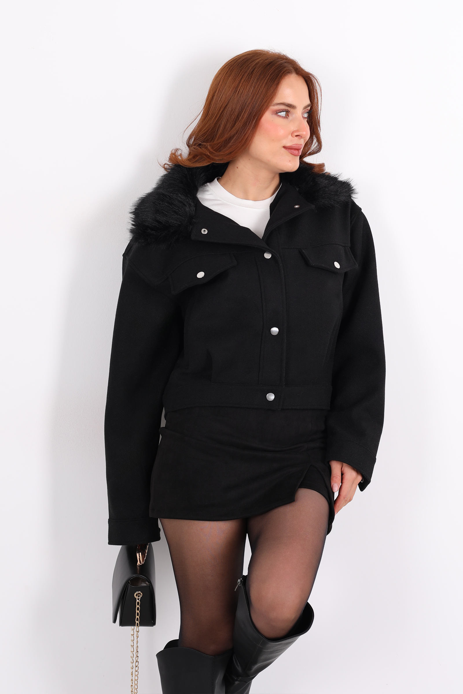 Karanlıkta parlayan bir şehir ışığı kadar zarif ve güçlü bu siyah kaşe kaban, kısa kesimiyle dinamik, kürklü yakasıyla ise lüks bir dokunuş sunuyor. Soğuk havalarda konforunuzu korurken, stilinizden ödün vermemenizi sağlayan bu parça, günlük yaşamın ritmine mükemmel uyum sağlar.
