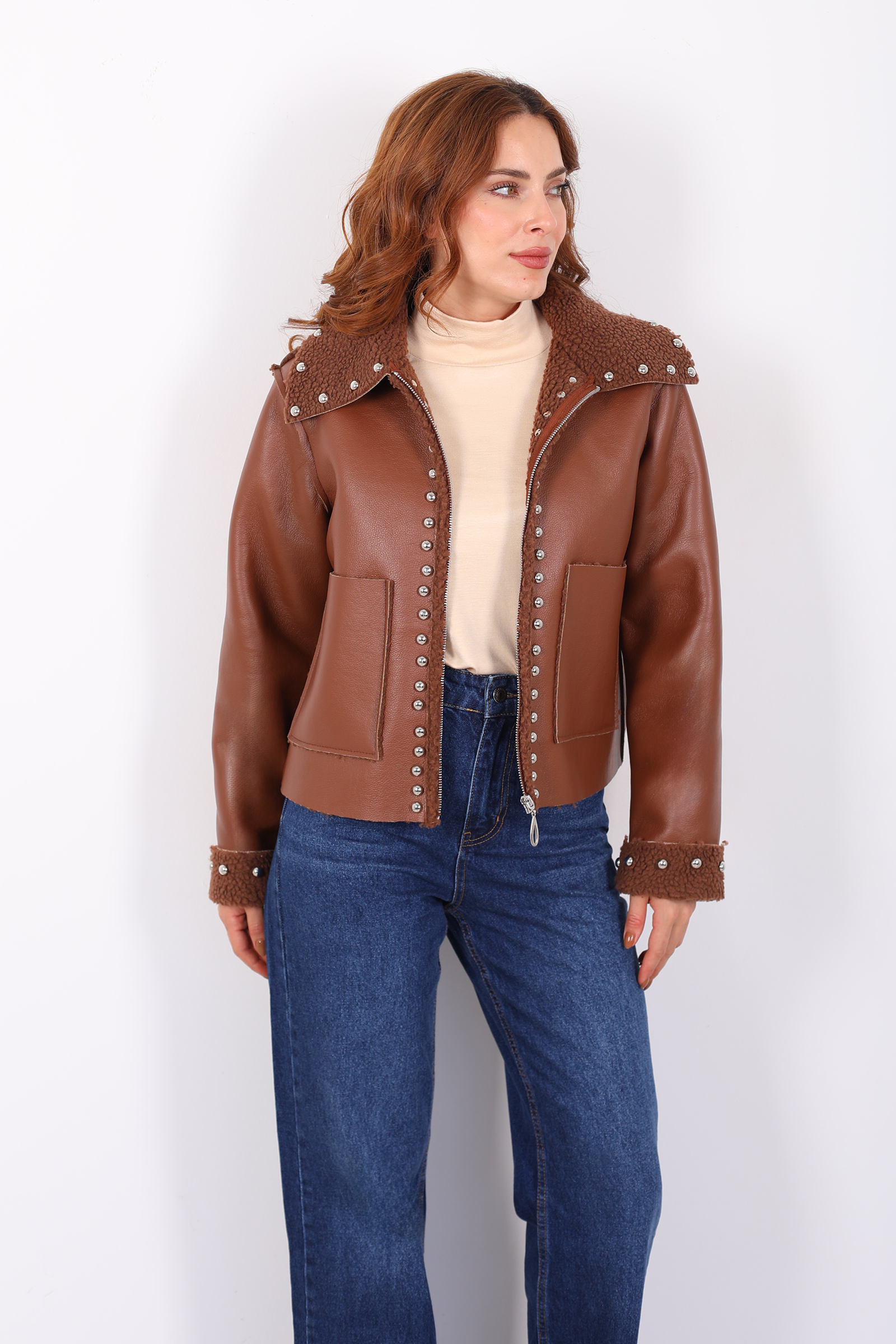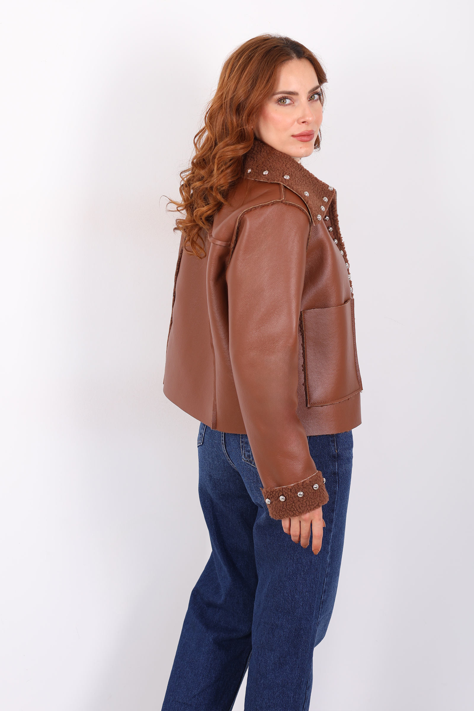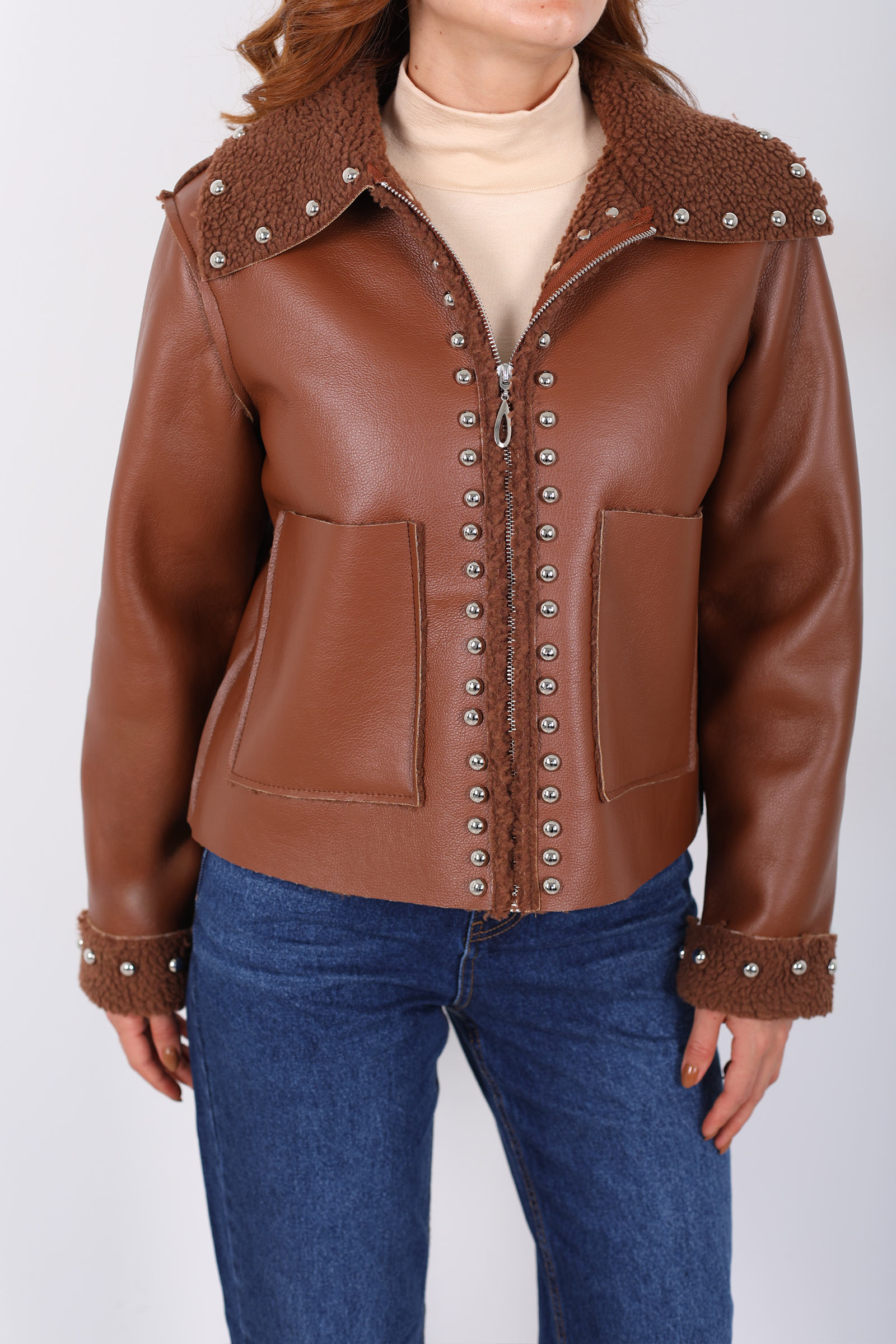 Yaka Kürklü Zımbalı Kahverengi Kadın Deri Mont