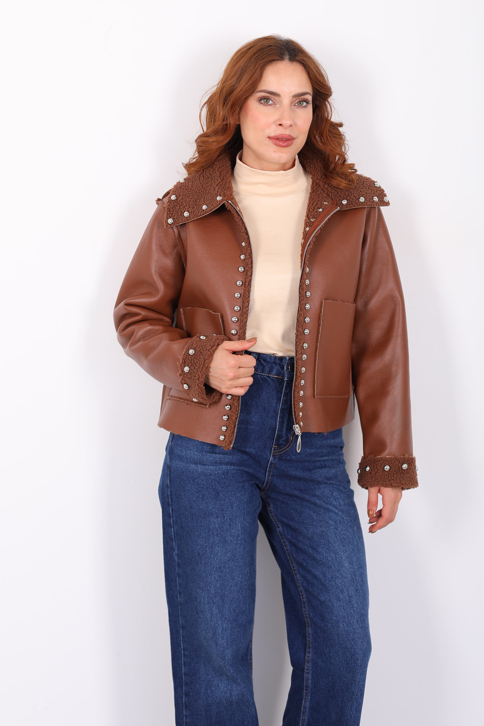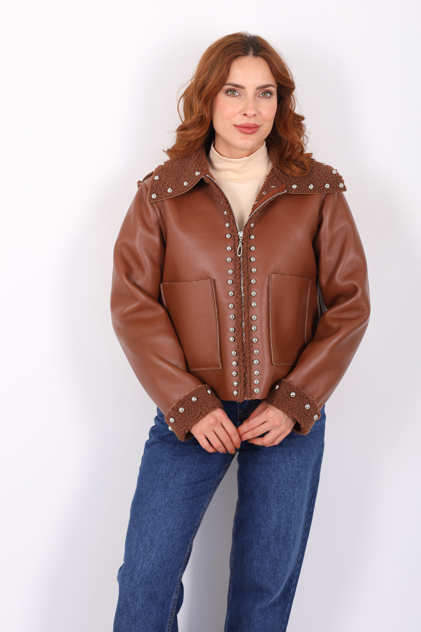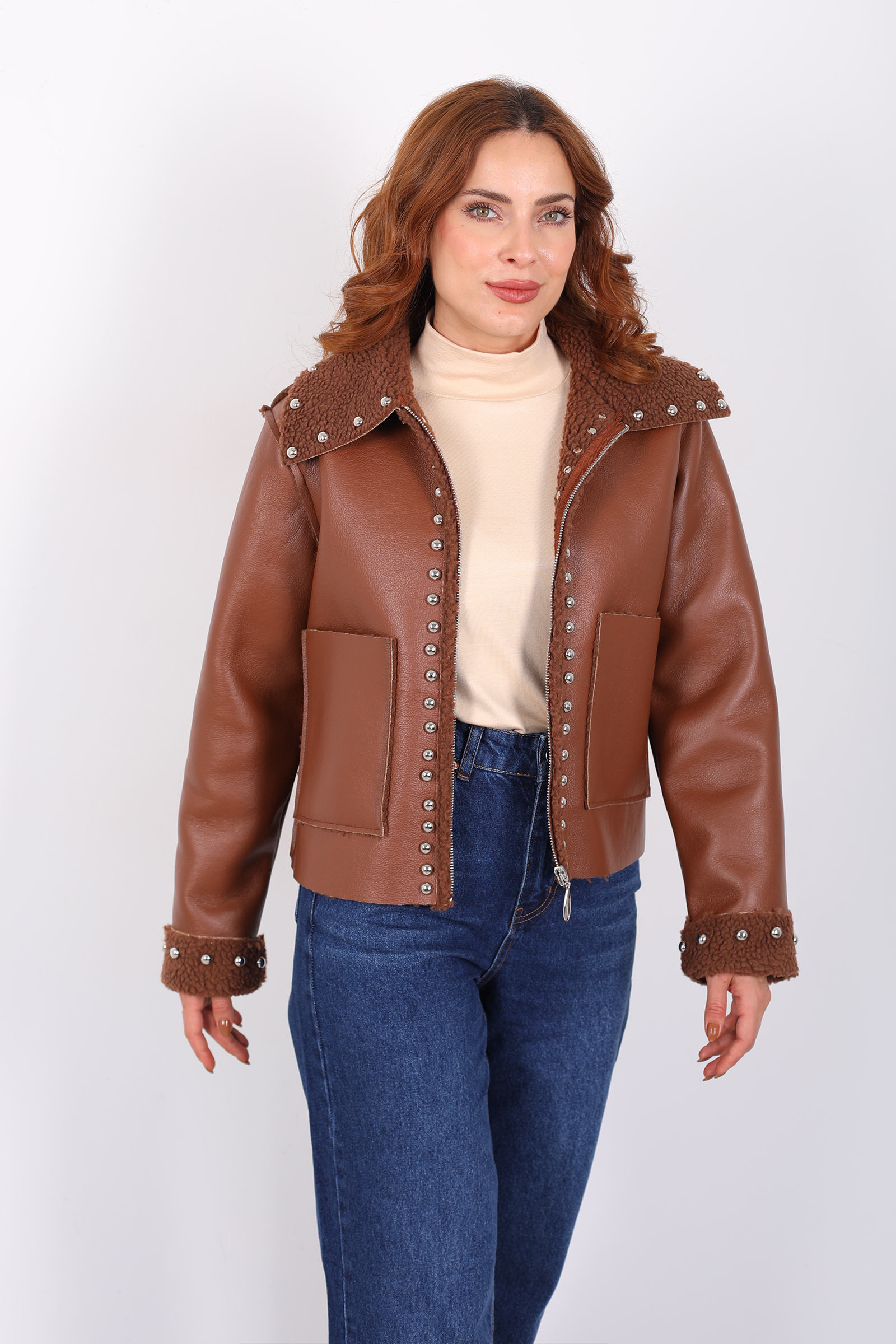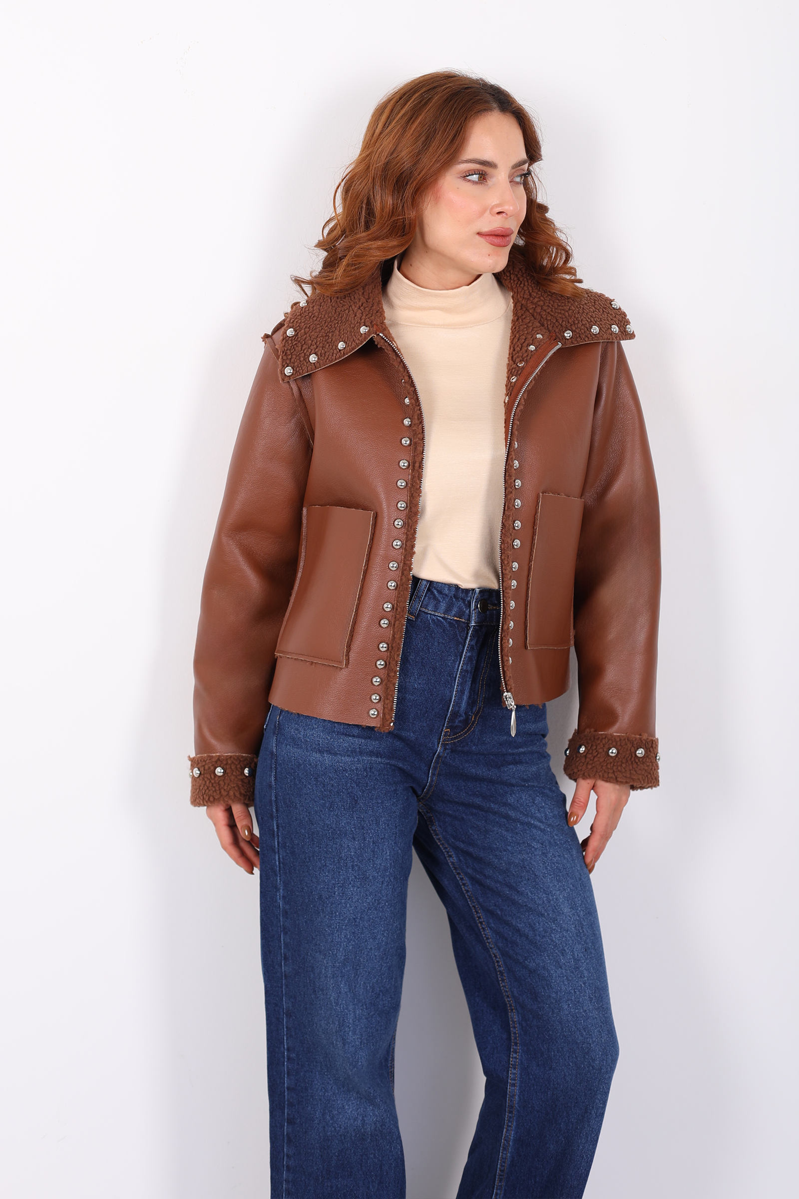 Yaka Kürklü Zımbalı Kahverengi Kadın Deri Mont