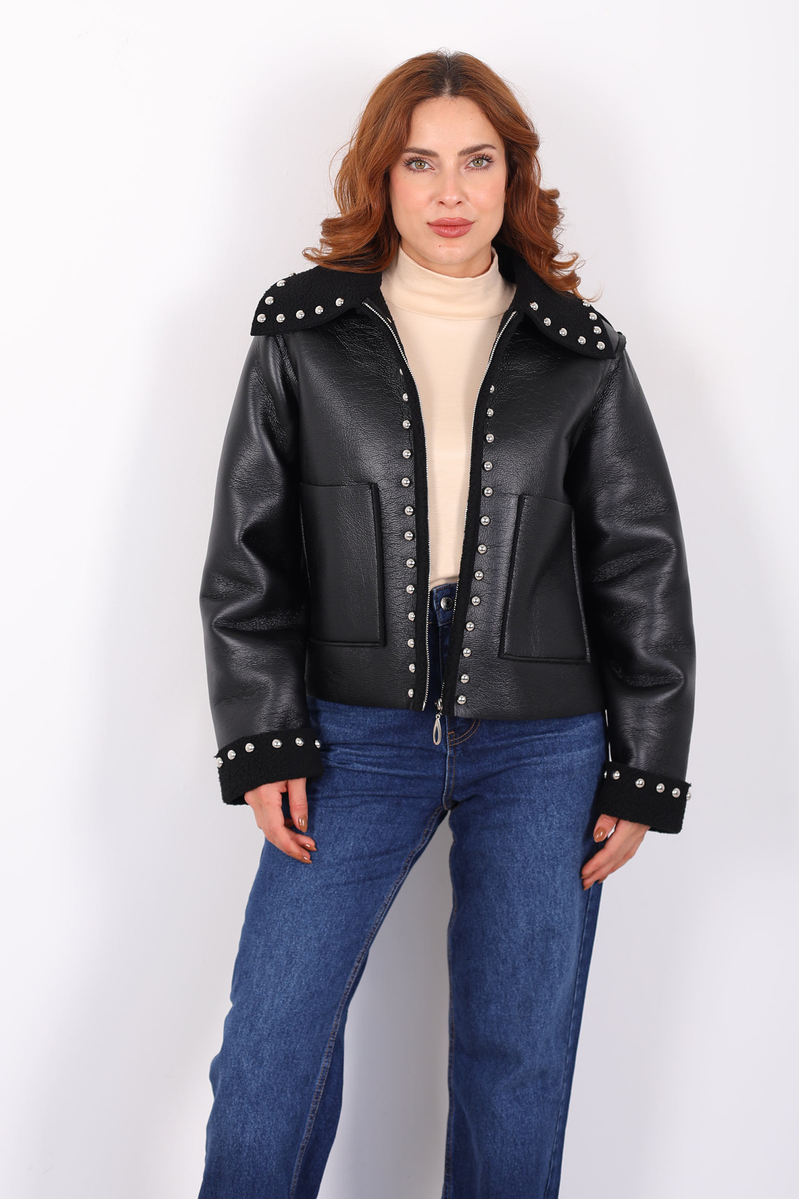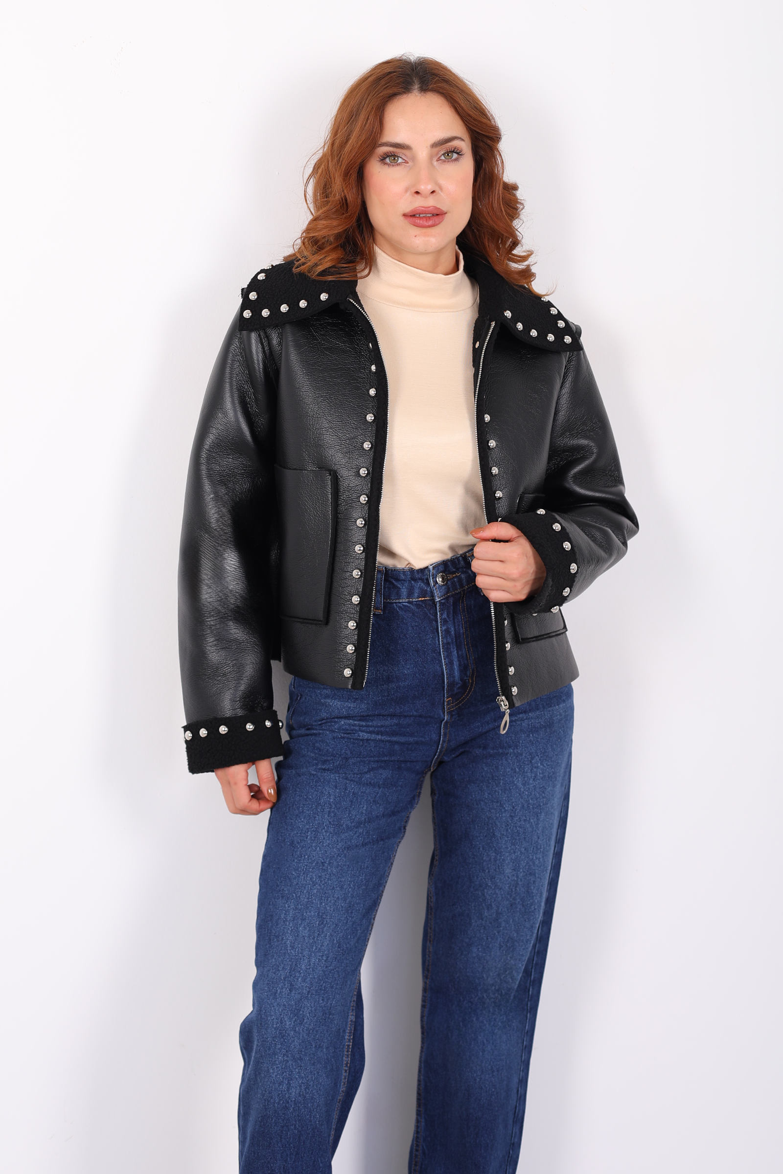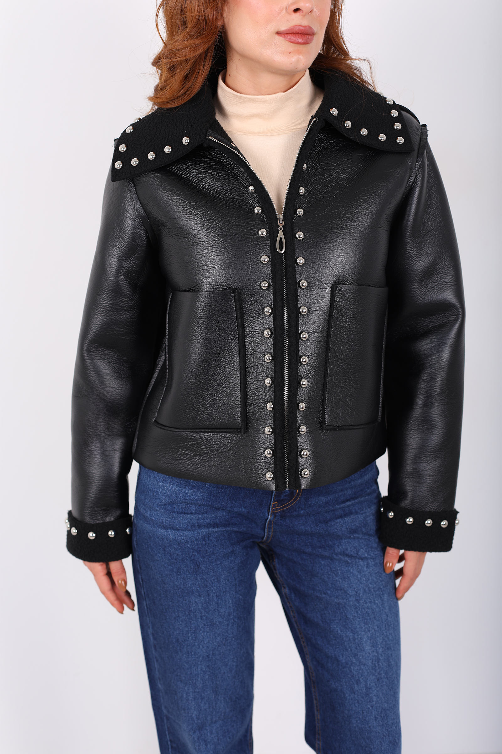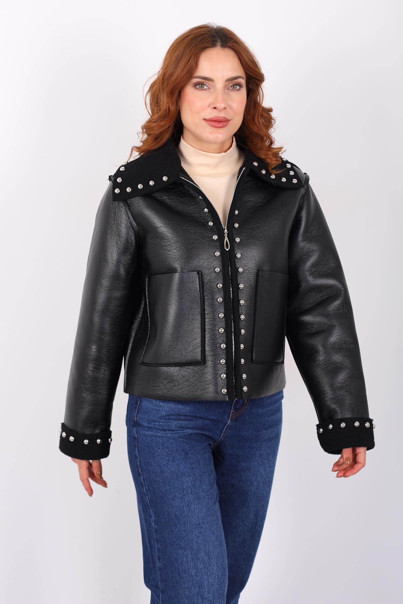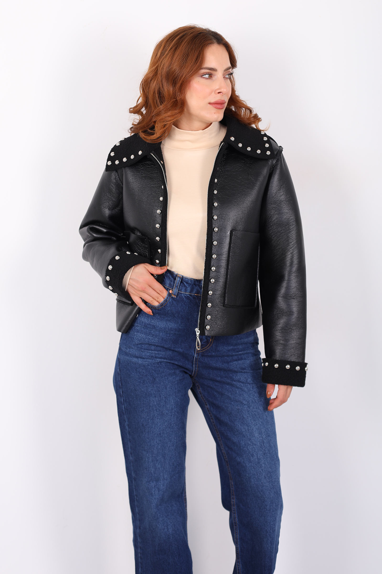 Yaka Kürklü Zımbalı Siyah Kadın Deri Mont