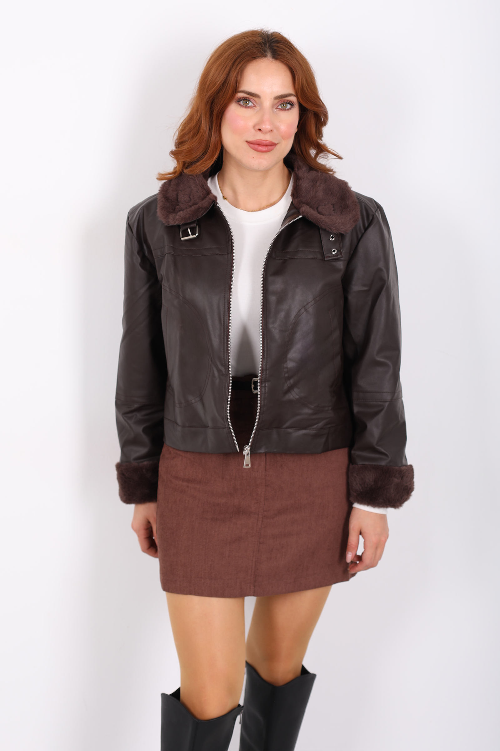 İçi Kürklü Yaka Tokalı Acı Kahve Kadın Deri Ceket