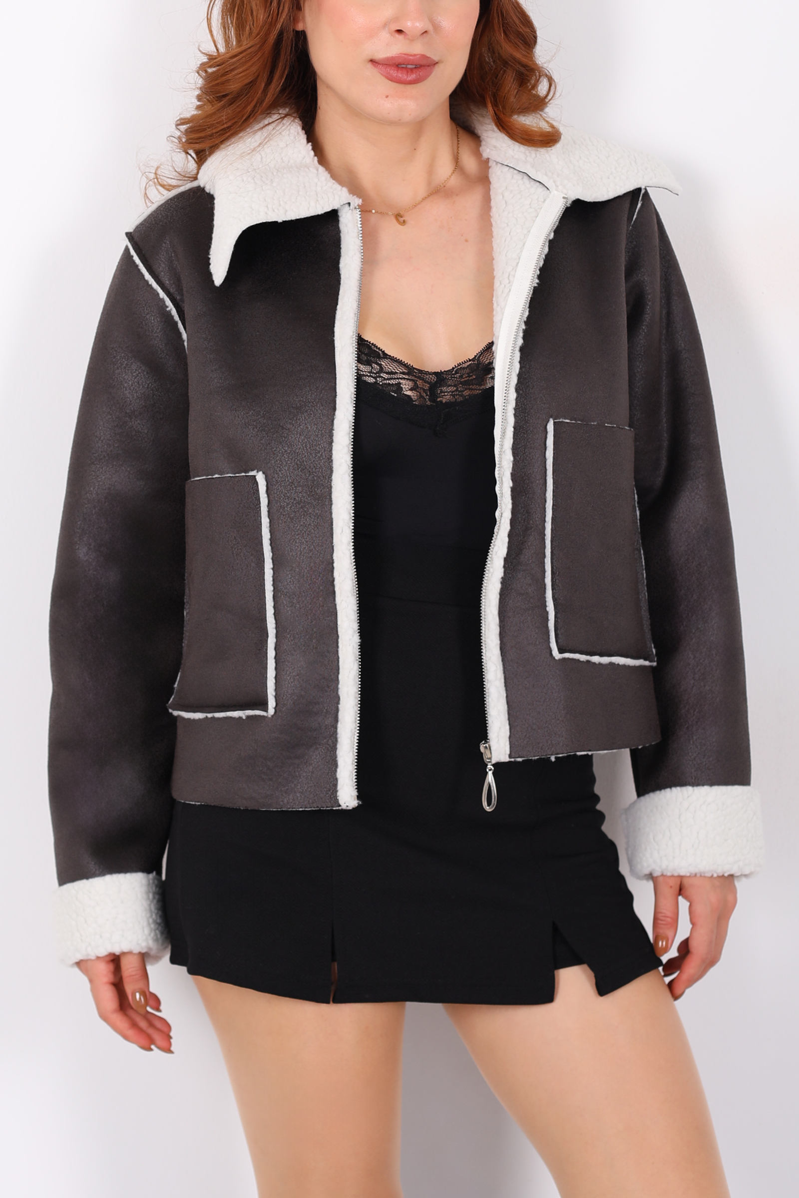 Yaka Ve Kol Kürk Detaylı Antrasit Kadın Süet Mont