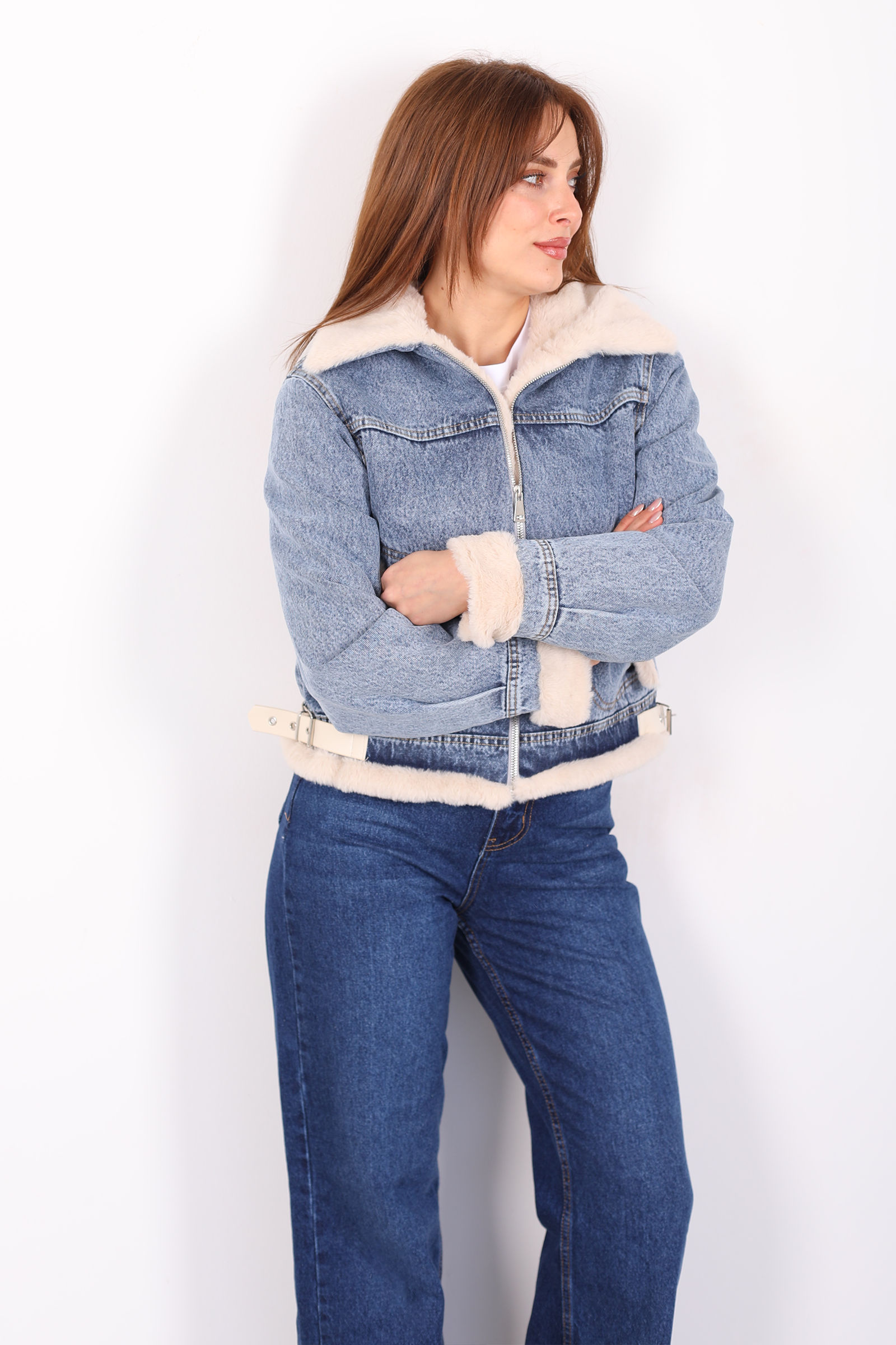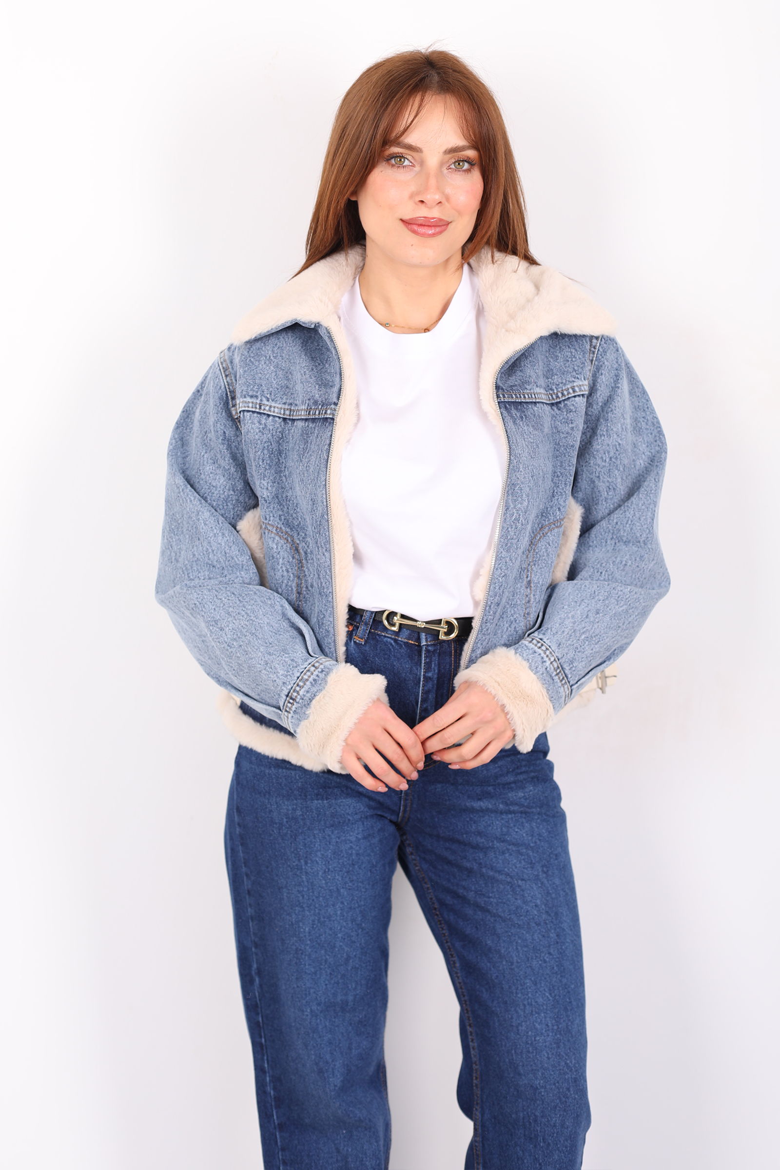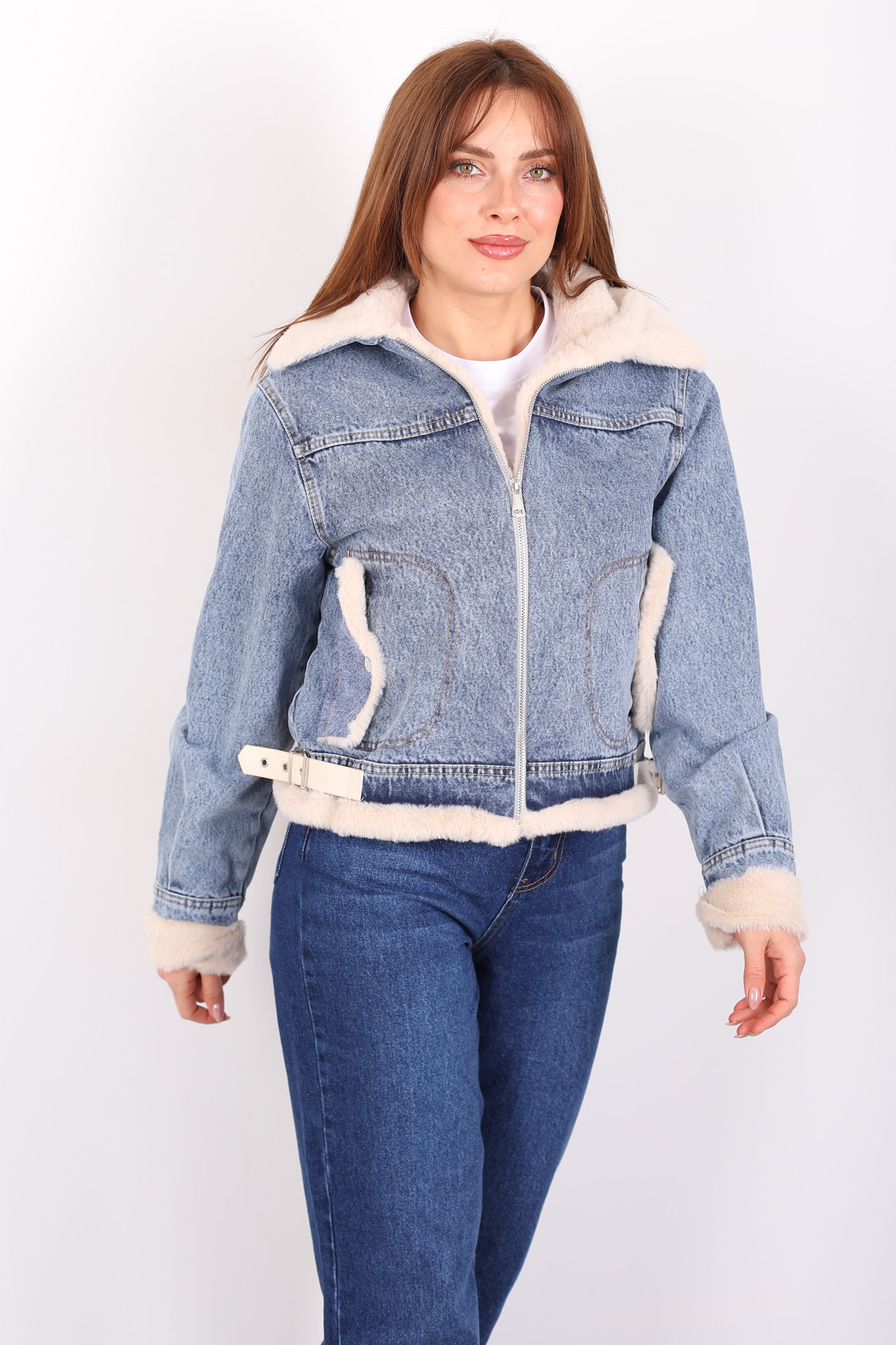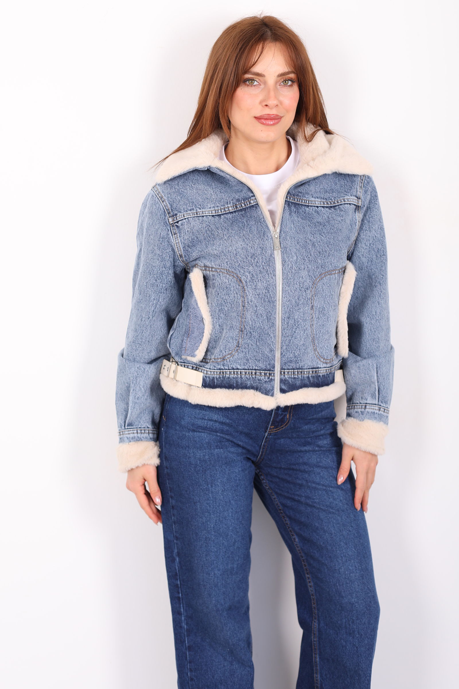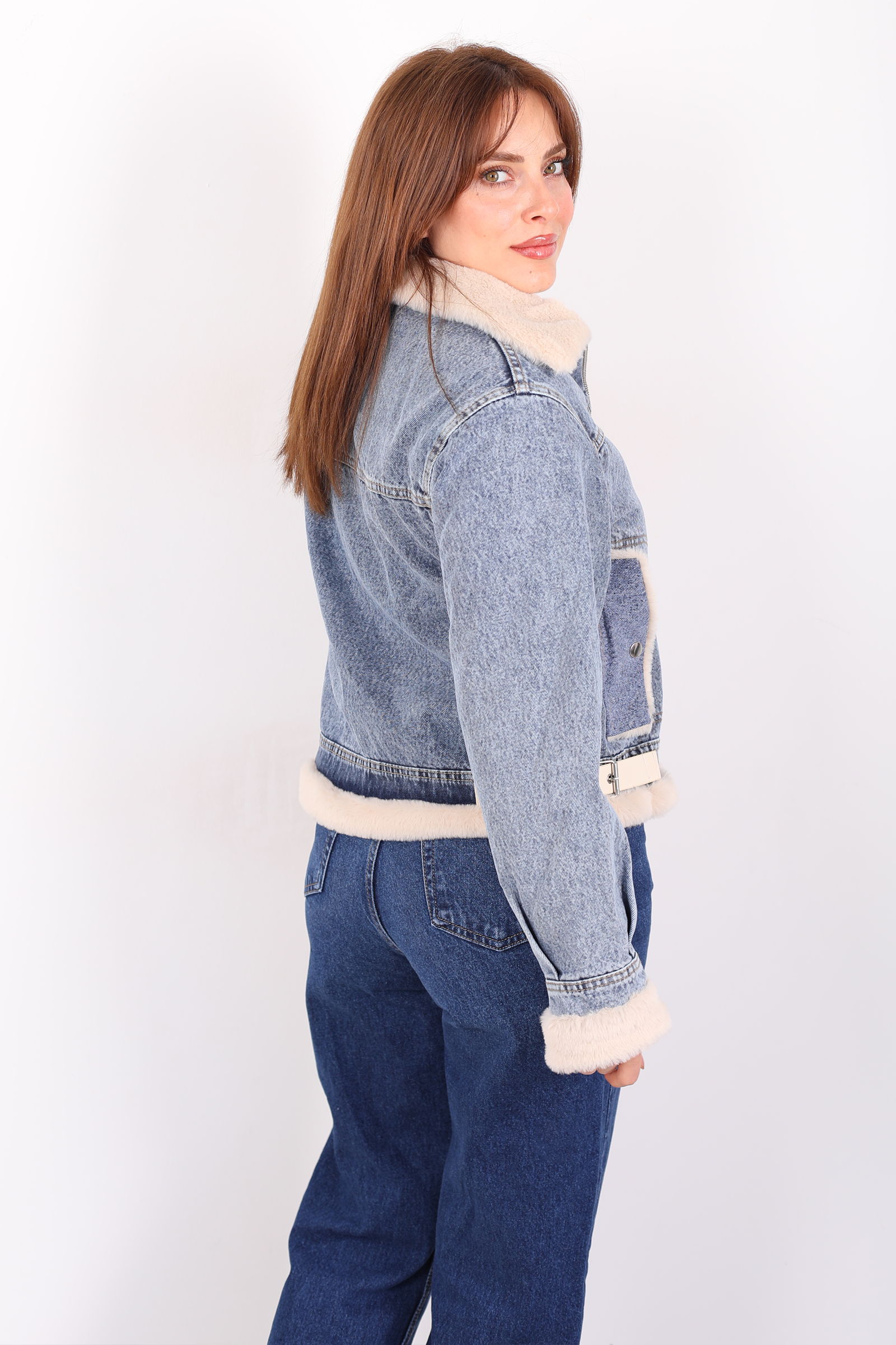 Mavi kot ceket, yaka ve kol kısmındaki şık kürk detaylarıyla sofistike bir dokunuş sunar. Yanındaki kemer, belinizi zarif bir şekilde vurgularken, modern kesimiyle şıklığı ve rahatlığı birleştirir. Bu ceket, soğuk günlerde hem sıcak tutar hem de stilinizi ön plana çıkarır. Yumuşak kot kumaşı, klasik bir görünüm sunarken, kürk detayları ceket tasarımını zarif bir şekilde tamamlar. Hem gündüz hem de akşam kombinlerinde kullanabileceğiniz bu ceket, denim veya elbise ile mükemmel uyum sağlar. Hem şık hem de konforlu bir dış giyim parçası arayanlar için ideal bir seçenek.