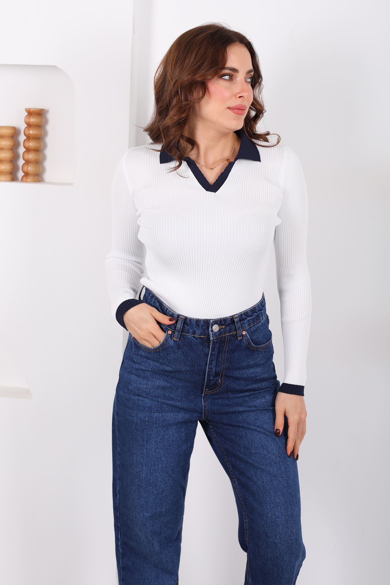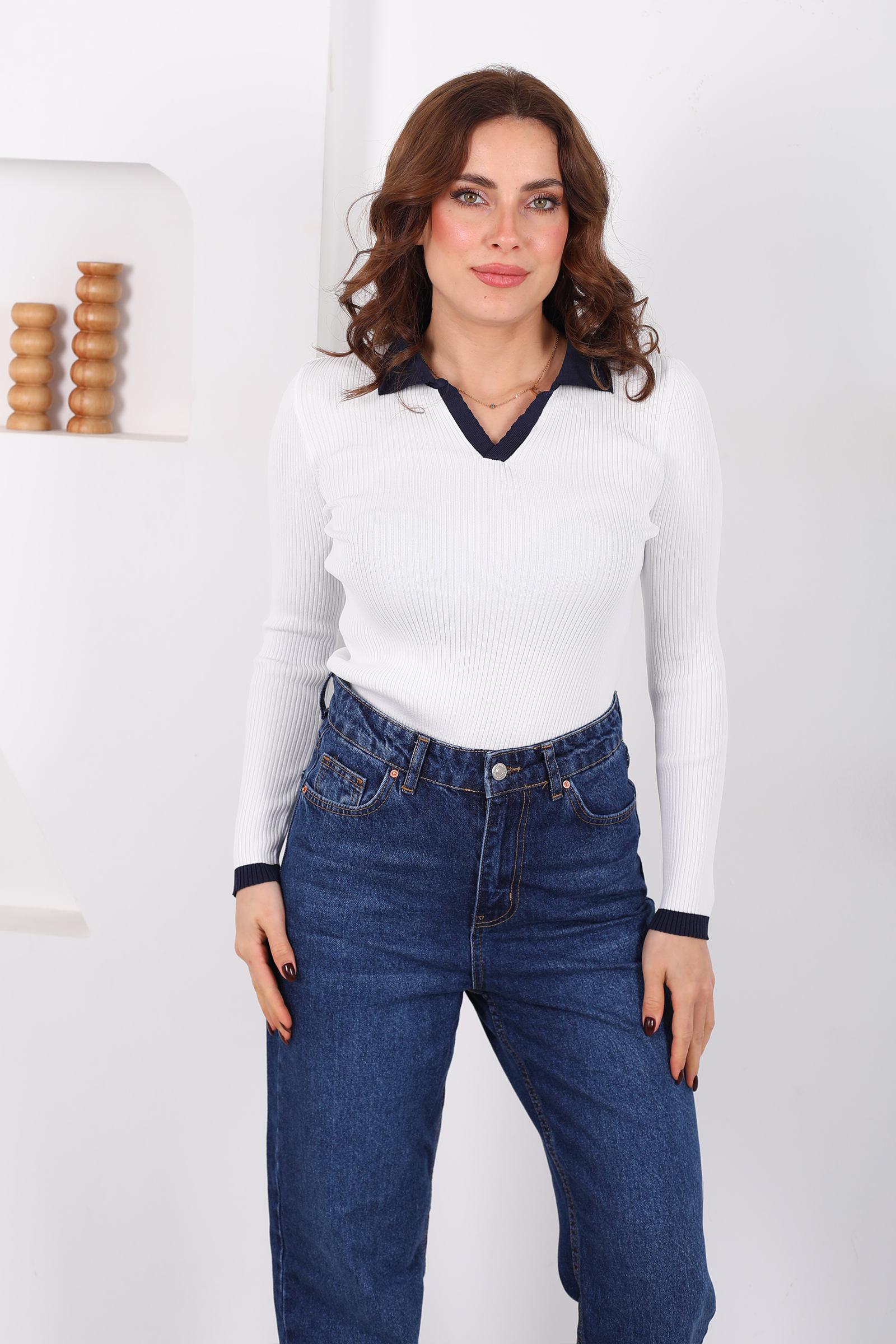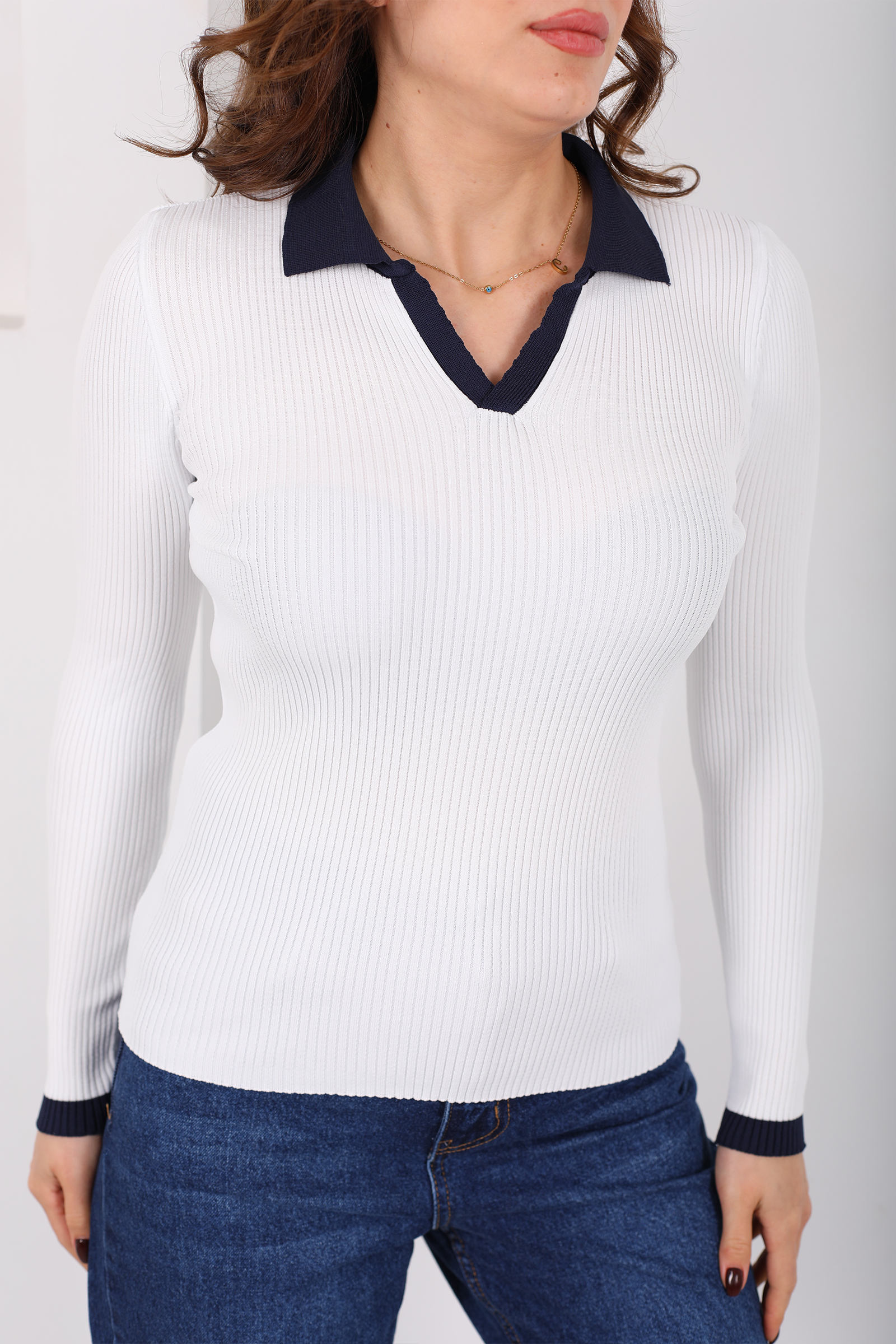Yaka Ve Kol Şeritli Beyaz Kadın Triko Kazak