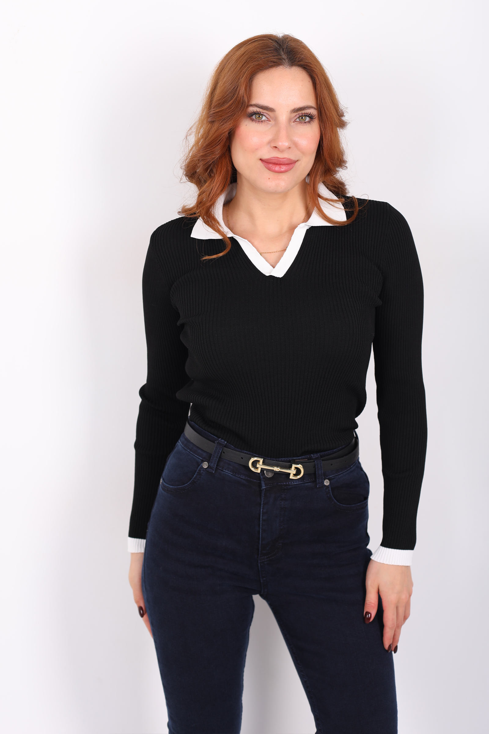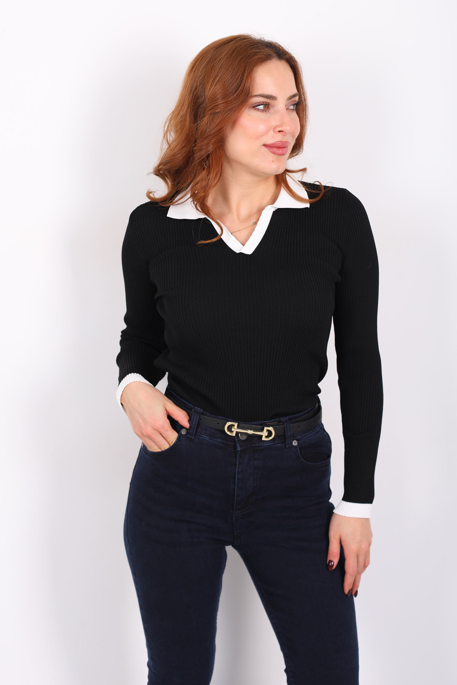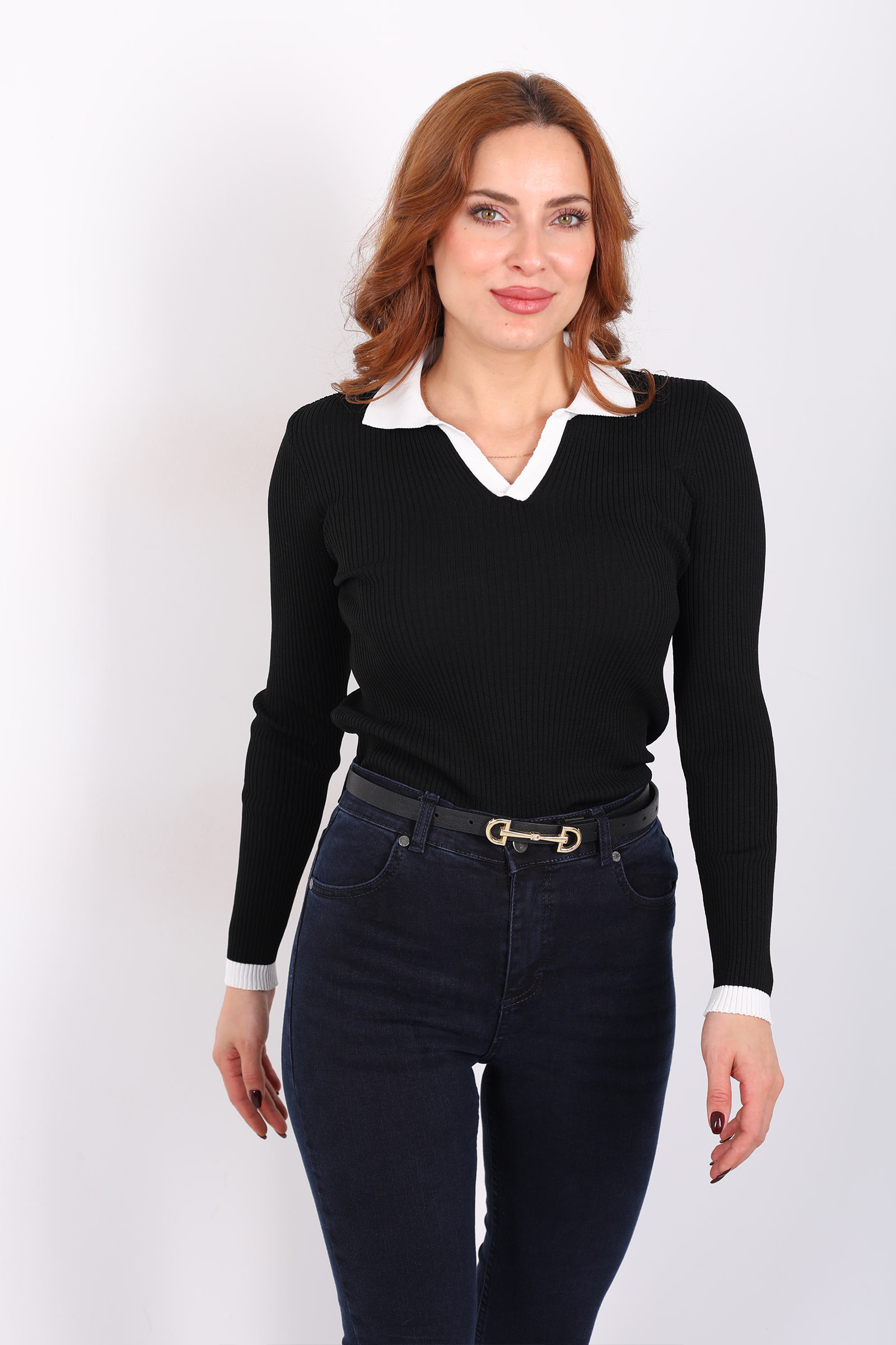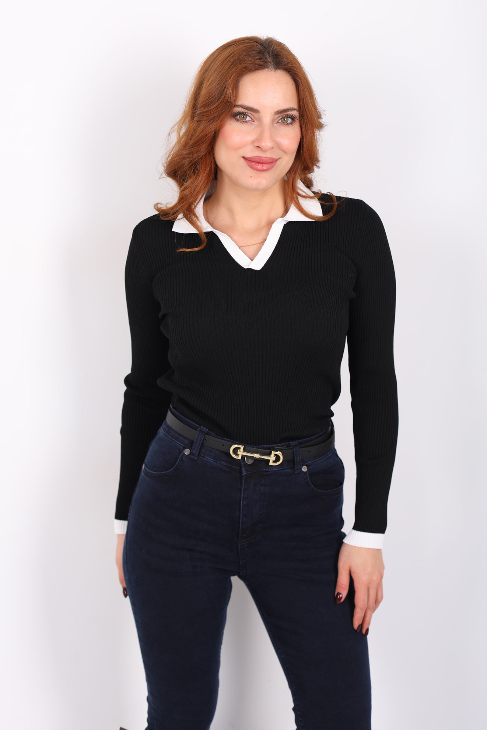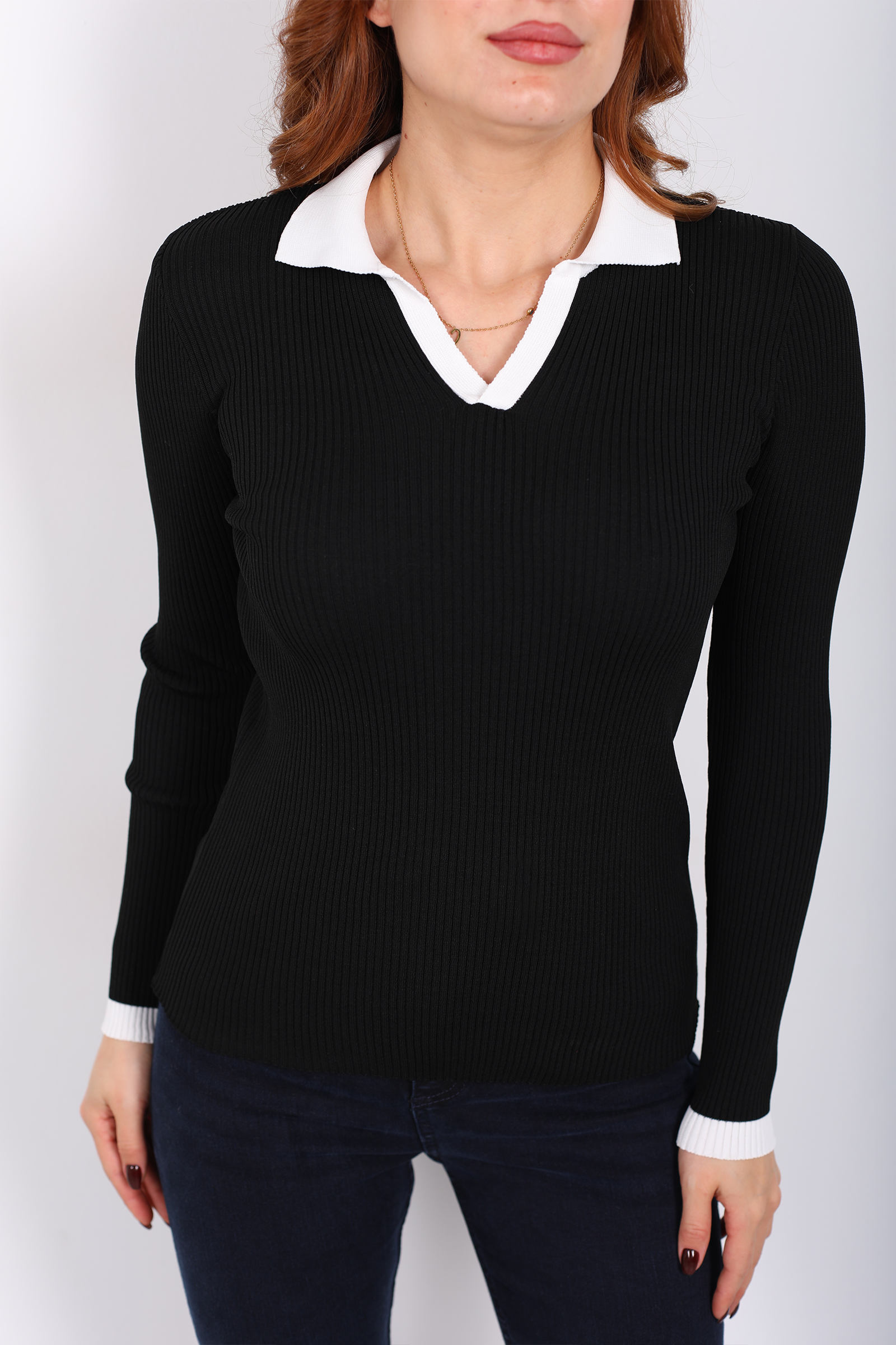 Yaka Ve Kol Şeritli Siyah Kadın Triko Kazak
