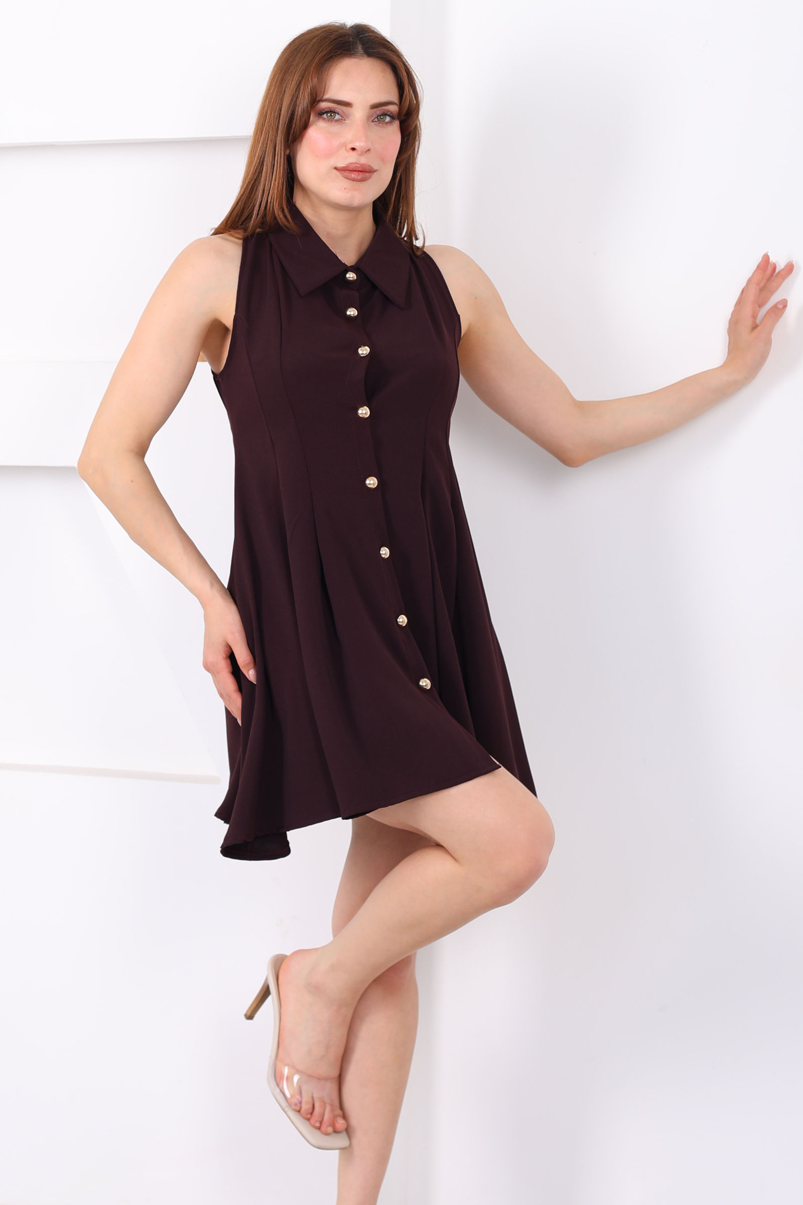 Yakalı Gold Düğmeli Kadın Mürdüm Çan Elbise