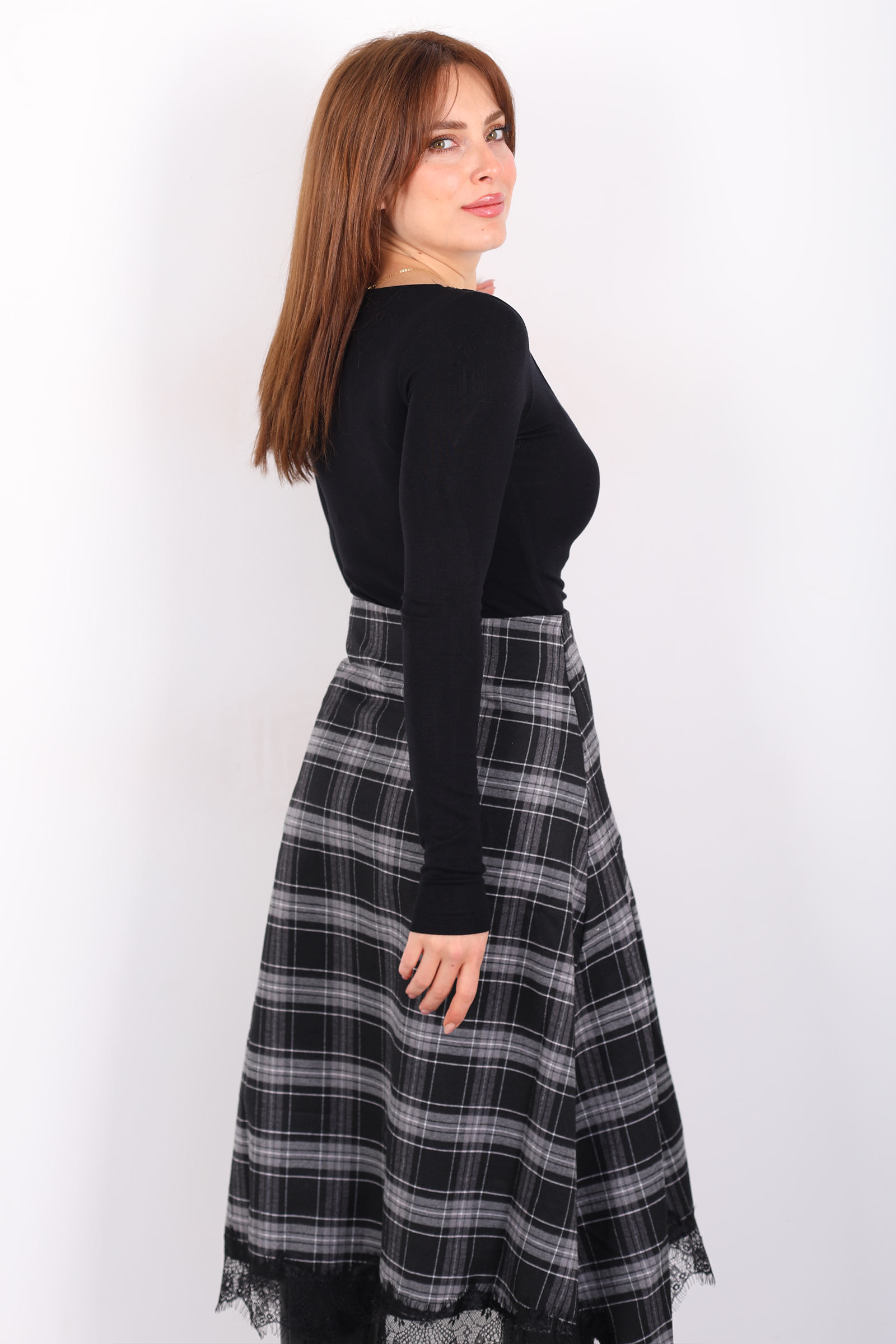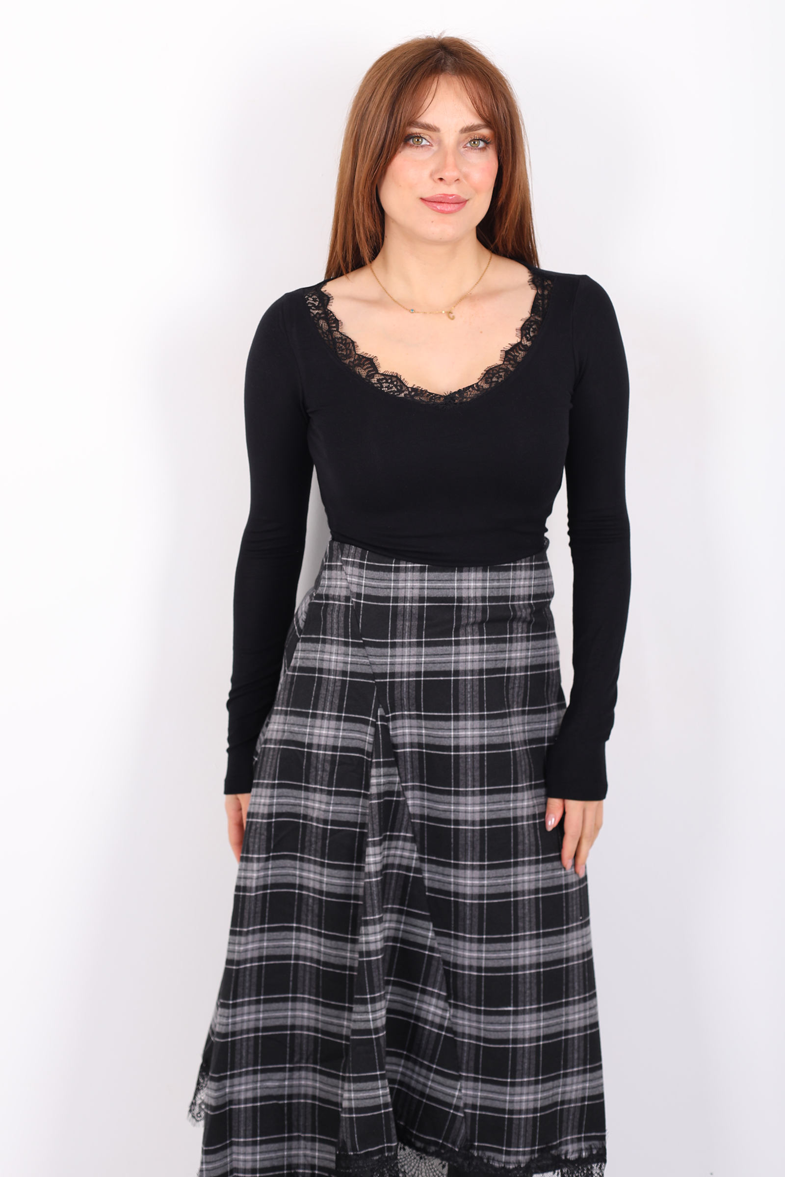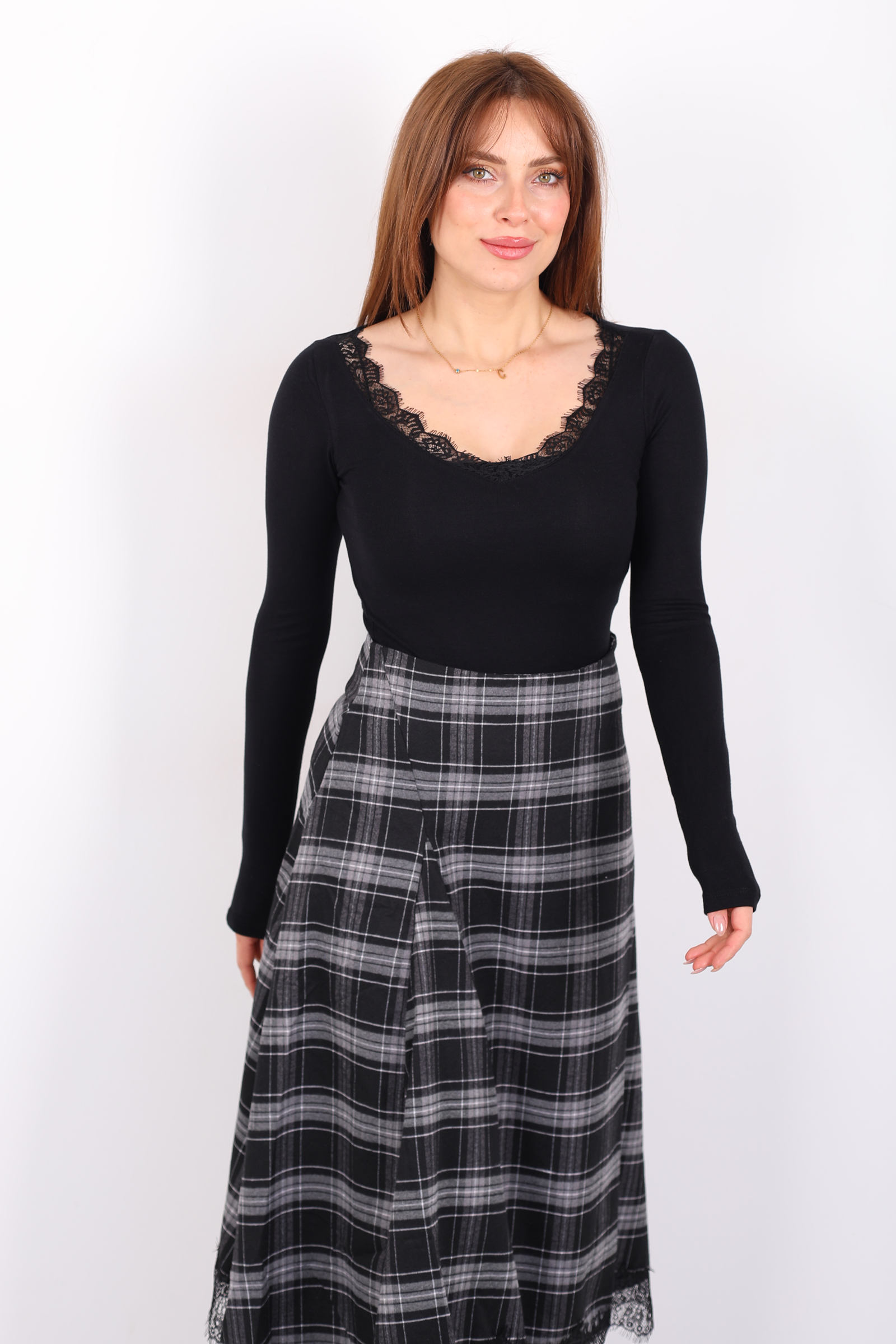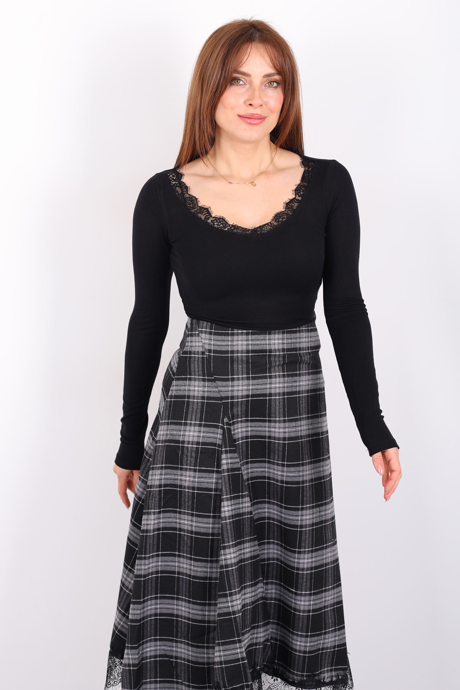 Bu siyah bluz, zarif dantel işlemeli yakası ile sade bir tasarımı sofistike bir kareografiye dönüştürüyor. Koyu siyah ton, günün her anına uygun nötr bir şıklık sağlar ve diğer parçalarla uyumu kolaylaştırır. Dantel vurgusu, parçaya romantik bir detay katarak klasik bir bluzu özel bir stille buluşturur. Yumuşak dokulu kumaş sayesinde konforlu bir giyim deneyimi sunar; jean, kumaş pantolon veya eteklerle farklı tarzlara kolayca uyum sağlar. Hem gündelik kombinlerde hem davet stilinde öne çıkan bu bluz, gardırobunuzun vazgeçilmez parçası olmaya aday.