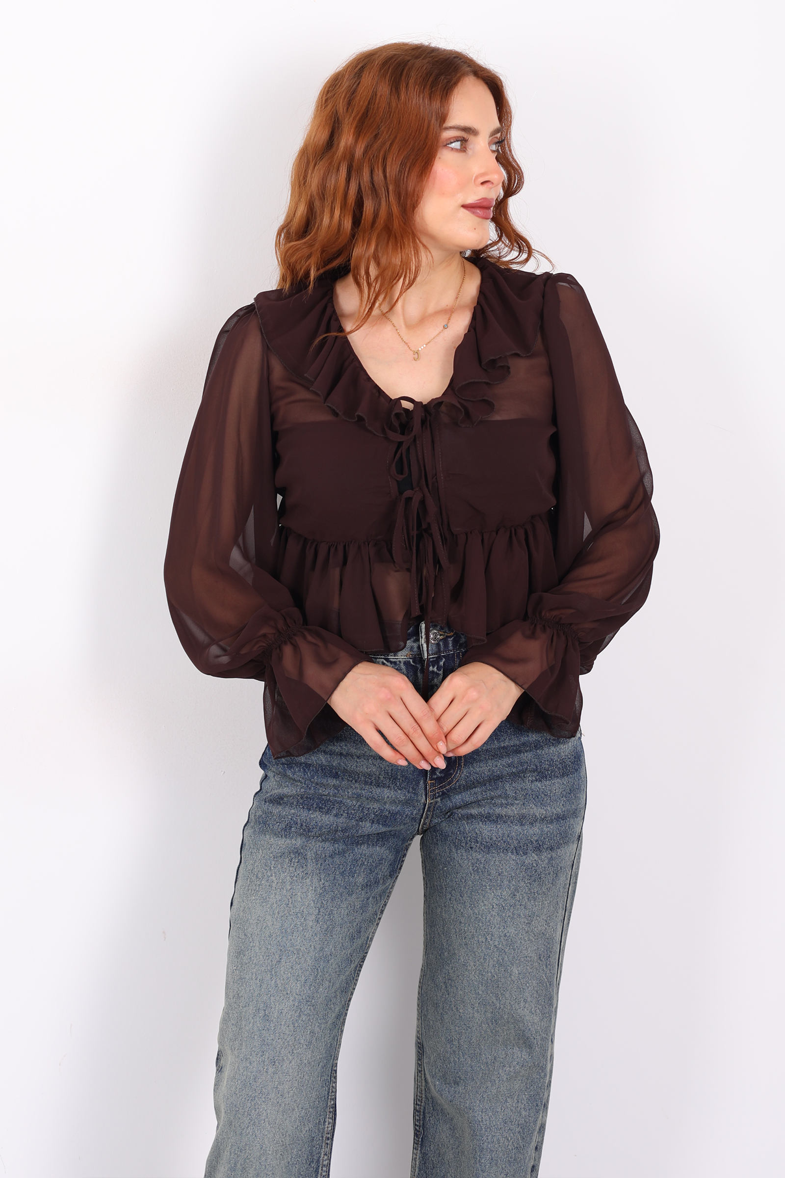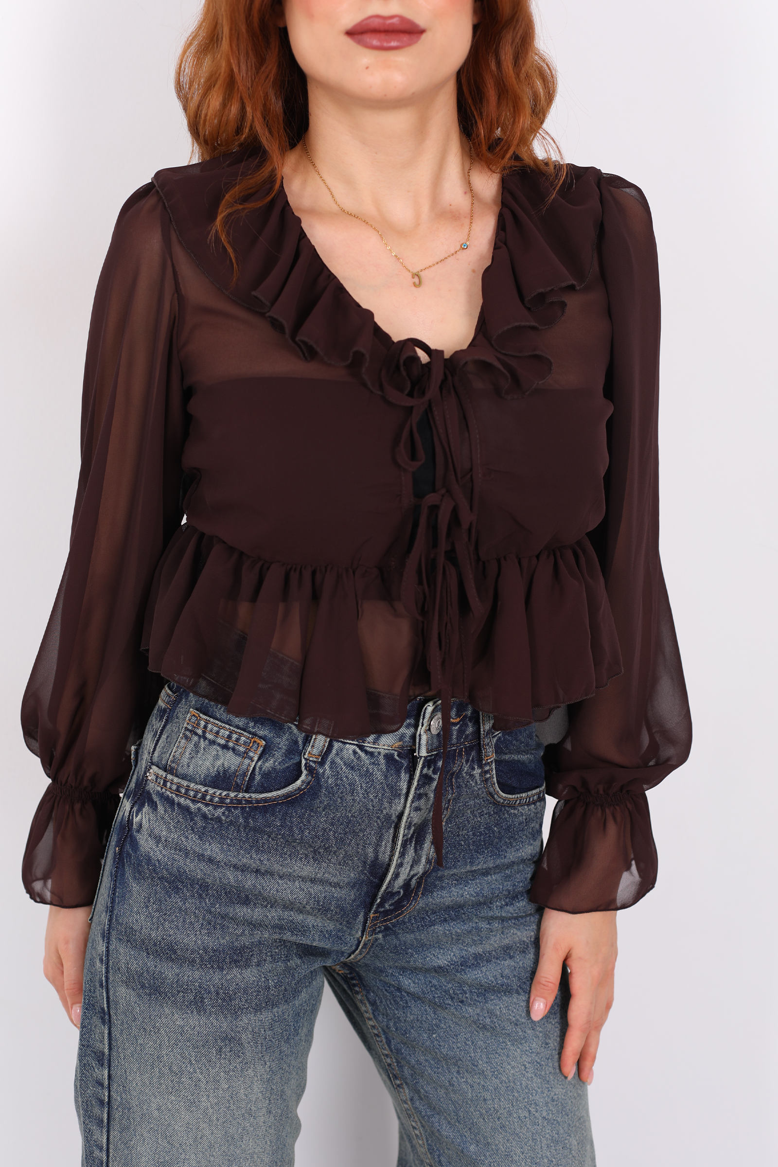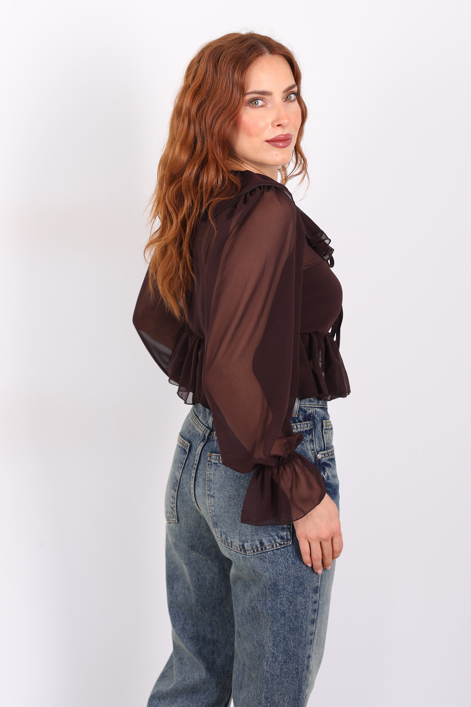 Sıcak açık kahve tonunun zarafeti ile romantik fırfır detaylarının birleştiği bu şifon bluz, gardırobunuza hem yumuşak bir zarafet hem de modern bir dokunuş getiriyor.Yakada yer alan fırfırlar, bluzun siluetine feminen bir kıvrım ve ince bir hacim kazandırır. Bu detay, hem göz alıcı bir hareket hem de zarif bir görünüm sağlar. Kol kesimi ve manşetlerdeki dikişler ise bluzun şıklığını dengeli bir yapı ile tamamlar.