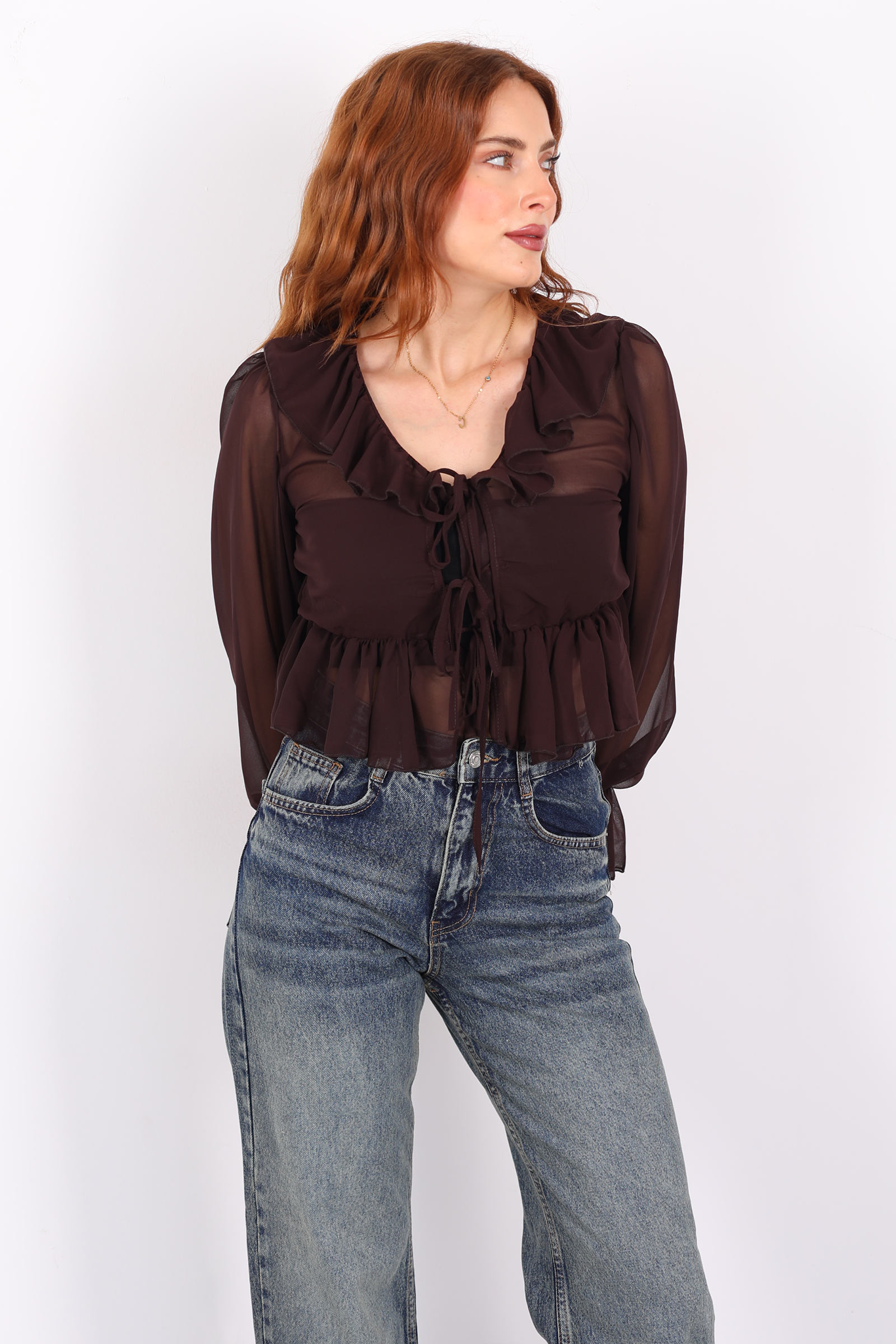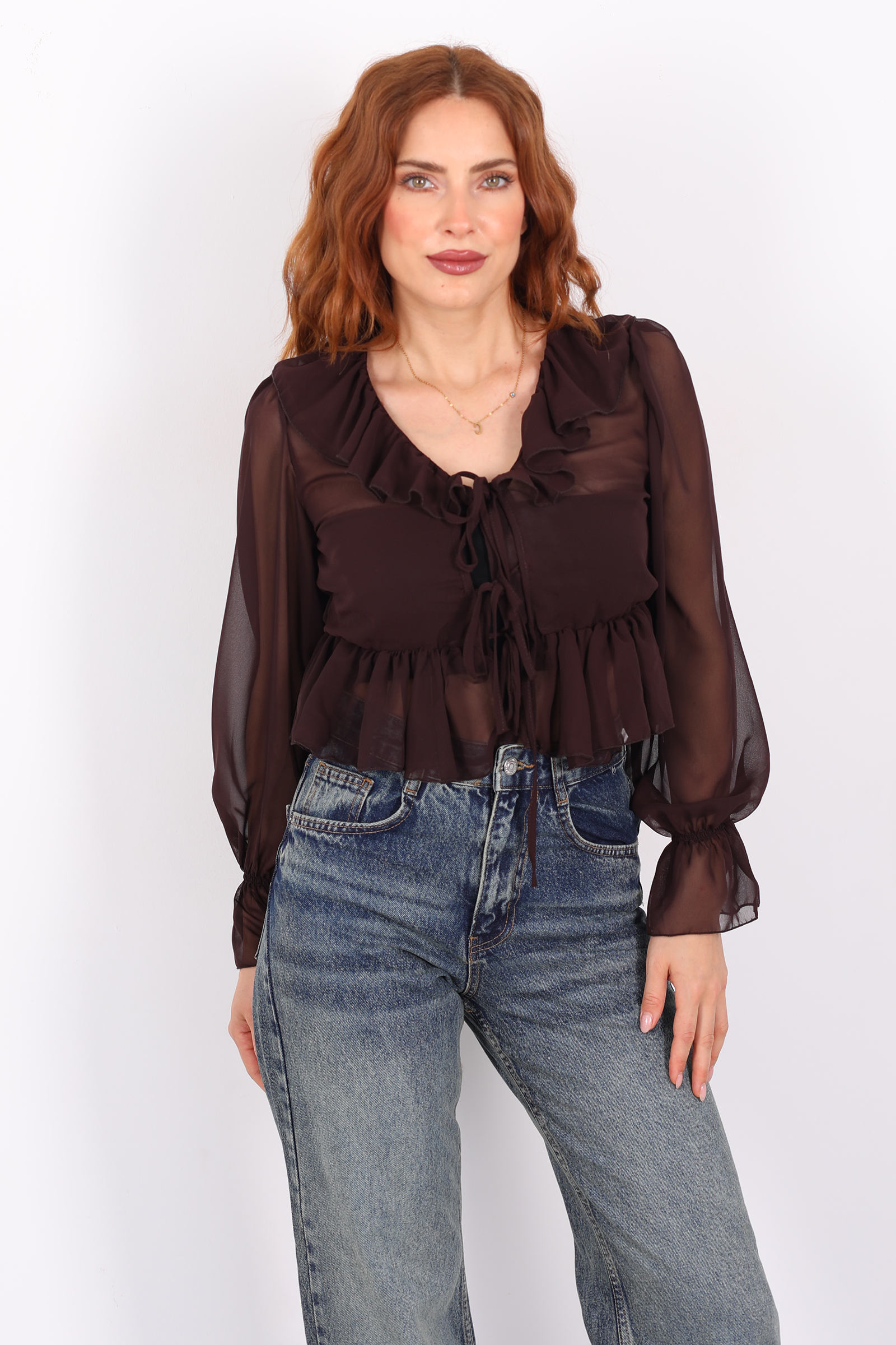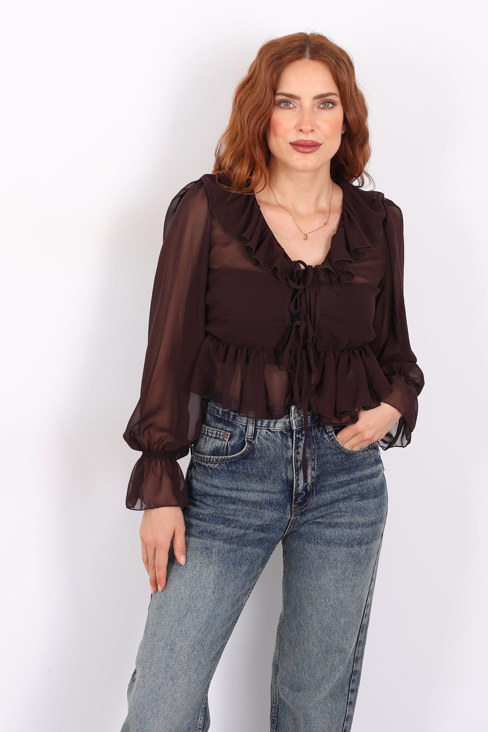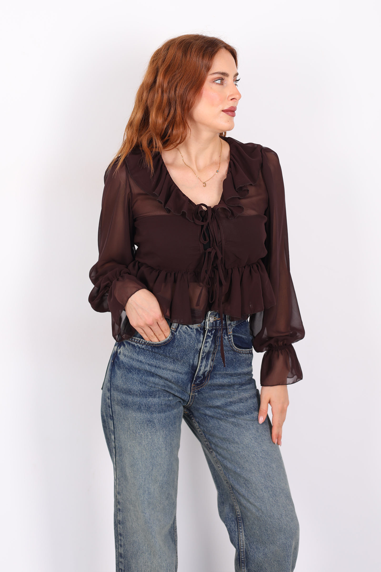 Sıcak açık kahve tonunun zarafeti ile romantik fırfır detaylarının birleştiği bu şifon bluz, gardırobunuza hem yumuşak bir zarafet hem de modern bir dokunuş getiriyor.Yakada yer alan fırfırlar, bluzun siluetine feminen bir kıvrım ve ince bir hacim kazandırır. Bu detay, hem göz alıcı bir hareket hem de zarif bir görünüm sağlar. Kol kesimi ve manşetlerdeki dikişler ise bluzun şıklığını dengeli bir yapı ile tamamlar.