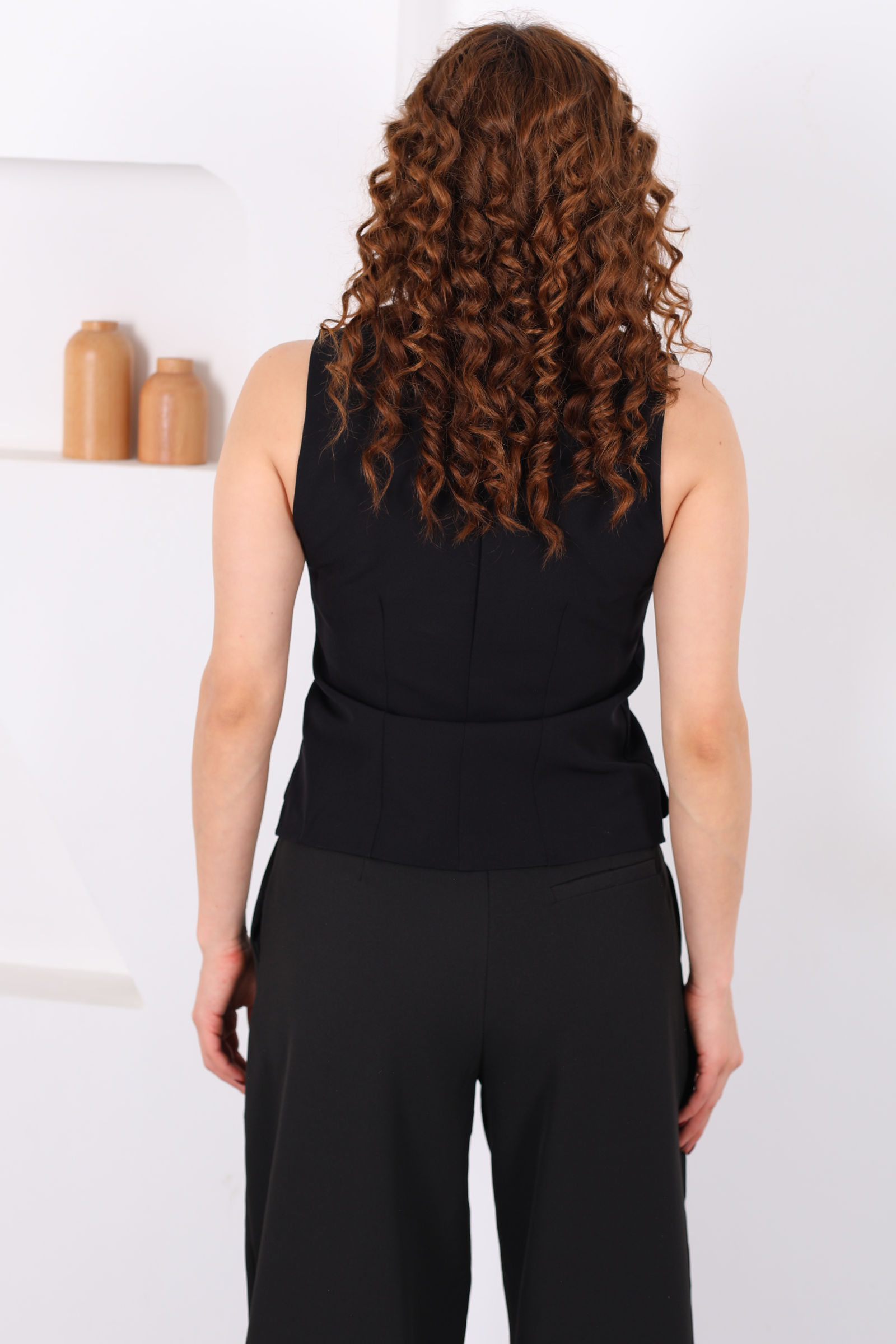 Keten Görünümlü Düğmeli Siyah Kadın Yelek