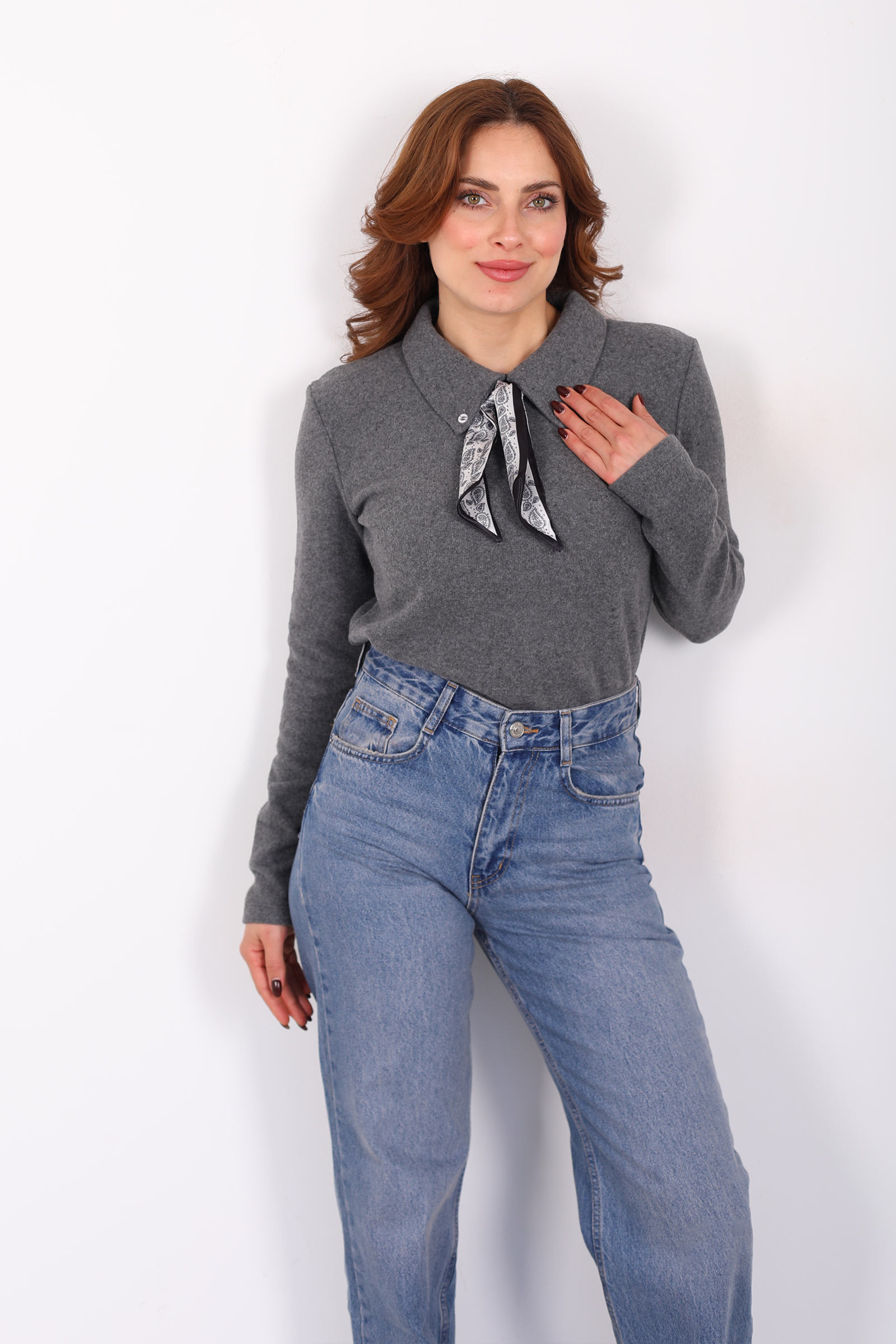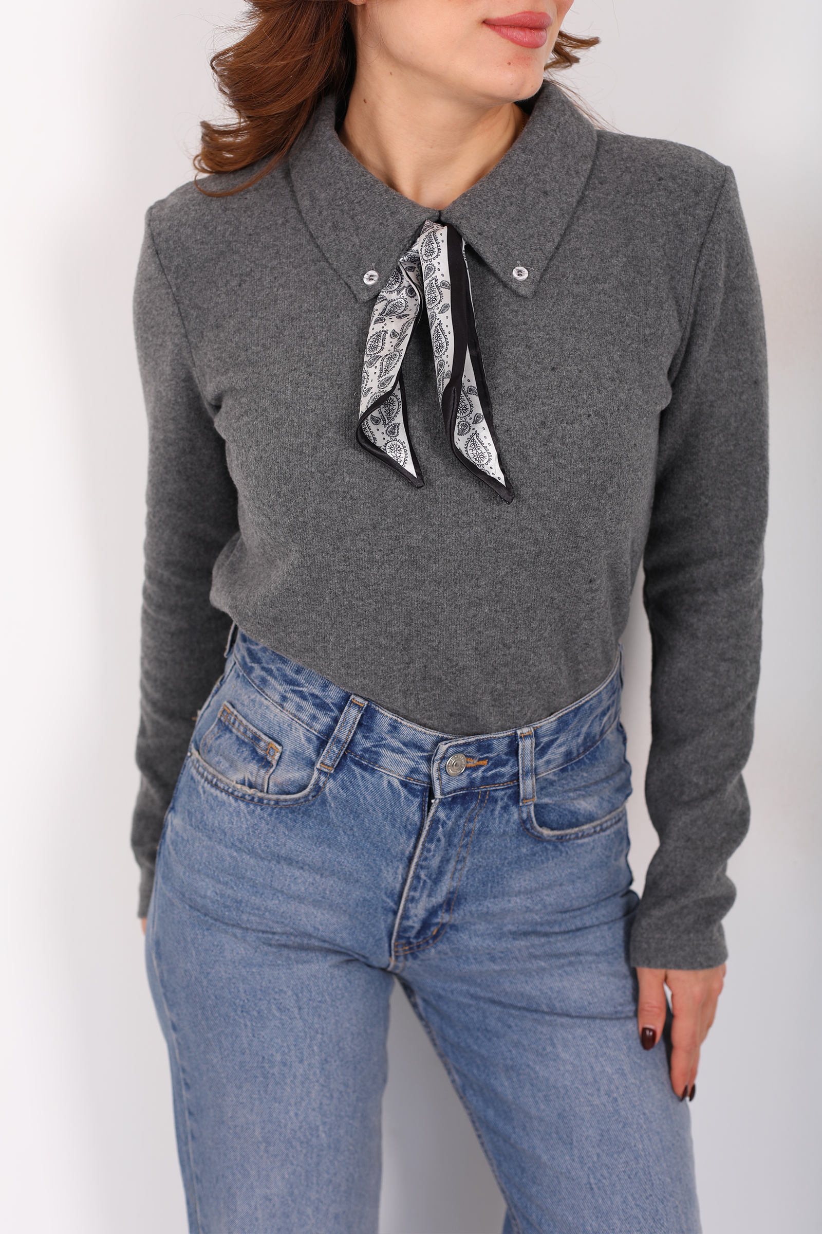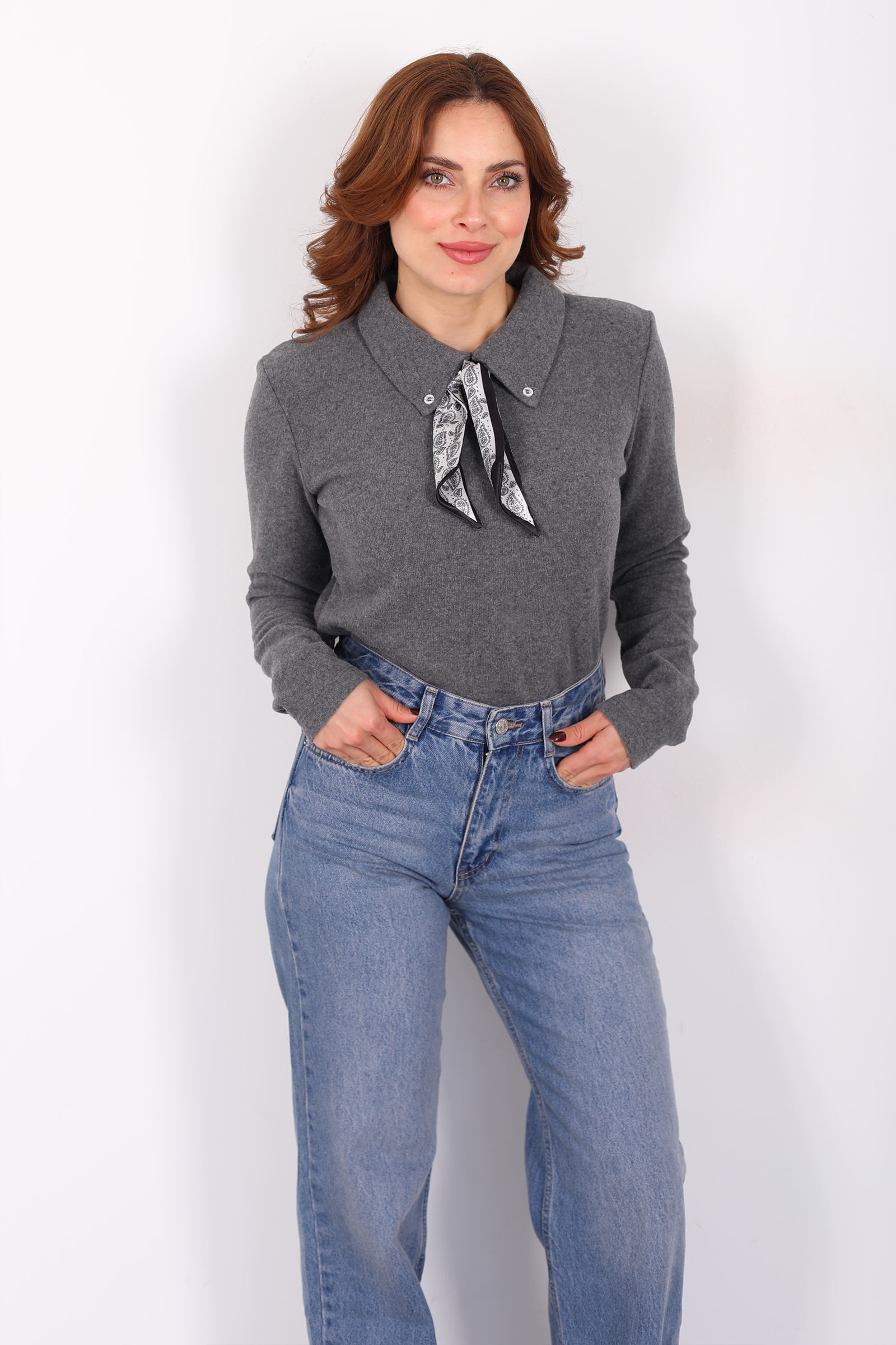 Antrasit tonunun dingin havasını, zarif fular detaylarıyla buluşturan bu selanik bluz, sade görünümüne feminen bir dokunuş katıyor. Yumuşak kumaş yapısı gün boyu konfor sağlarken selanik dokunun yüzey ritmi görünümde hoş bir doku efekti yaratır. Yakadaki fular detayı minimalist tasarımı canlandırarak duruşa incelik katar. Altına jean, kumaş pantolon ya da eteklerle kombinlendiğinde dengeli ve modern bir stille bütünleşir. Hem sade hem etkileyici bir ifade arayanlar için kolayca tercih edilebilecek parçalar arasında yer alır.