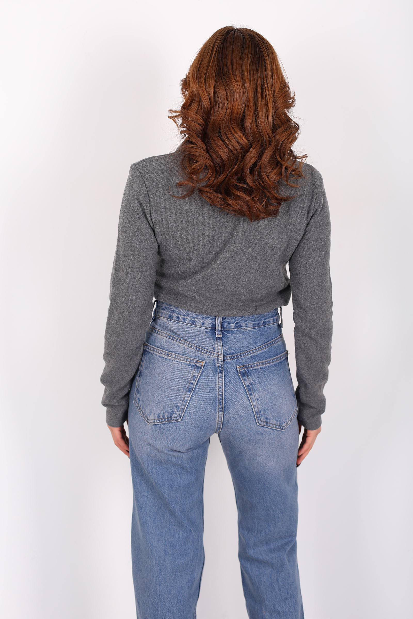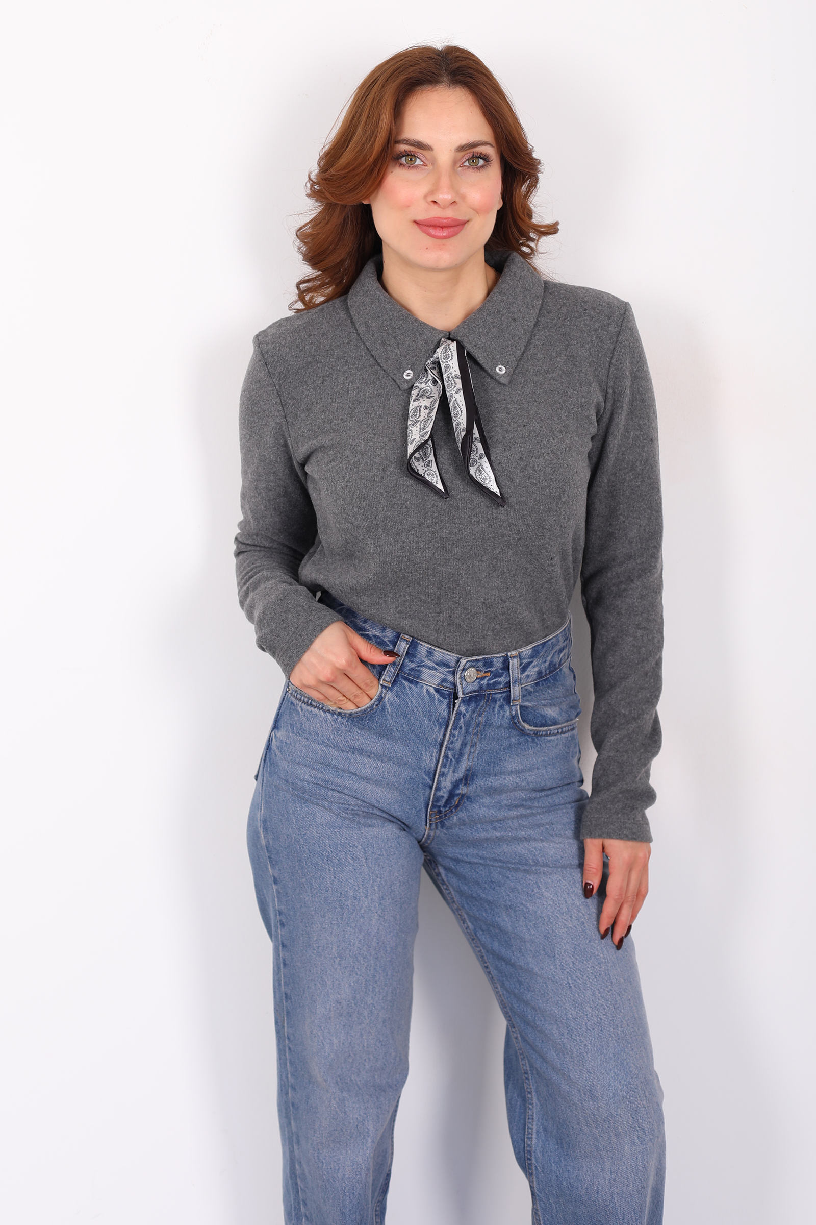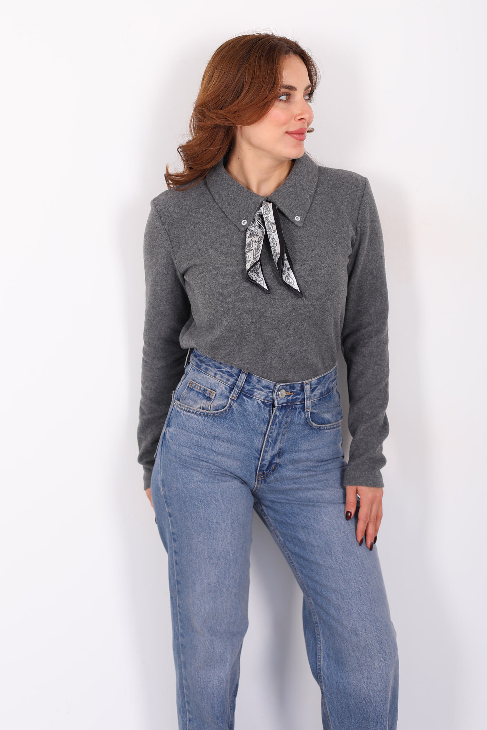 Antrasit tonunun dingin havasını, zarif fular detaylarıyla buluşturan bu selanik bluz, sade görünümüne feminen bir dokunuş katıyor. Yumuşak kumaş yapısı gün boyu konfor sağlarken selanik dokunun yüzey ritmi görünümde hoş bir doku efekti yaratır. Yakadaki fular detayı minimalist tasarımı canlandırarak duruşa incelik katar. Altına jean, kumaş pantolon ya da eteklerle kombinlendiğinde dengeli ve modern bir stille bütünleşir. Hem sade hem etkileyici bir ifade arayanlar için kolayca tercih edilebilecek parçalar arasında yer alır.