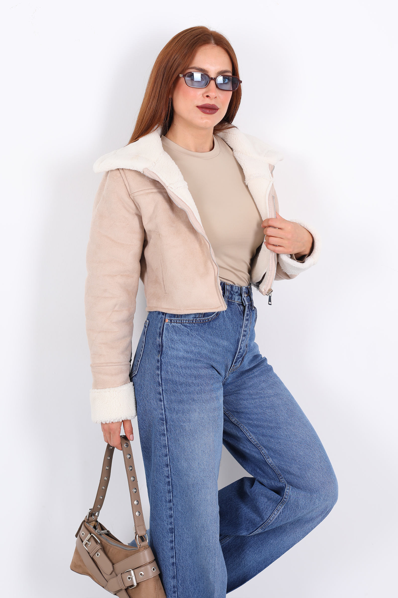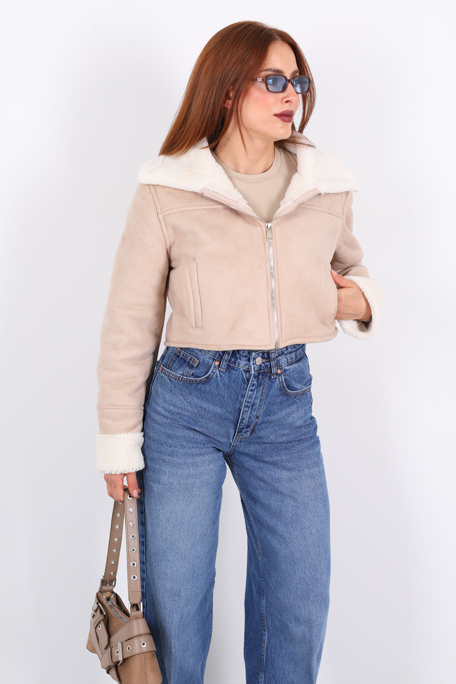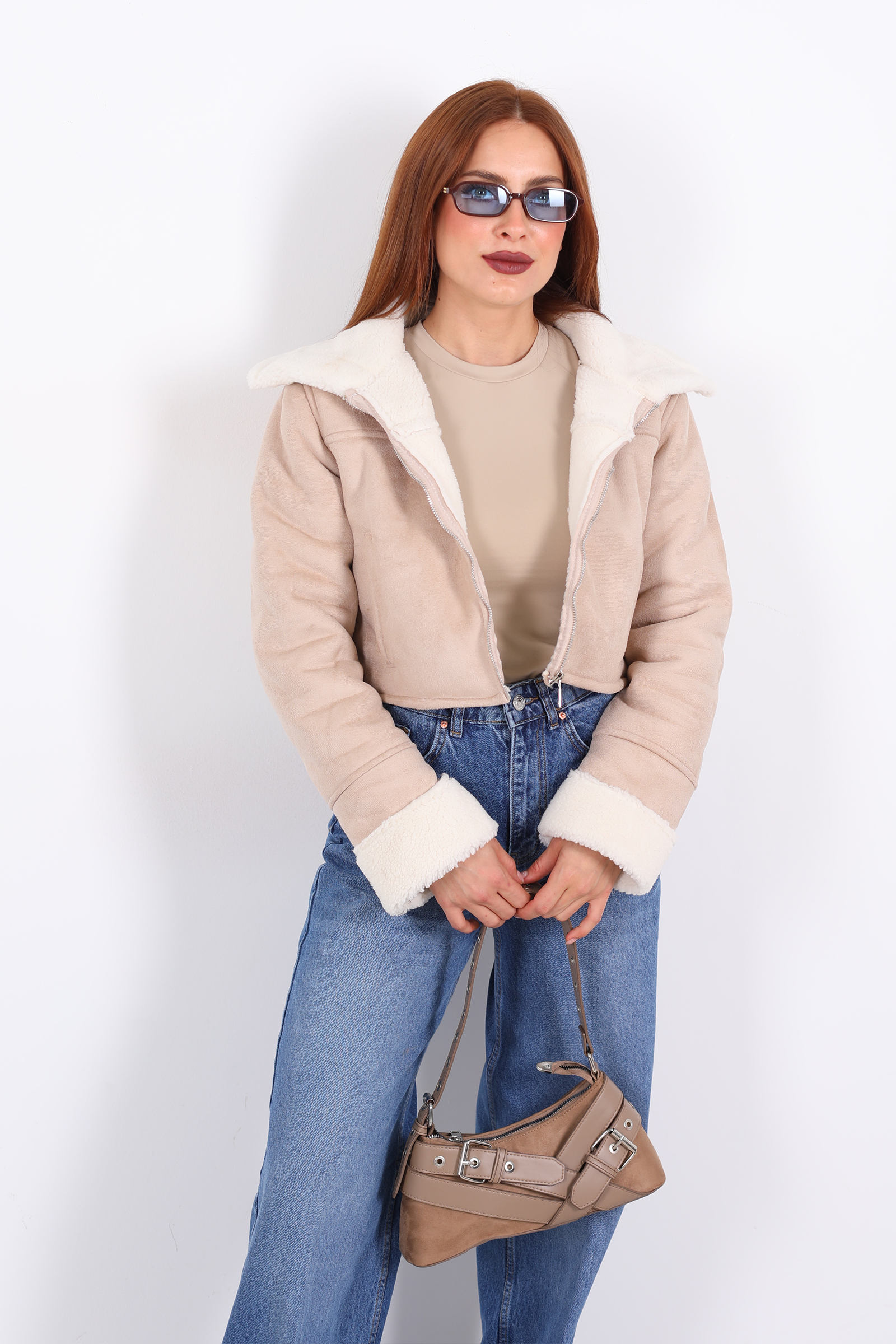 Süetin kadifemsi dokusu ve bej tonunun zarafetiyle tasarlanan bu kısa mont, stilinize modern bir dokunuş katıyor. Kurklu yaka, boyun hattınızı sarmakla kalmaz, aynı zamanda montun genel duruşuna sofistike bir detay ekler. Kısa kesimi sayesinde bele kadar inerek siluetinizi dengeler ve rahat hareket imkanı sunar.