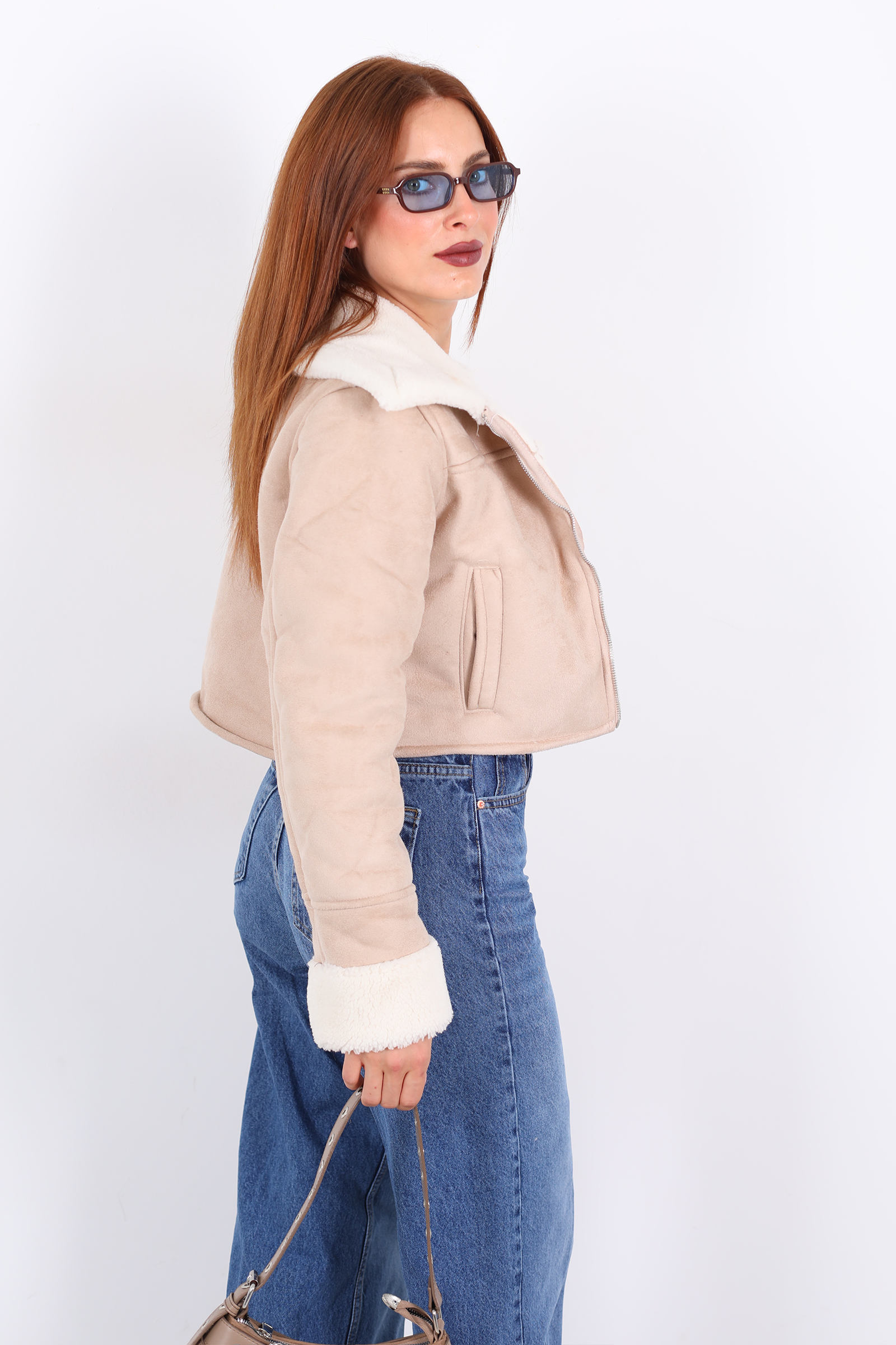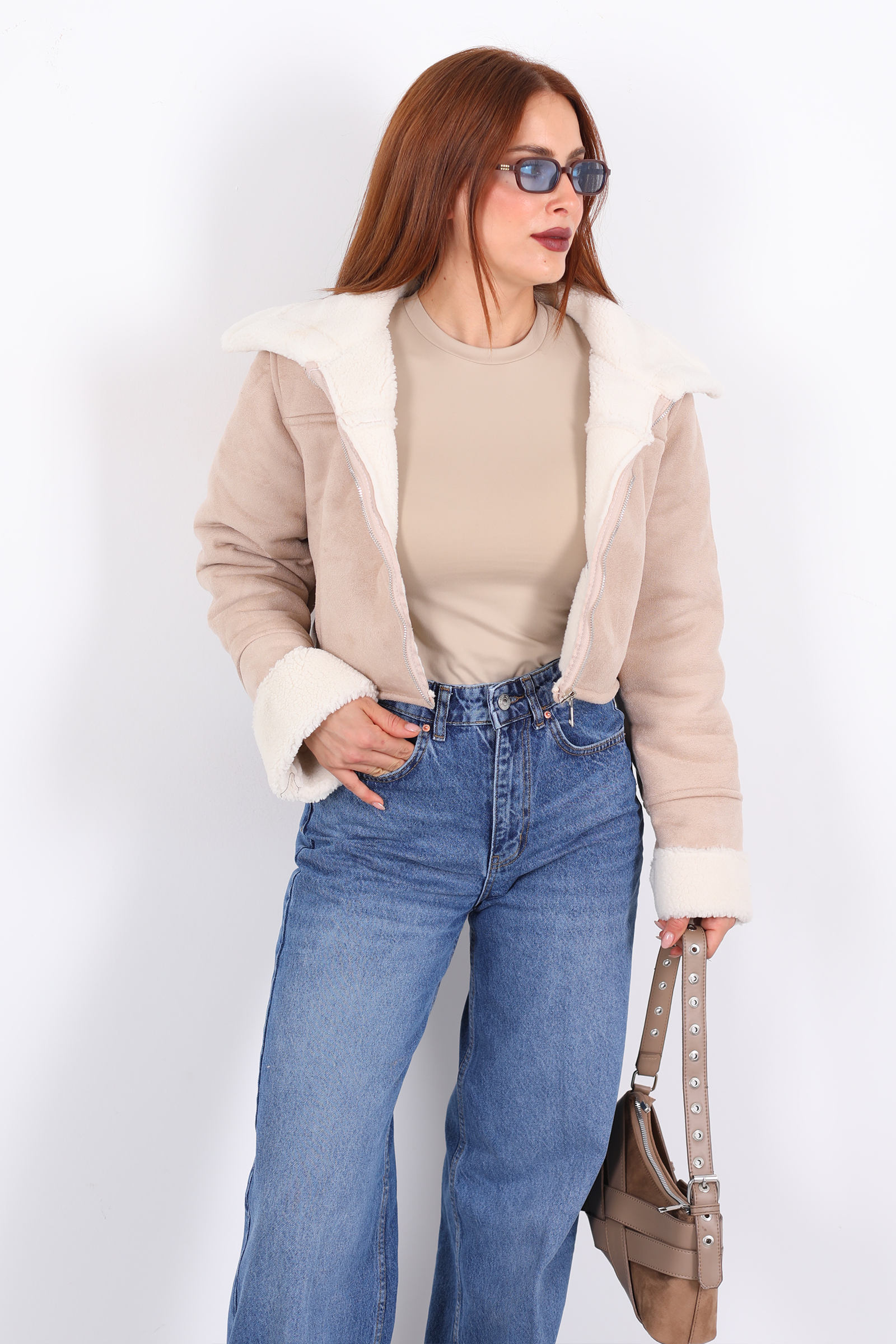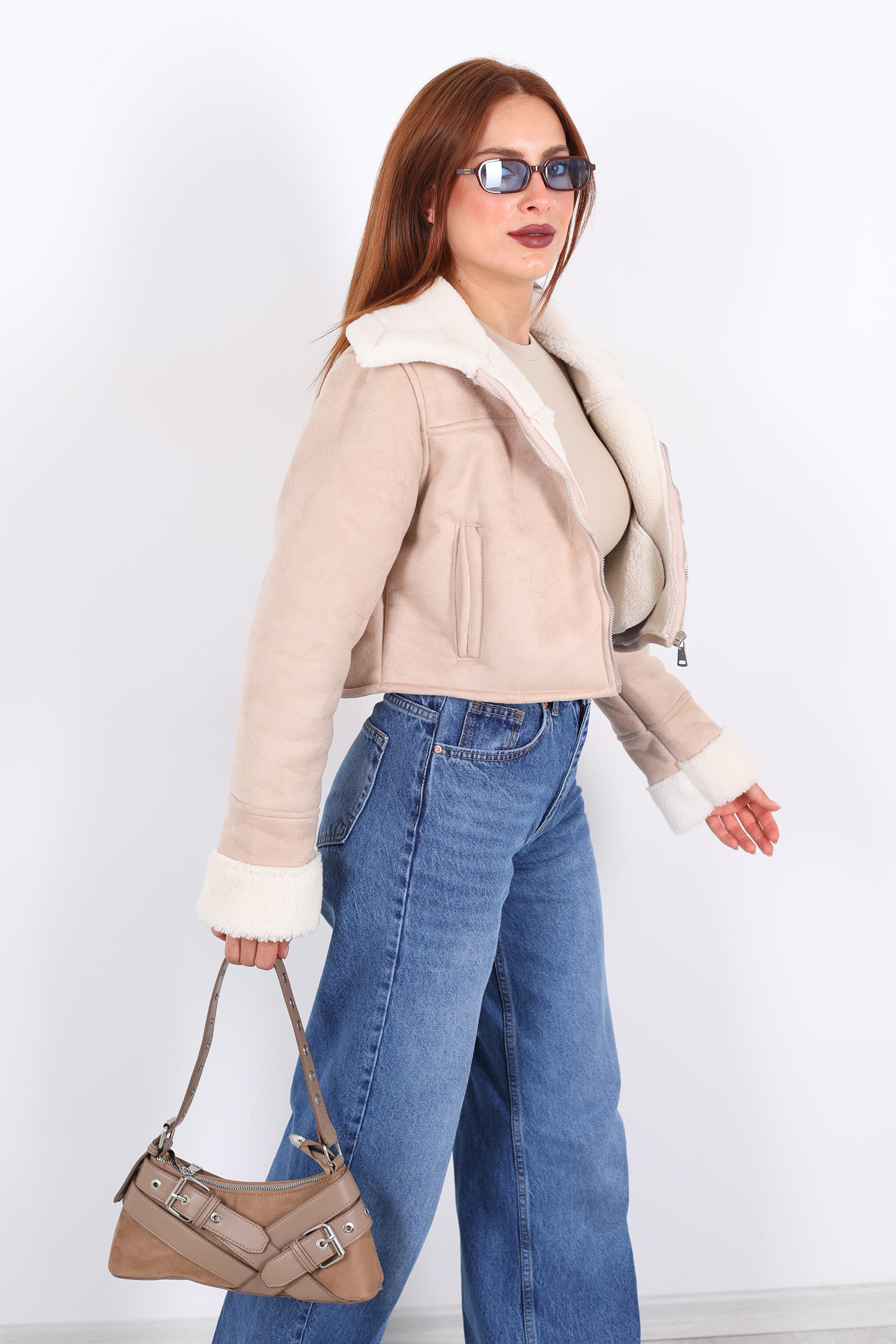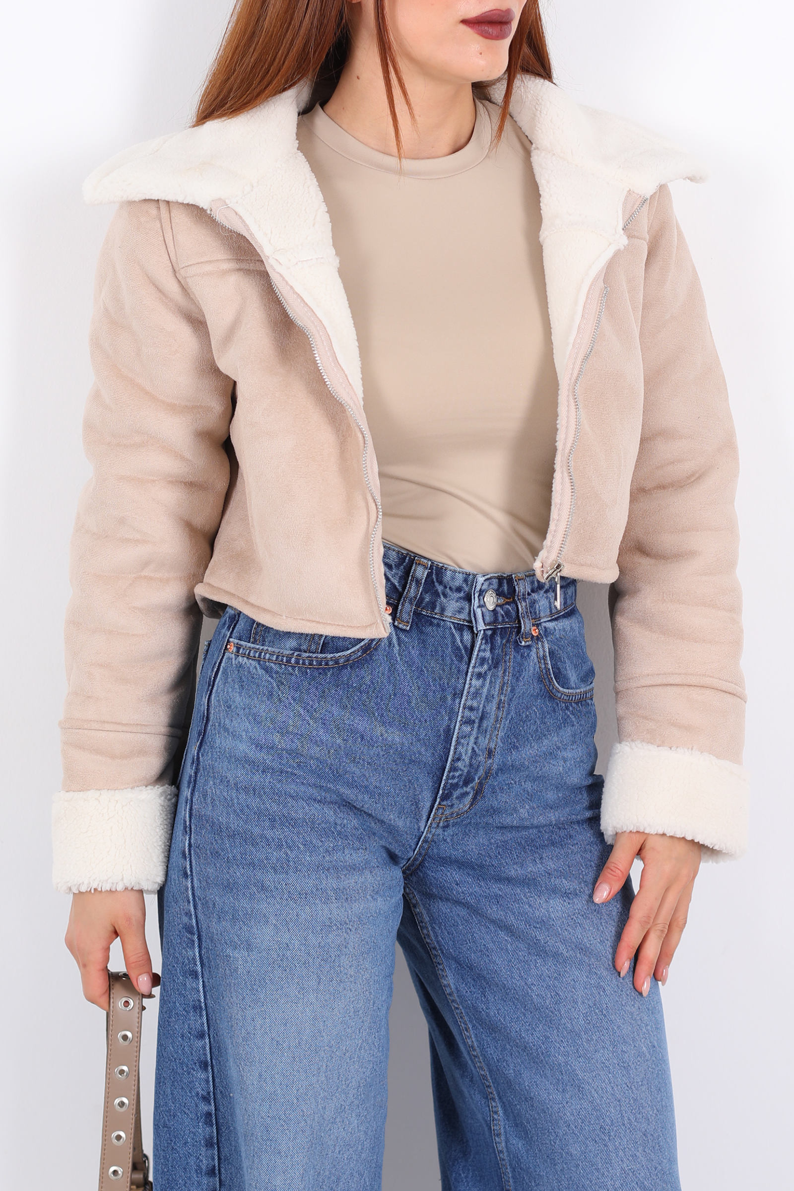 Süetin kadifemsi dokusu ve bej tonunun zarafetiyle tasarlanan bu kısa mont, stilinize modern bir dokunuş katıyor. Kurklu yaka, boyun hattınızı sarmakla kalmaz, aynı zamanda montun genel duruşuna sofistike bir detay ekler. Kısa kesimi sayesinde bele kadar inerek siluetinizi dengeler ve rahat hareket imkanı sunar.