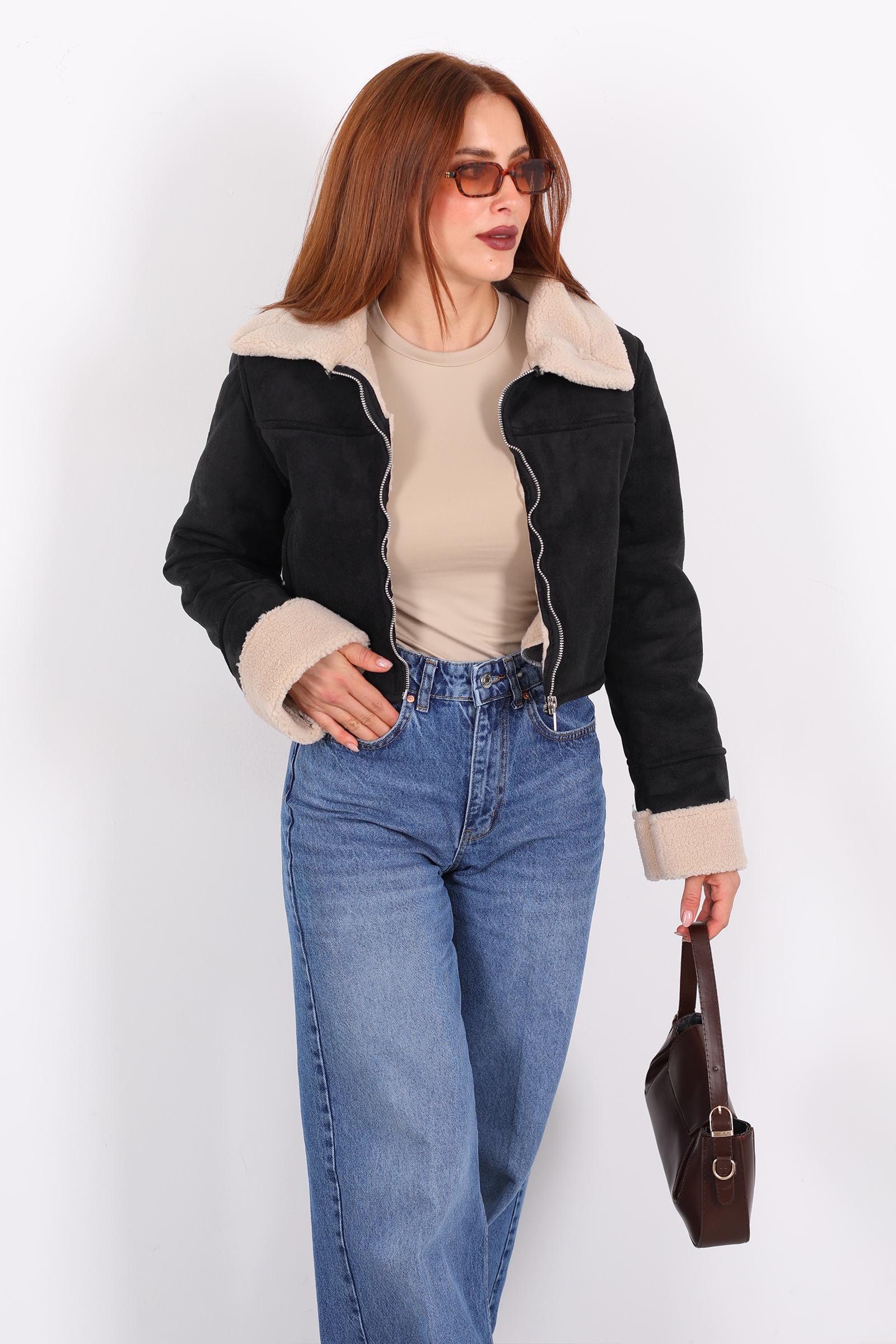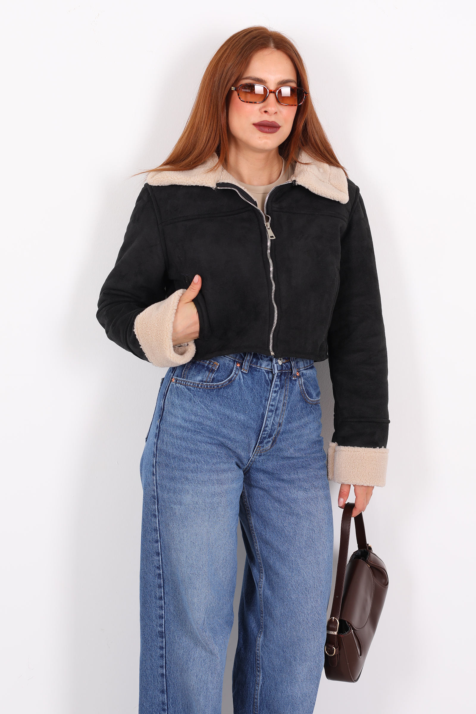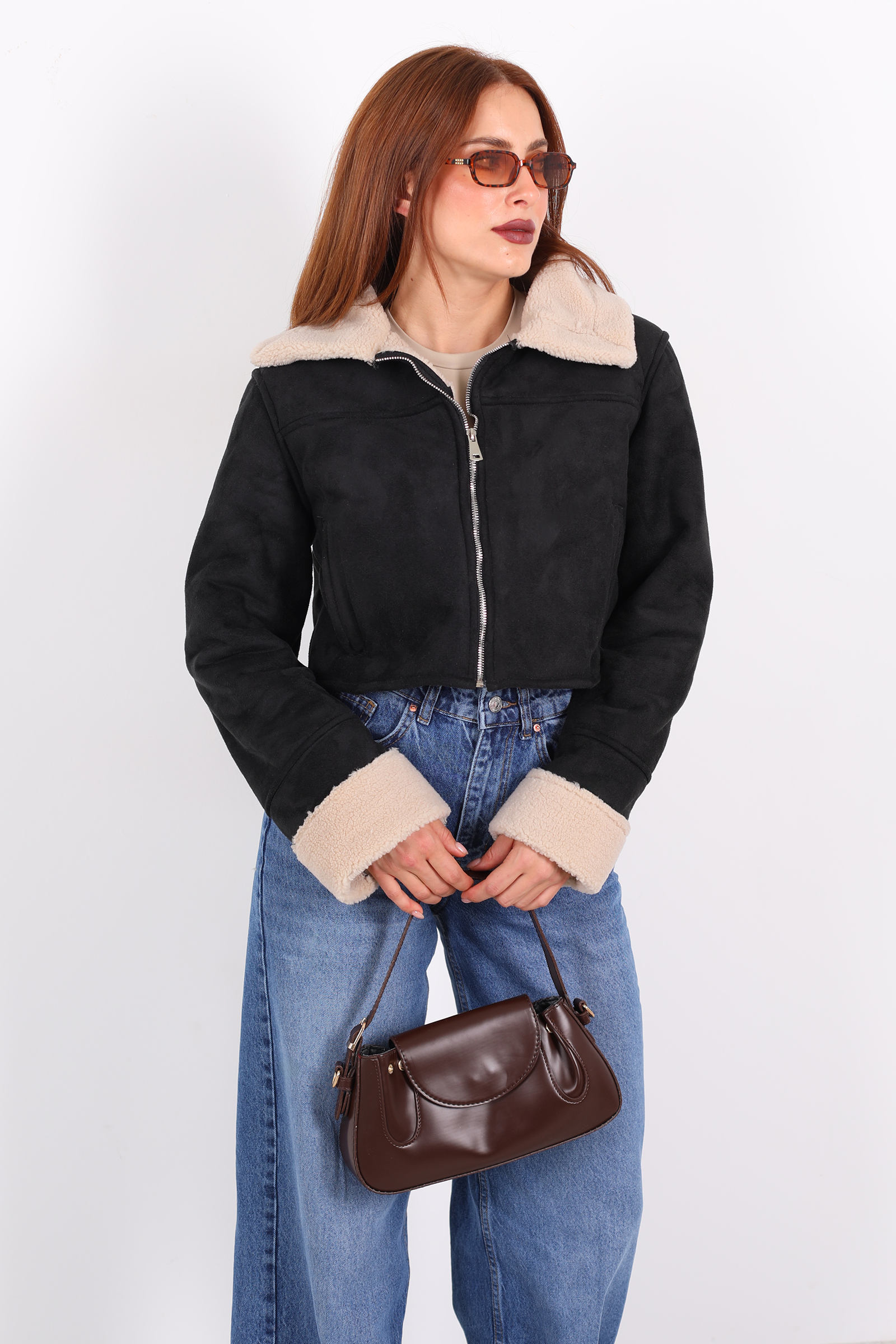 Siyahın klasik şıklığını süetin lüks dokusuyla buluşturan bu kısa mont, her tarzla uyum sağlayacak sofistike bir parça. Kurklu yakası, hem boyun bölgesine sıcaklık kazandırır hem de montun genel görünümüne modern bir hava ekler. Kısa kesim, bele kadar inerek hem silueti dengeler hem de hareket özgürlüğü sunar.İnce bir kazak altına giyerek ve uzun bir şal ekleyerek soğuk havalarda hem şık hem sıcak bir görünüm yaratabilirsiniz.