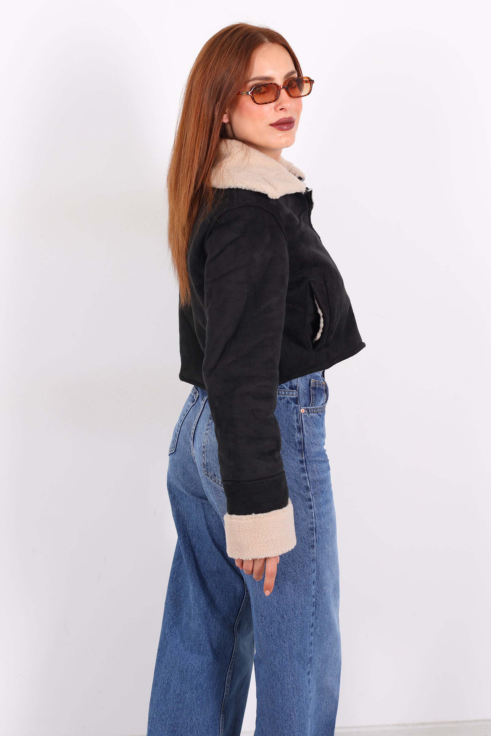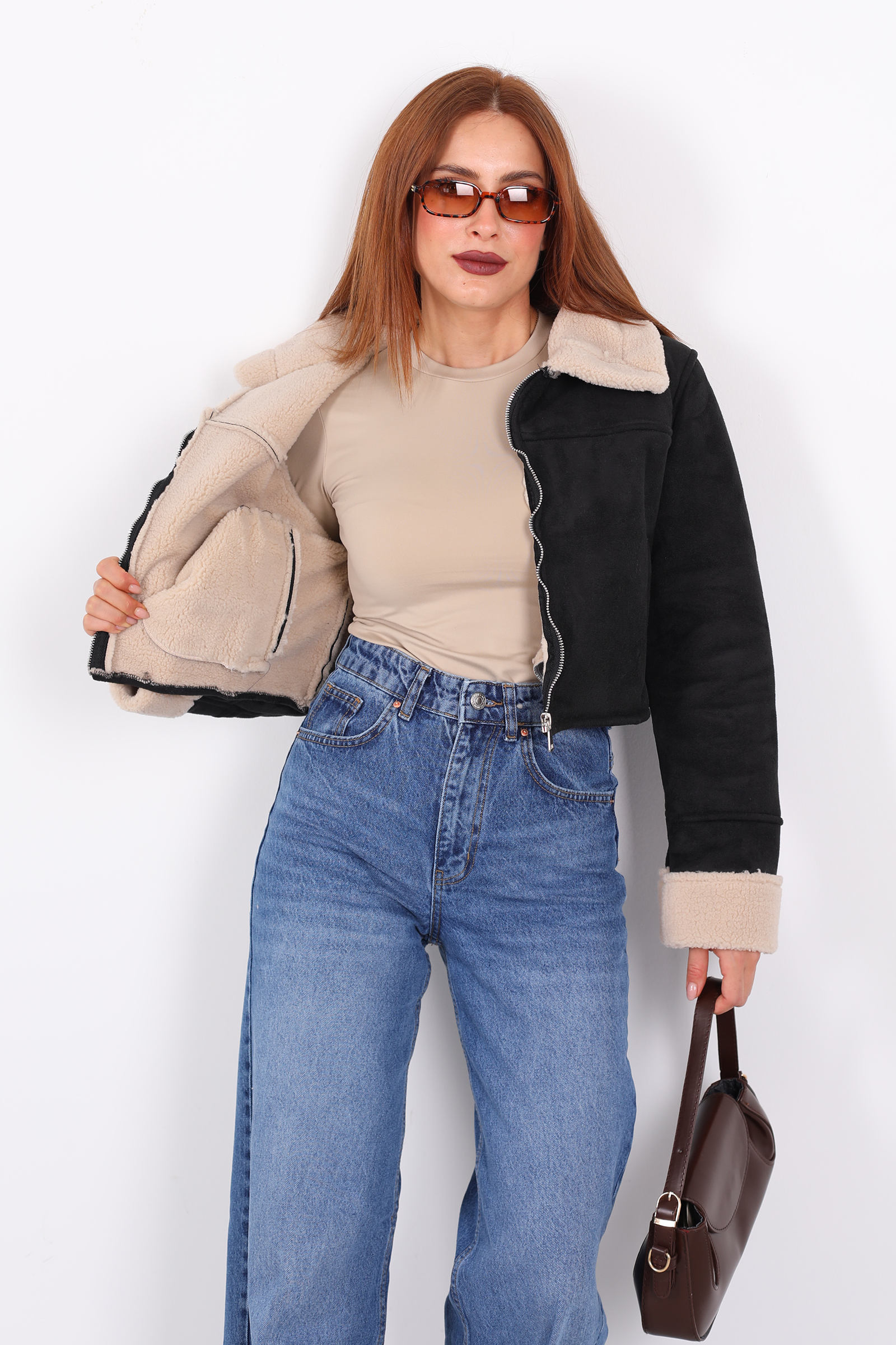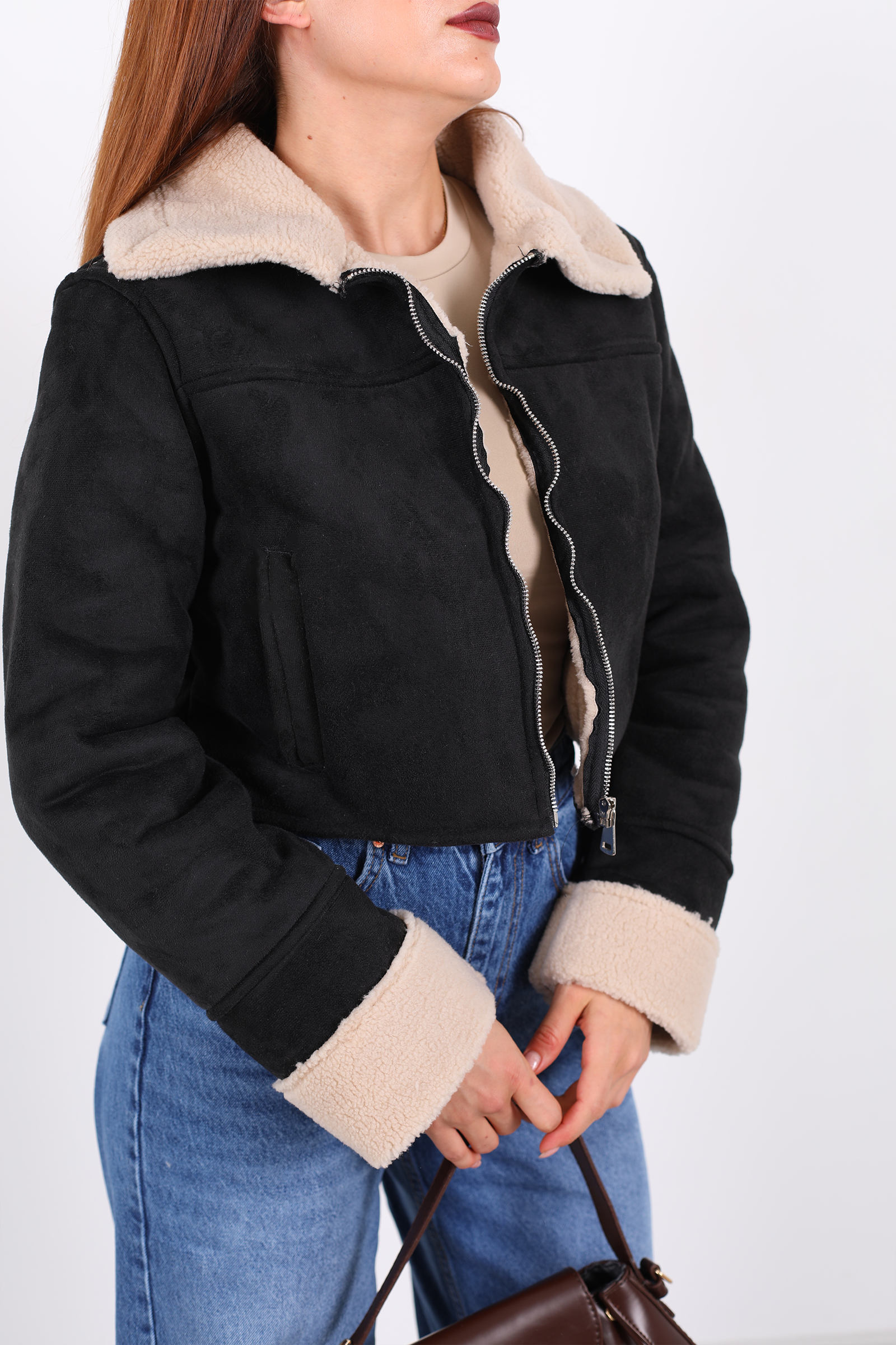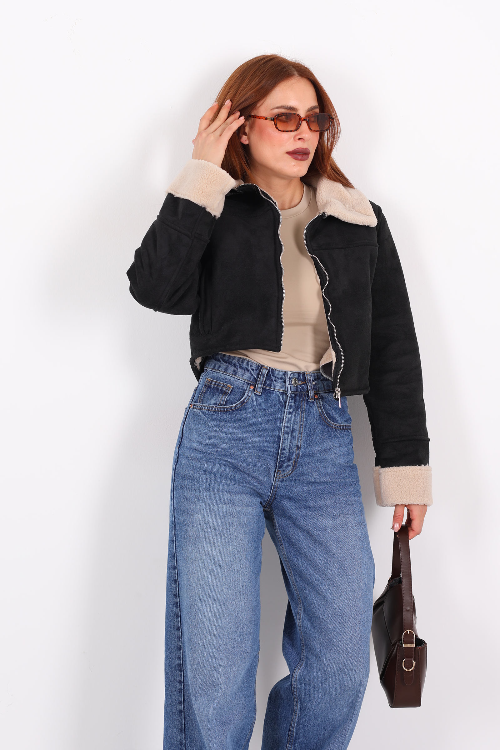 Siyahın klasik şıklığını süetin lüks dokusuyla buluşturan bu kısa mont, her tarzla uyum sağlayacak sofistike bir parça. Kurklu yakası, hem boyun bölgesine sıcaklık kazandırır hem de montun genel görünümüne modern bir hava ekler. Kısa kesim, bele kadar inerek hem silueti dengeler hem de hareket özgürlüğü sunar.İnce bir kazak altına giyerek ve uzun bir şal ekleyerek soğuk havalarda hem şık hem sıcak bir görünüm yaratabilirsiniz.