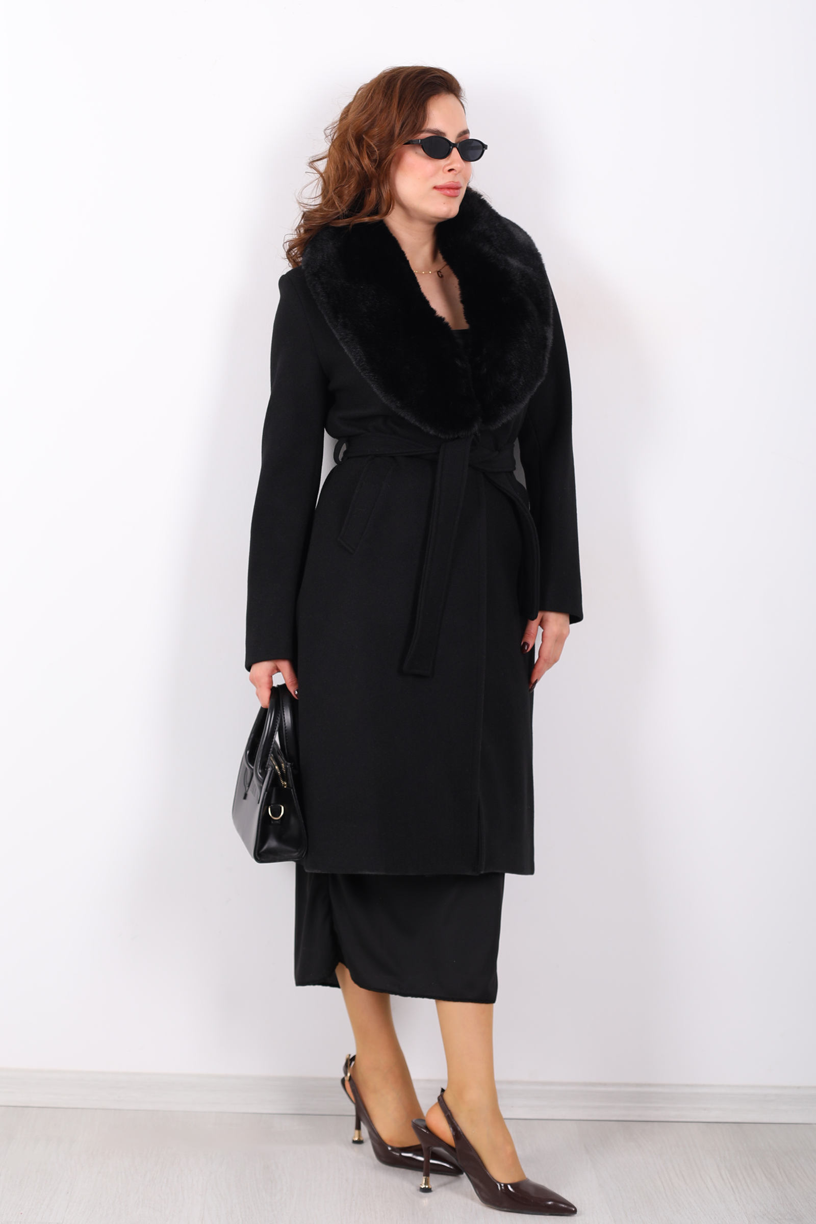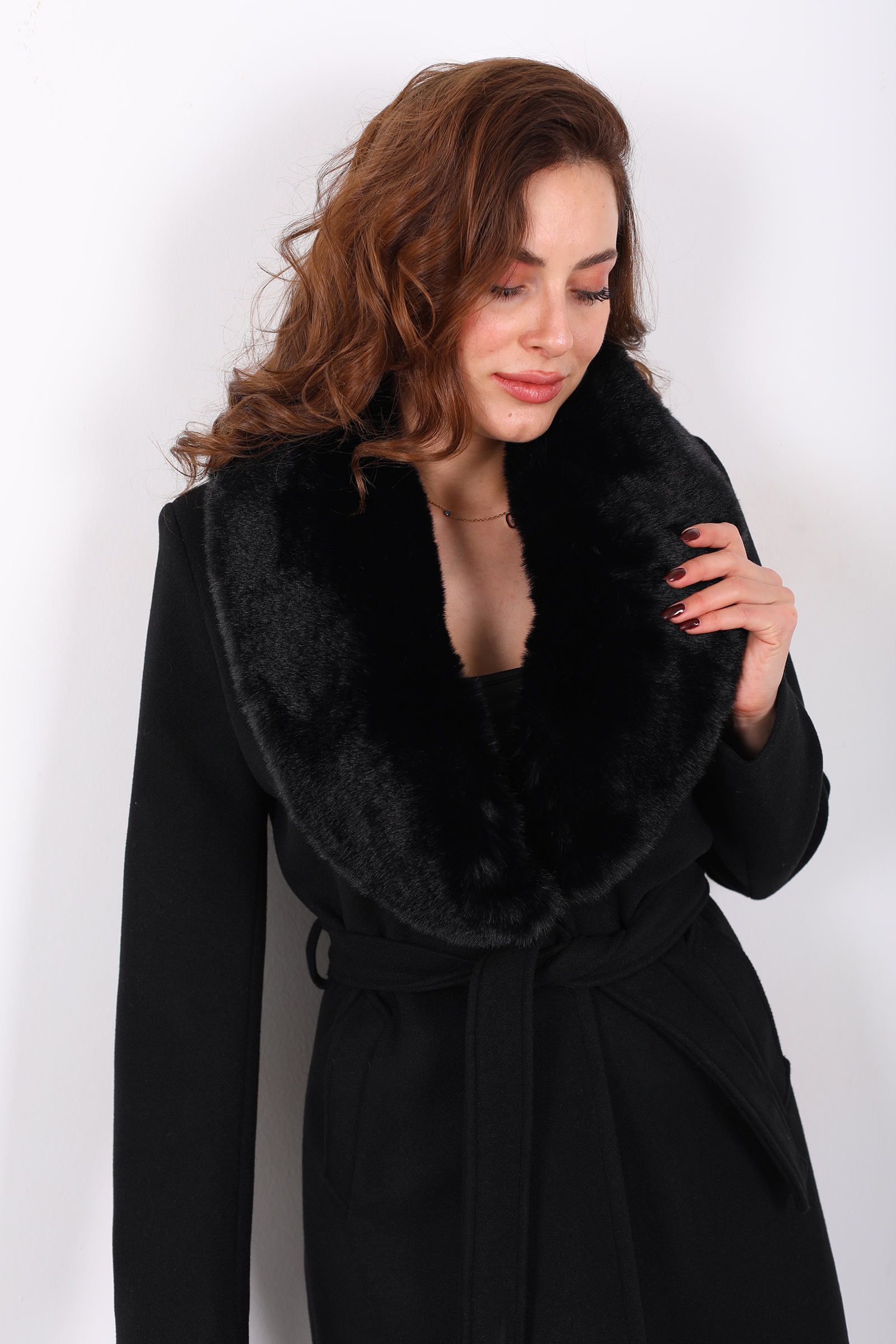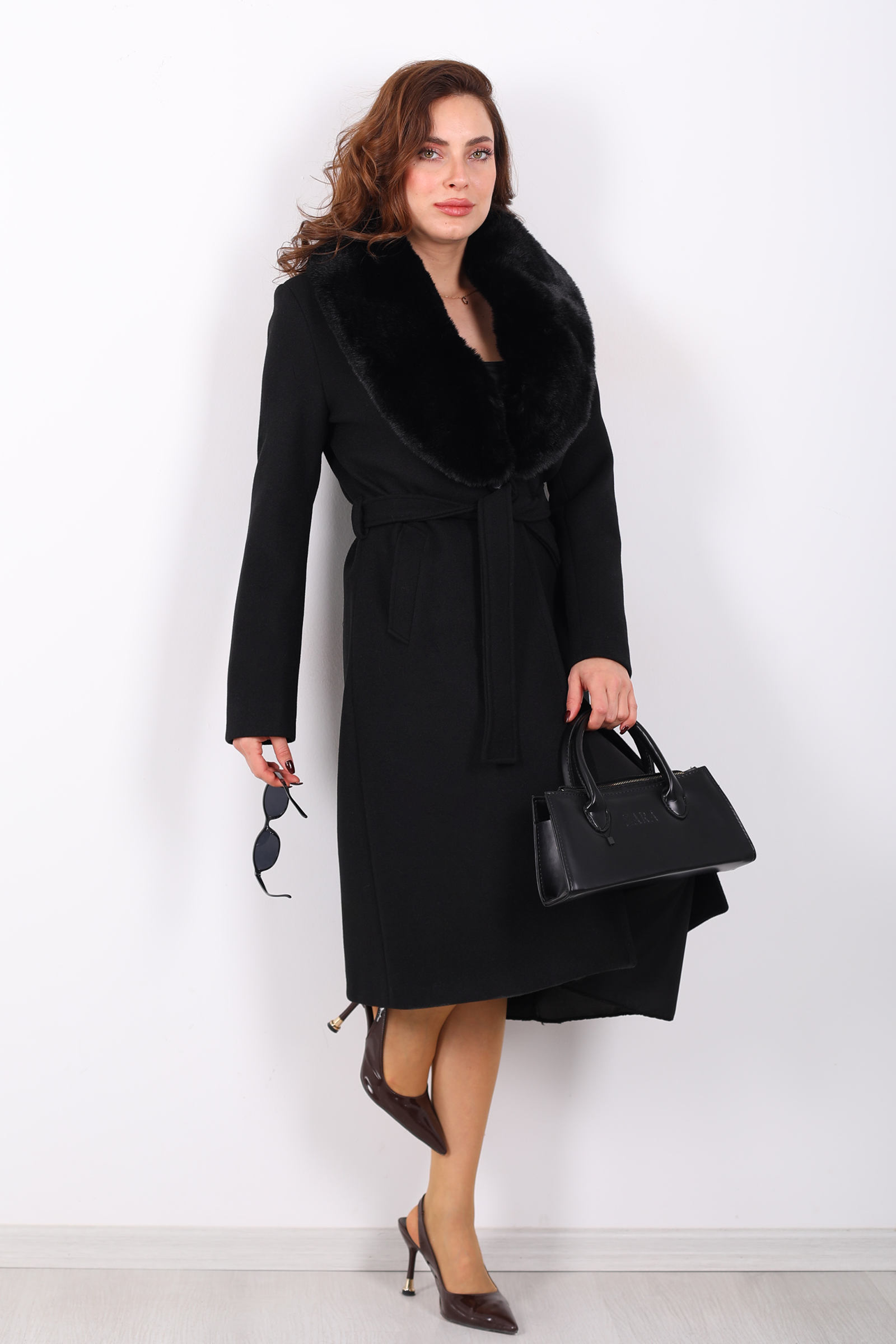 Yakası Kürklü Siyah Kadın Kuşaklı Kaşe Kaban