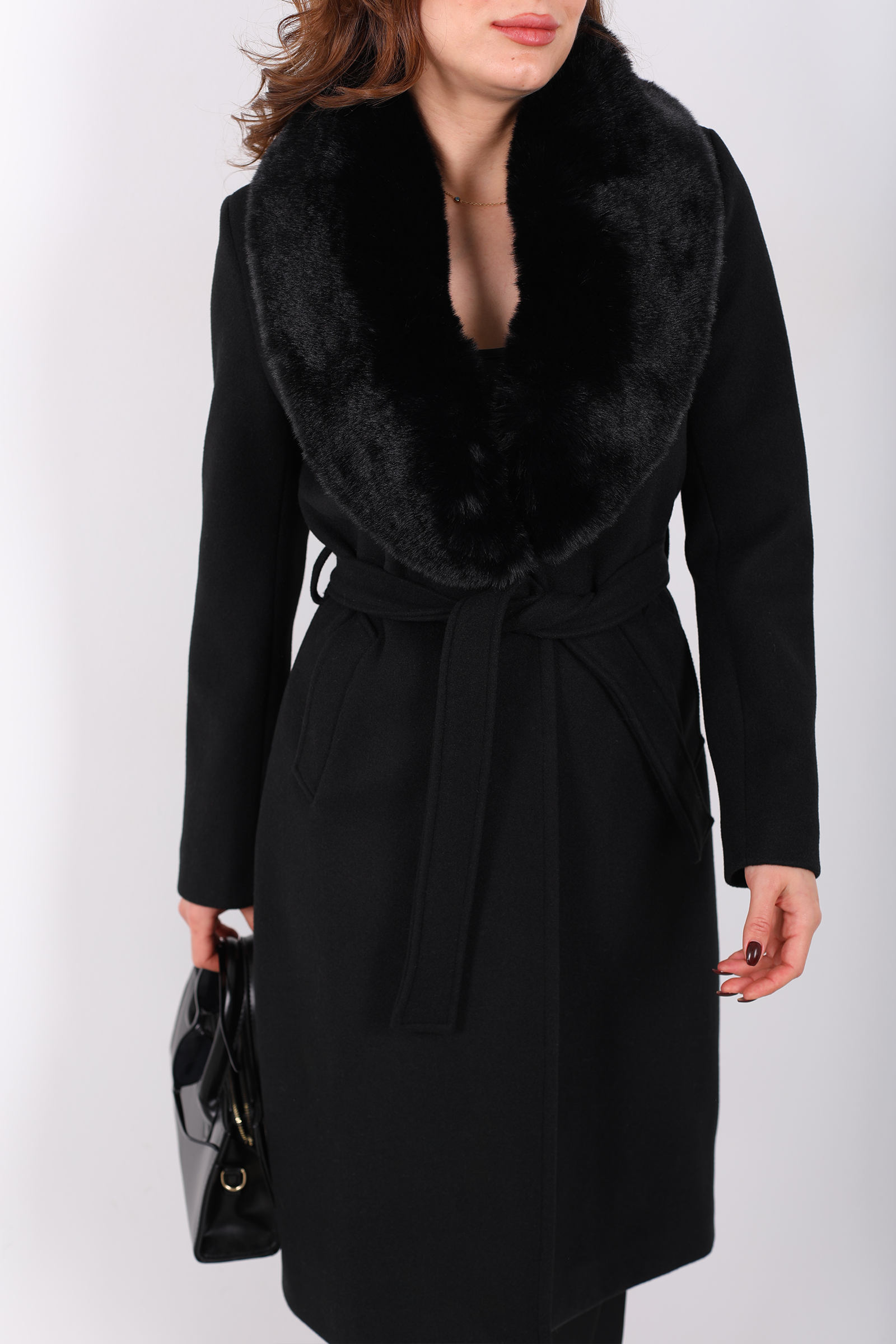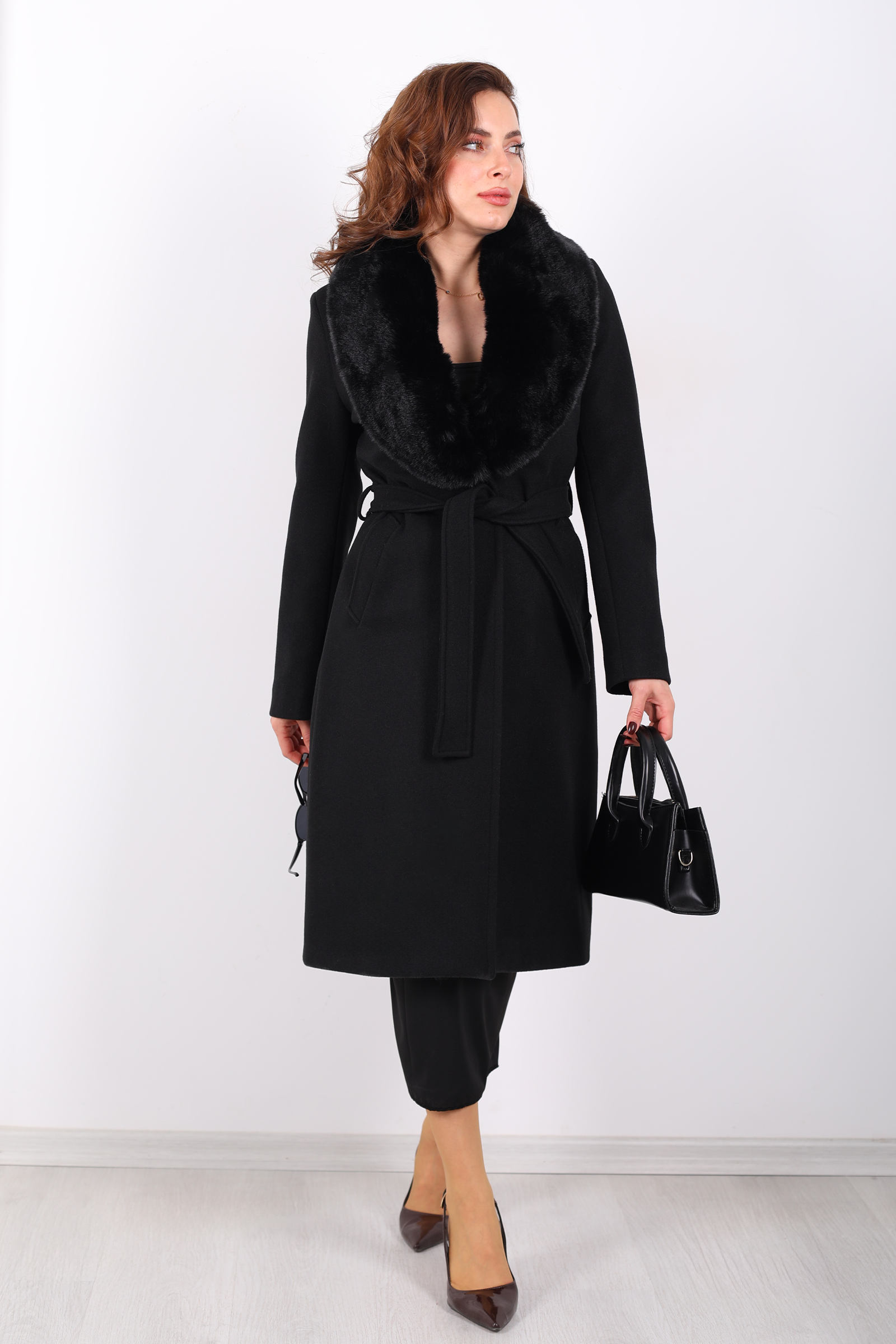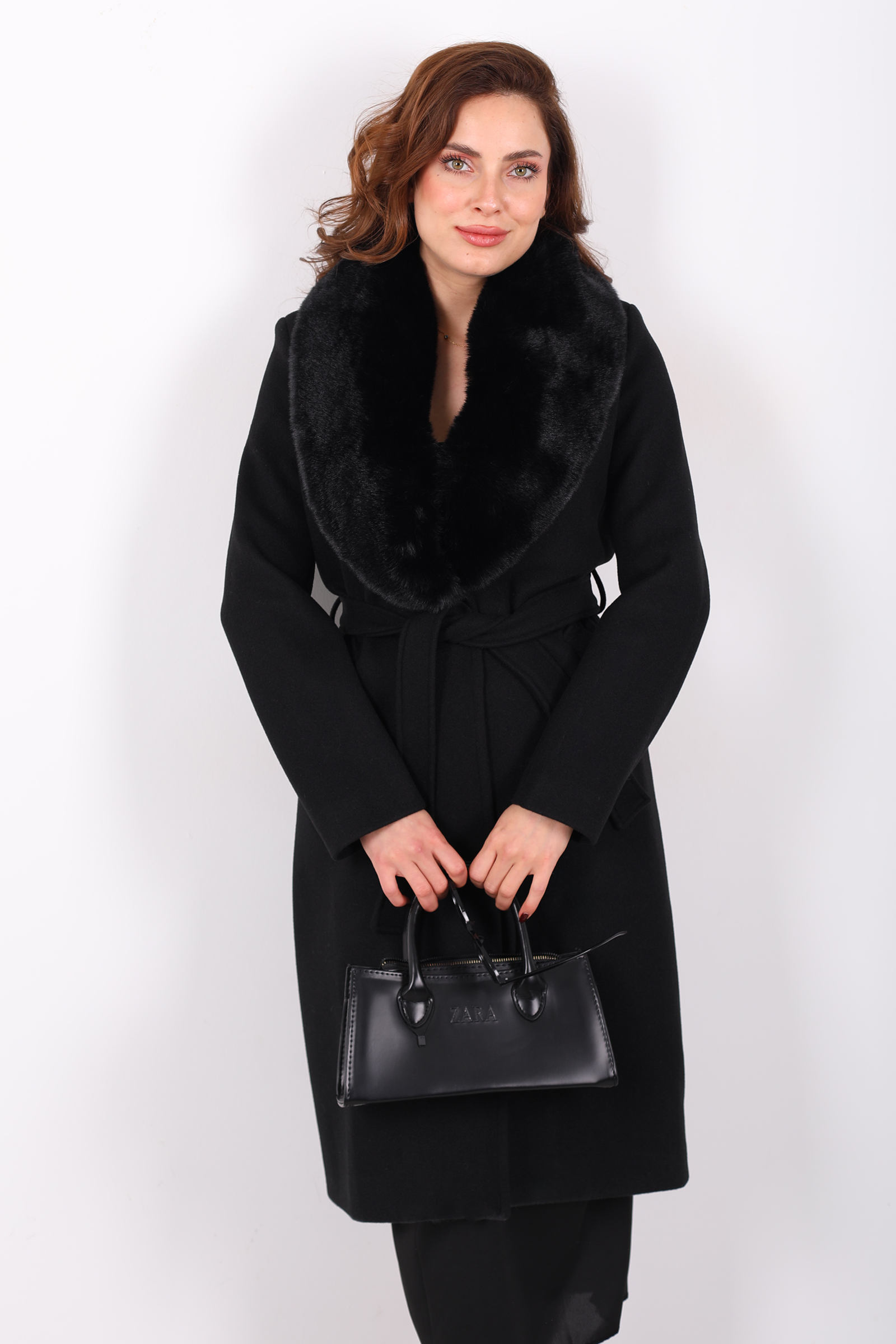 Yakası Kürklü Siyah Kadın Kuşaklı Kaşe Kaban