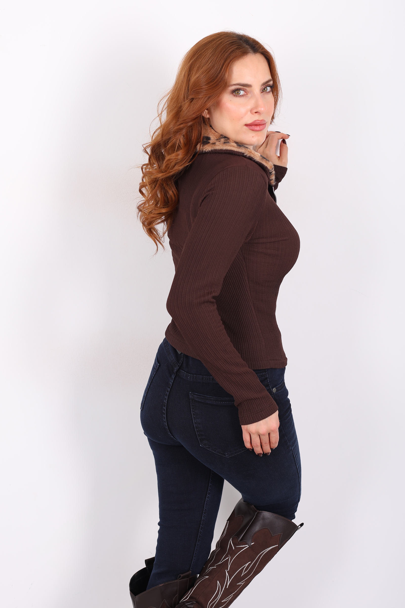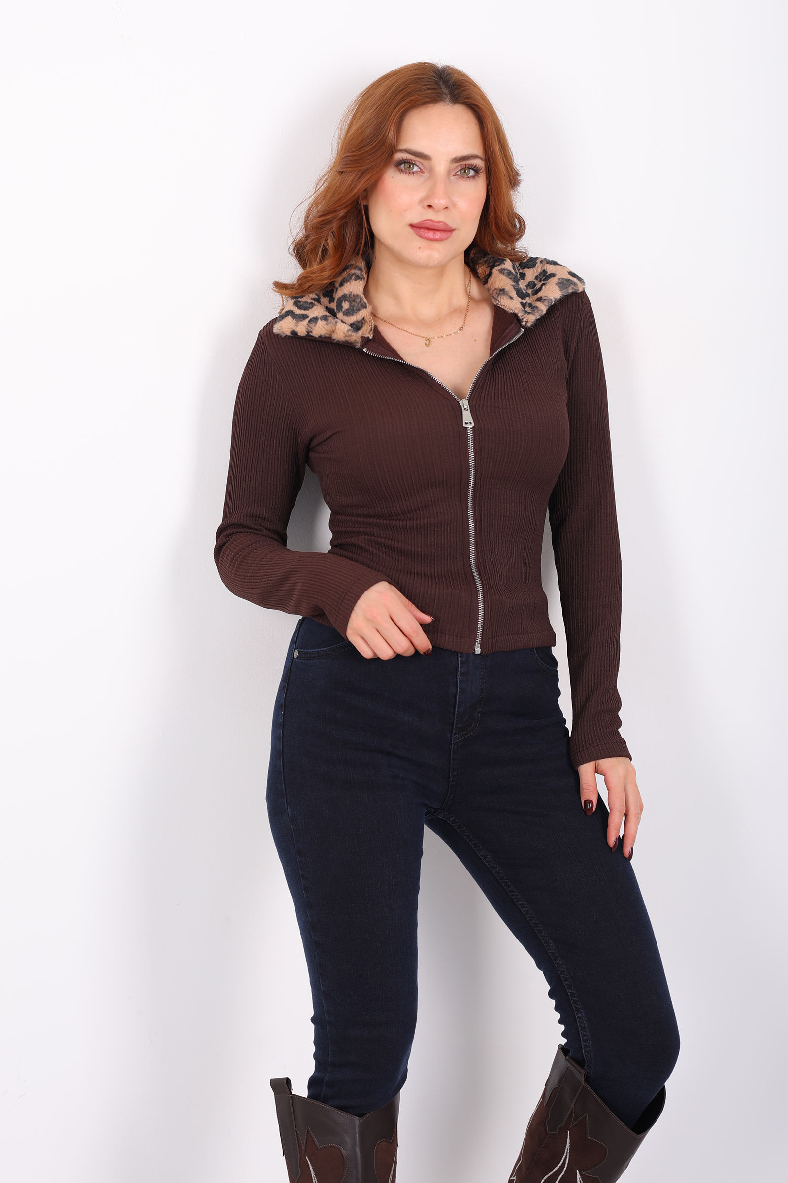 Yakası Leopar Kürklü Kahverengi Kadın Fitilli Ceket