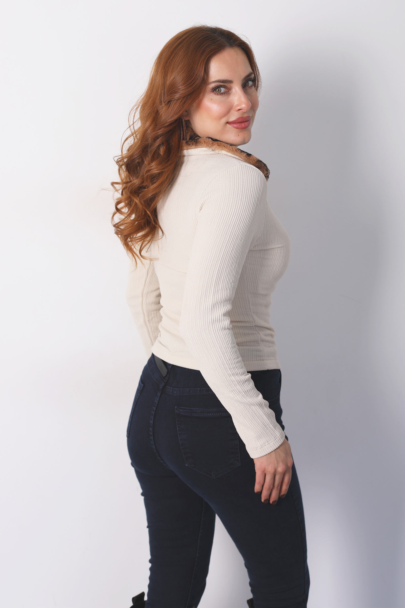 Yakası Leopar Kürklü Krem Kadın Fitilli Ceket