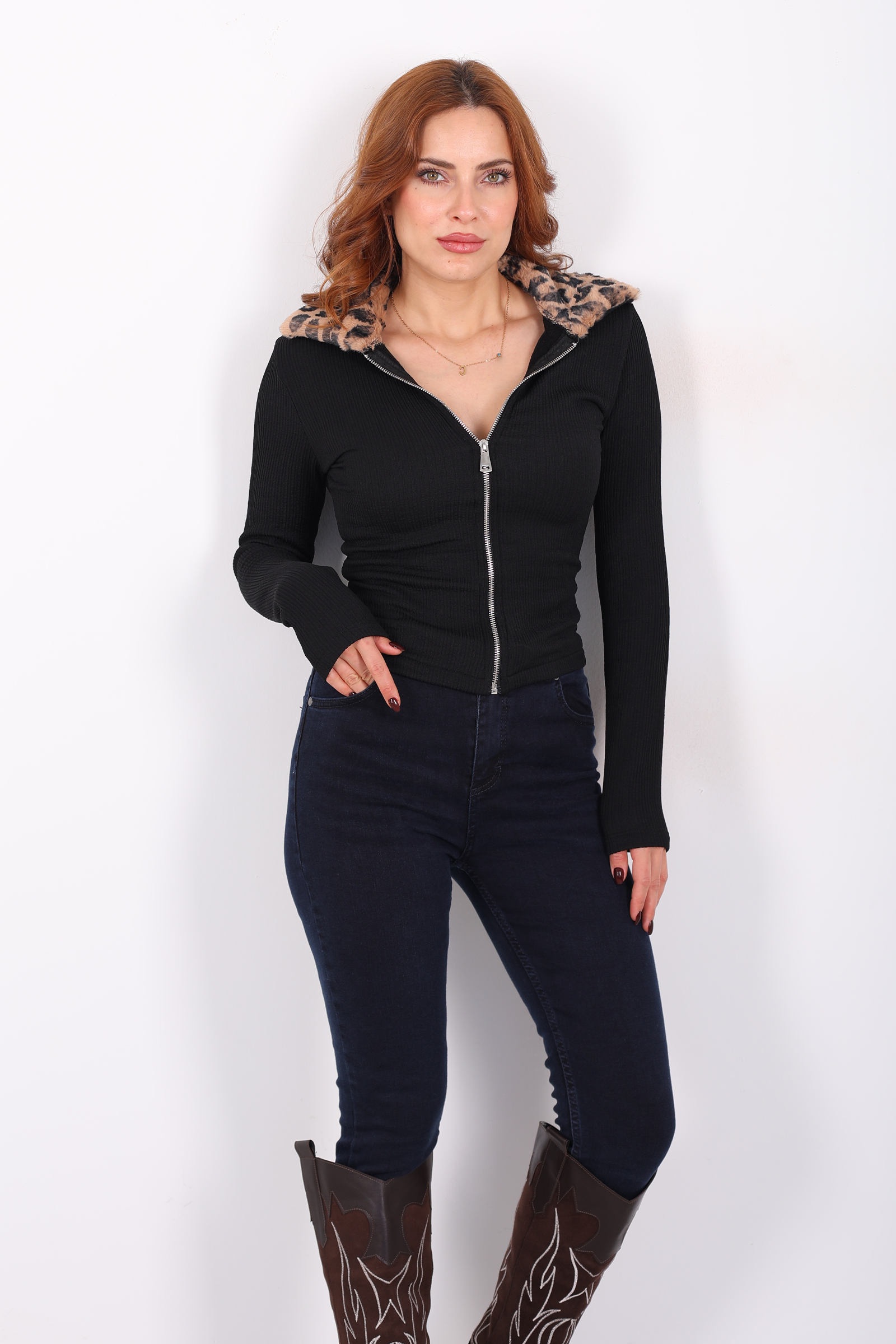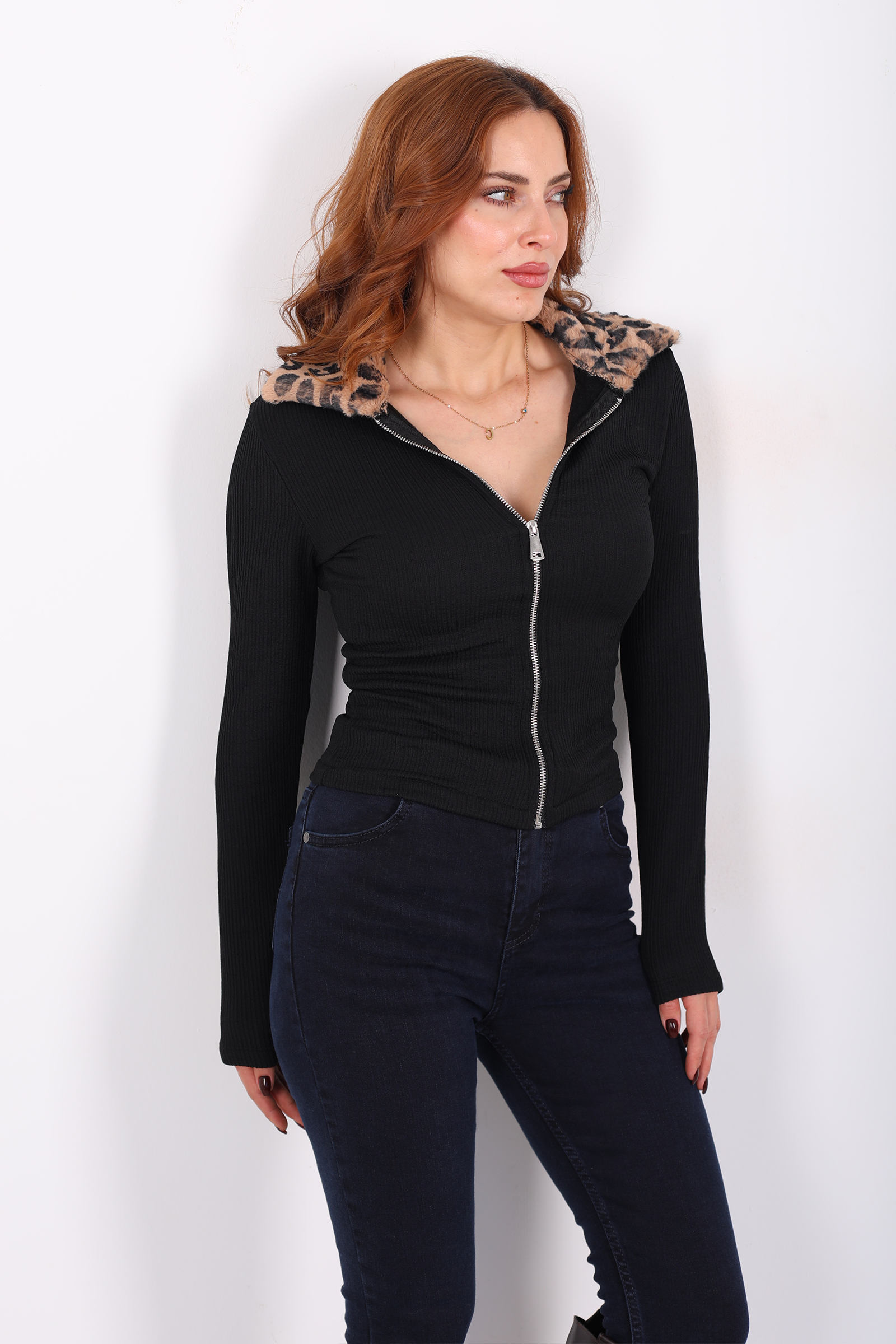 Yakası Leopar Kürklü Siyah Kadın Fitilli Ceket