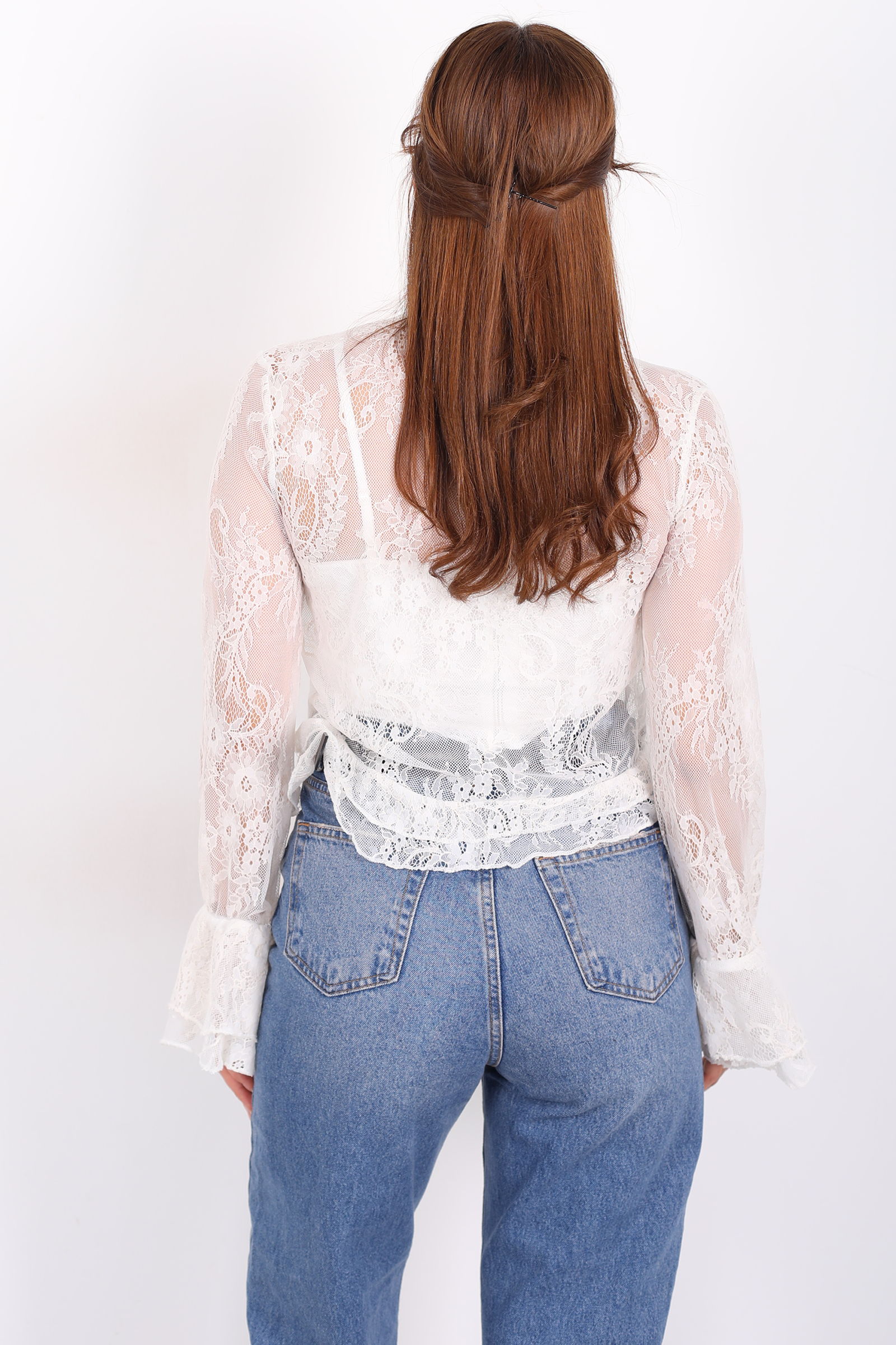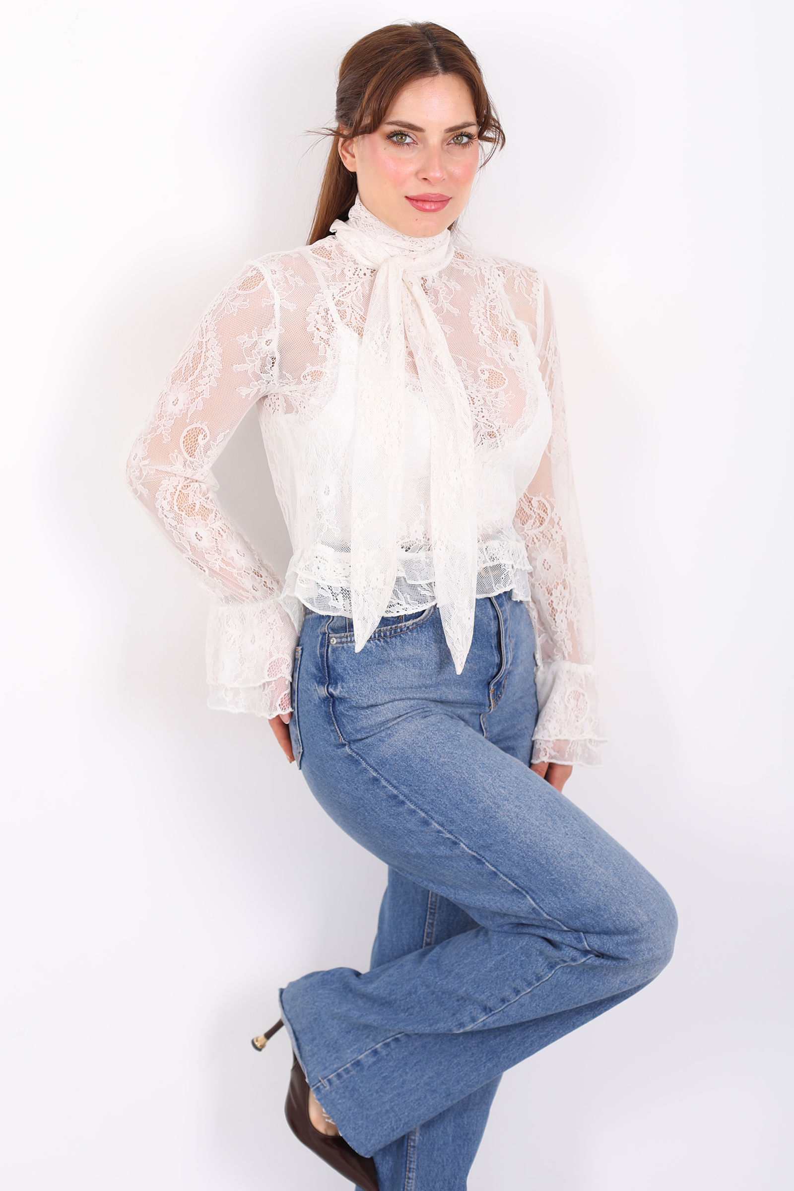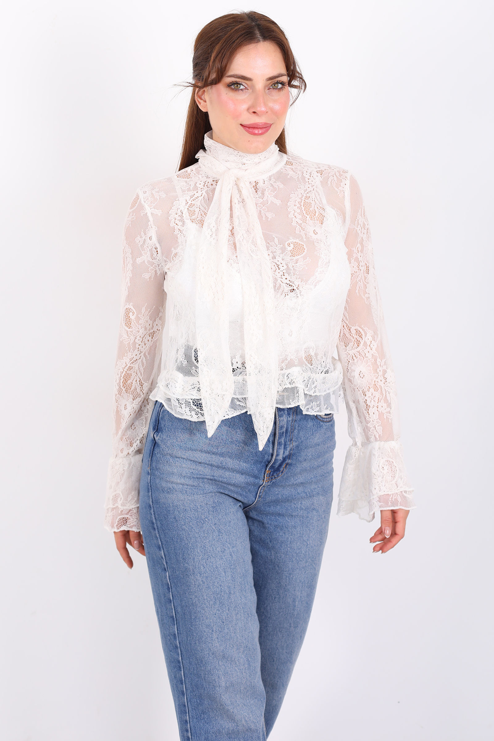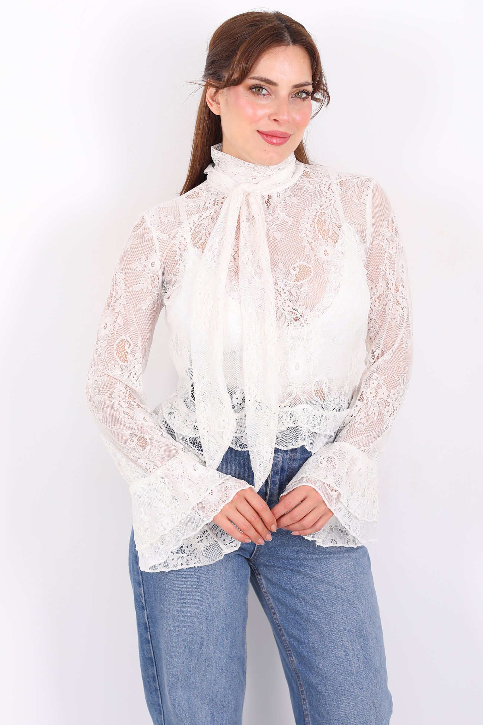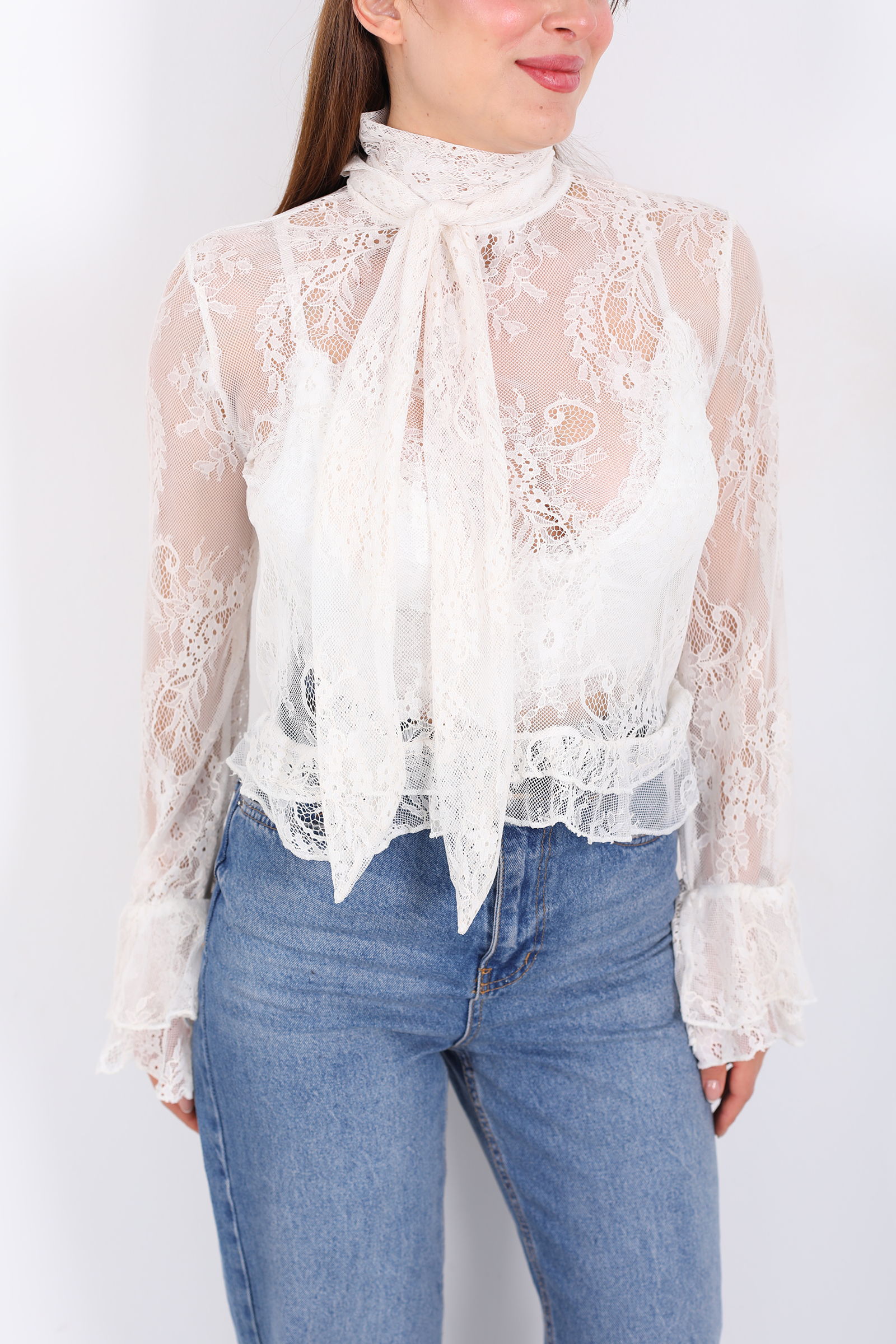 Yakası Şal Bağlamalı Fırfır Detaylı Ekru Kadın Dantel Bluz