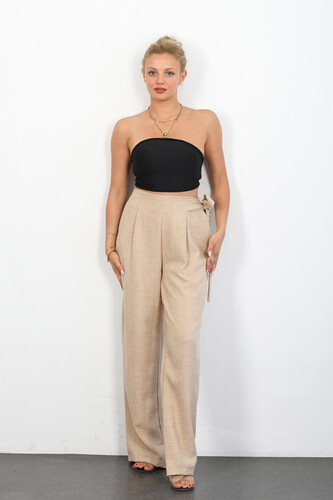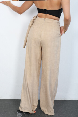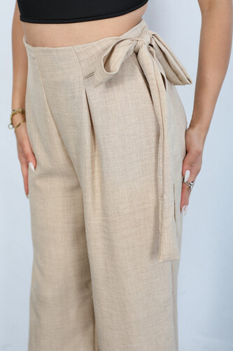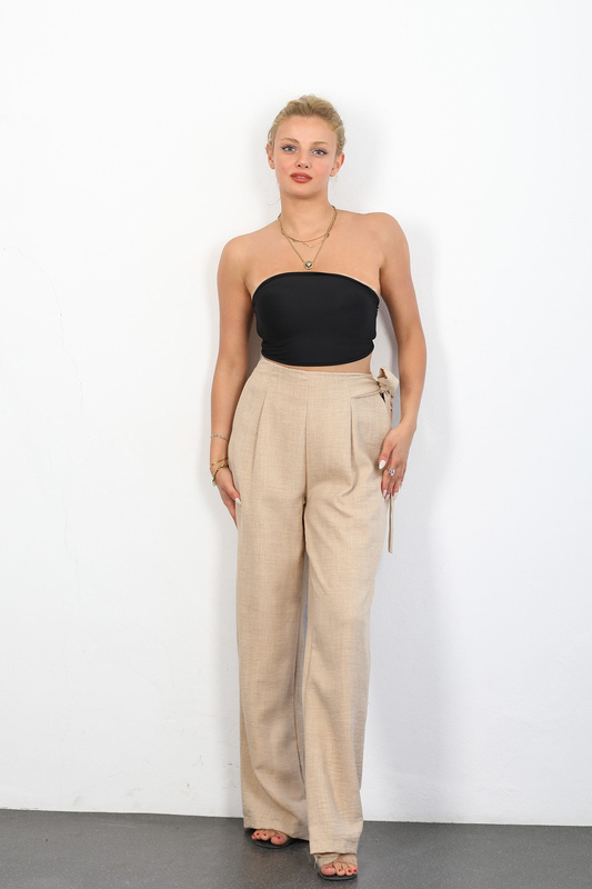Minimal şıklığı ve zarif detaylarıyla öne çıkan bu pantolon, modern şehirli kadının gardırobunda mutlaka bulunması gereken bir parça. Yüksek bel tasarımı, belinizi zarifçe sararken, yan bağlamalı kemer detayıyla kişisel stilinizi yansıtmanıza olanak tanır. Pensli kesimi, pantolona klasik bir dokunuş katarken, bol paça formu hareket özgürlüğü ve rahatlık sunar. Taş rengi, nötr tonlarıyla farklı renklerle kolayca kombinlenebilir ve her ortamda şıklığınızı ön plana çıkarır. Günlük ofis kombinlerinden şık akşam davetlerine kadar geniş bir kullanım alanı sunar.