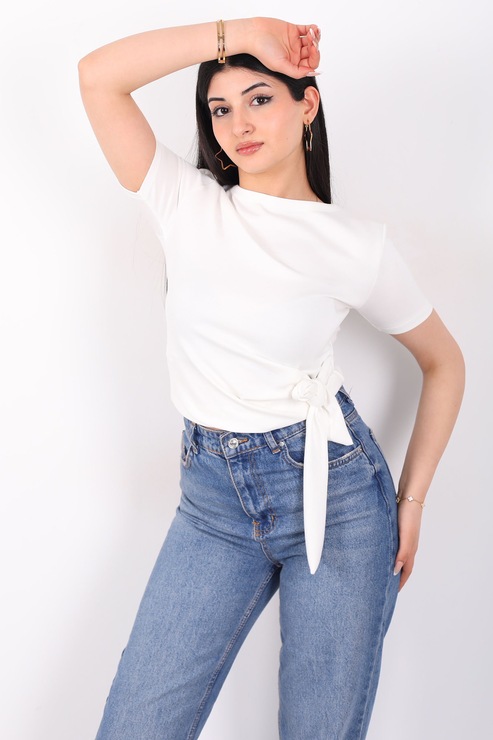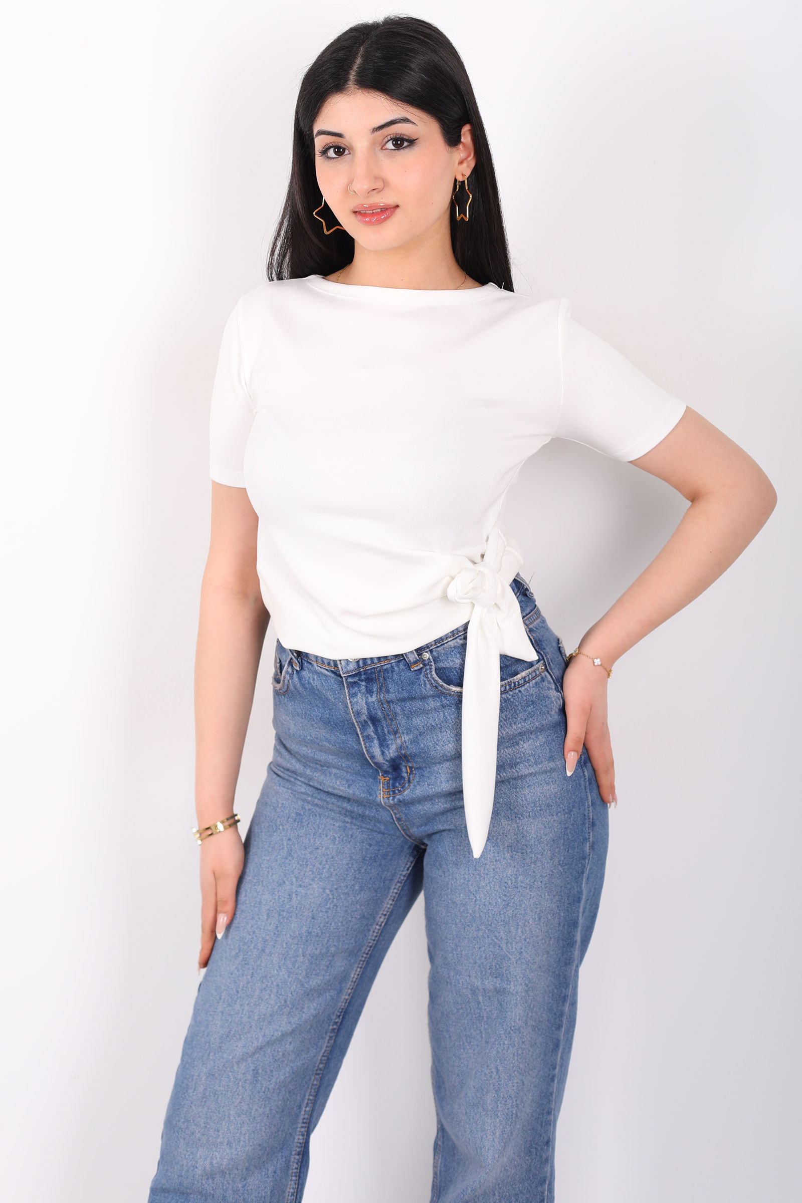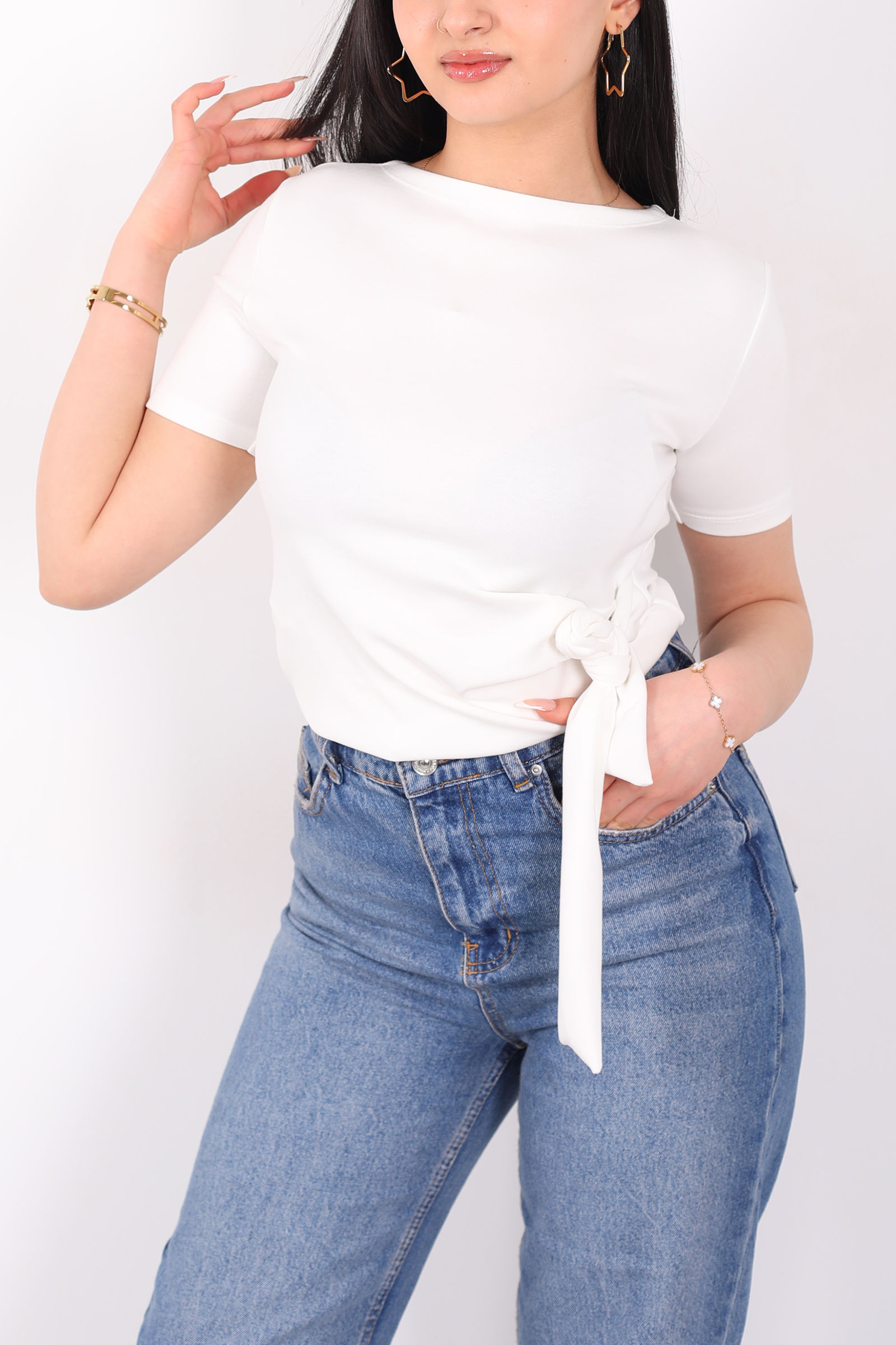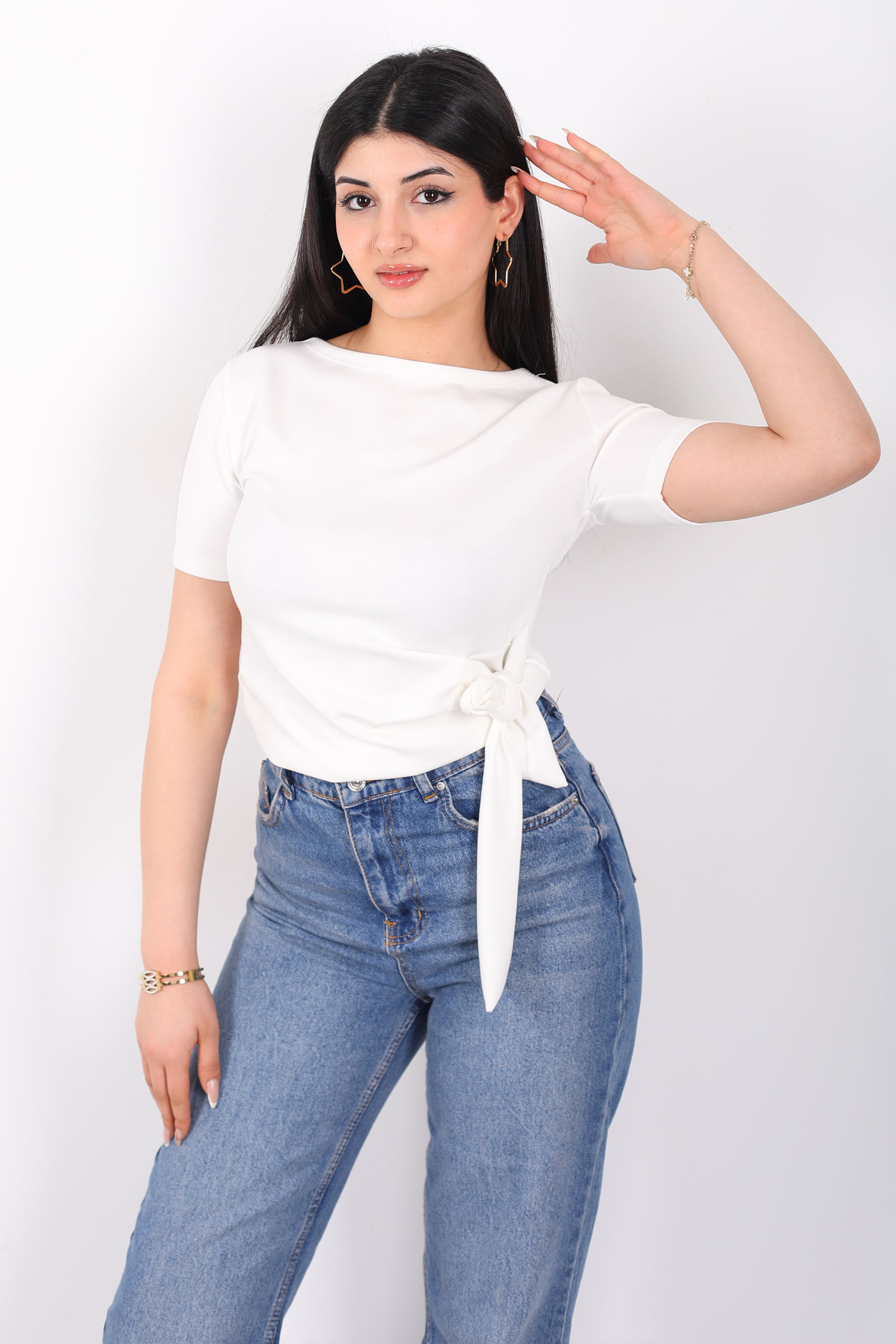 Yandan Bağlamalı Bisiklet Yaka Beyaz Kadın Bluz