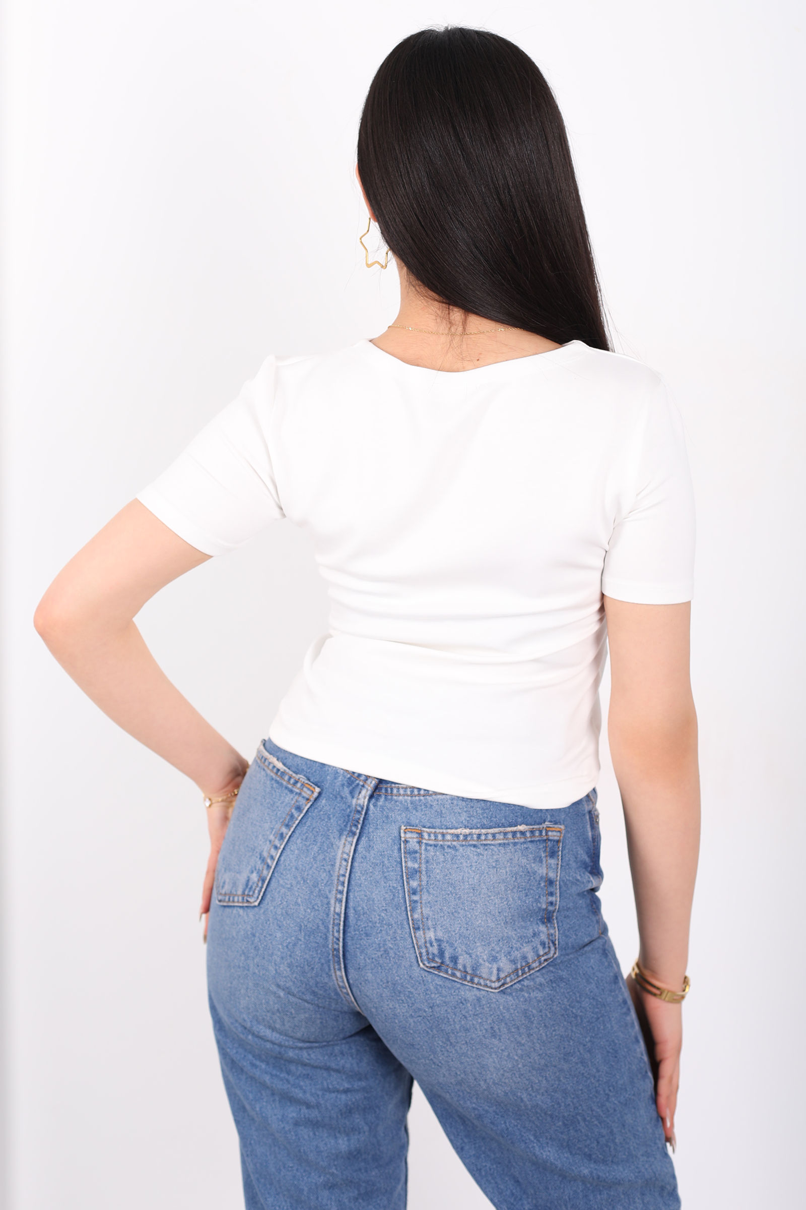 V Yaka Sahte Cepli Düğme Detaylı Beyaz Kadın Bluz