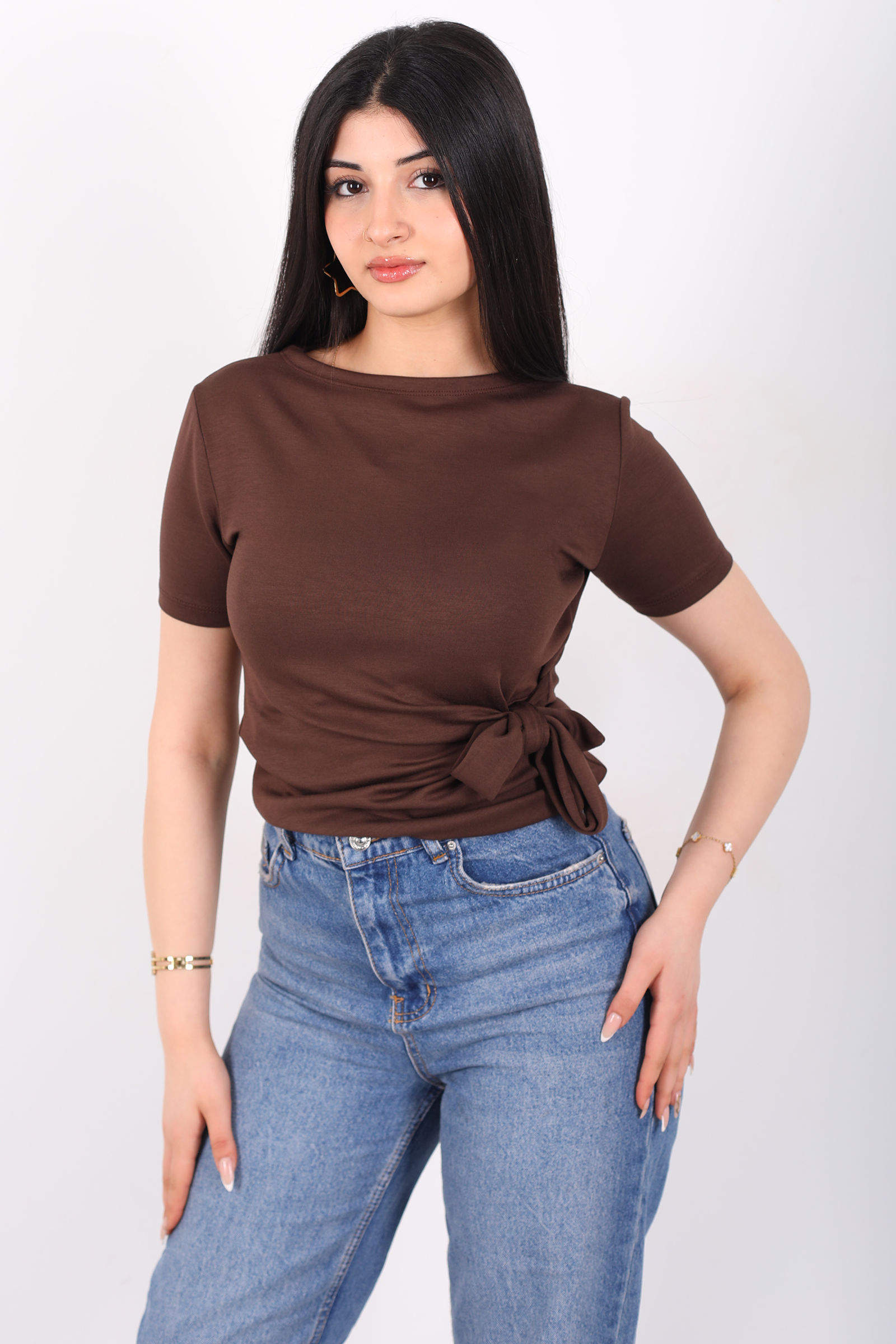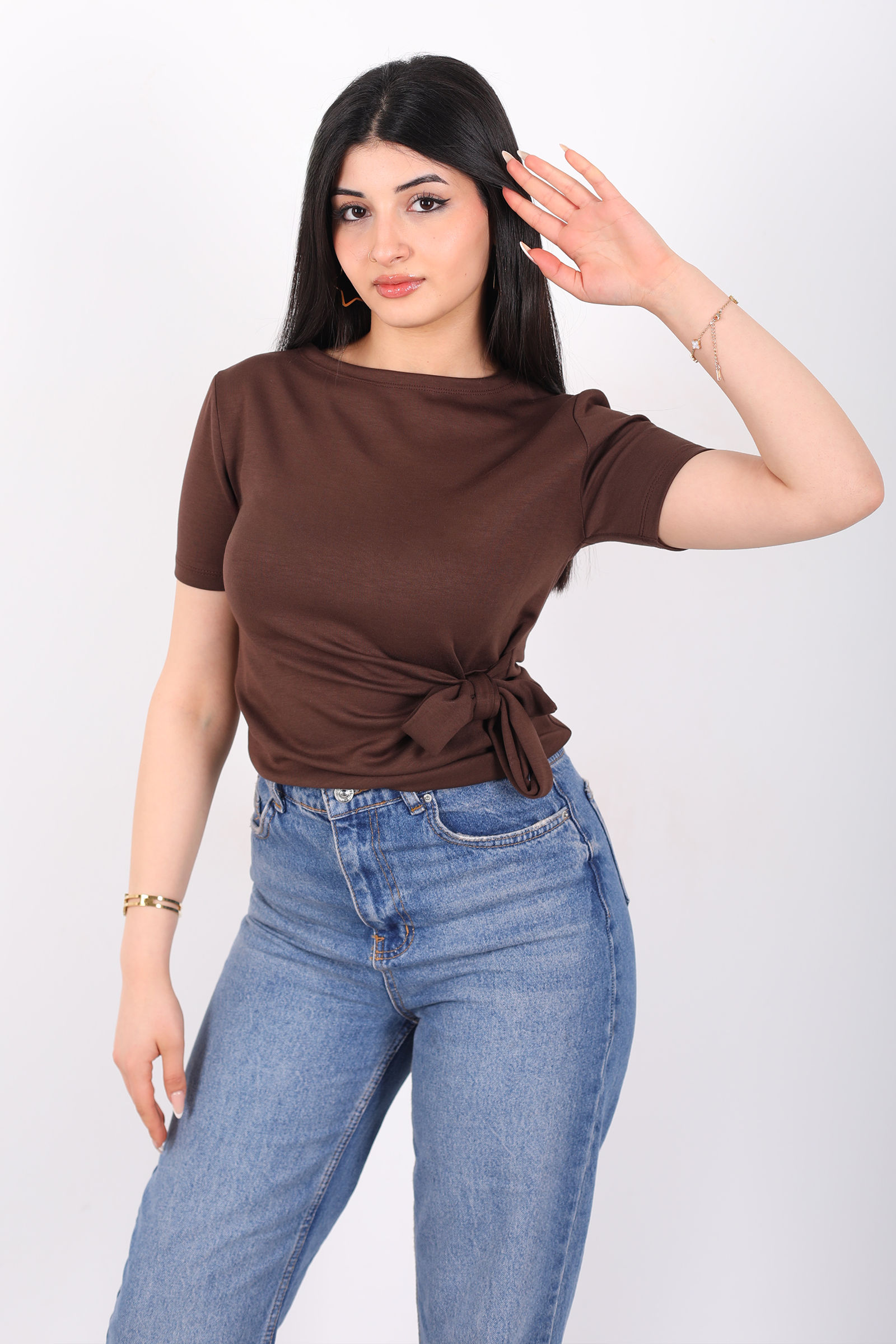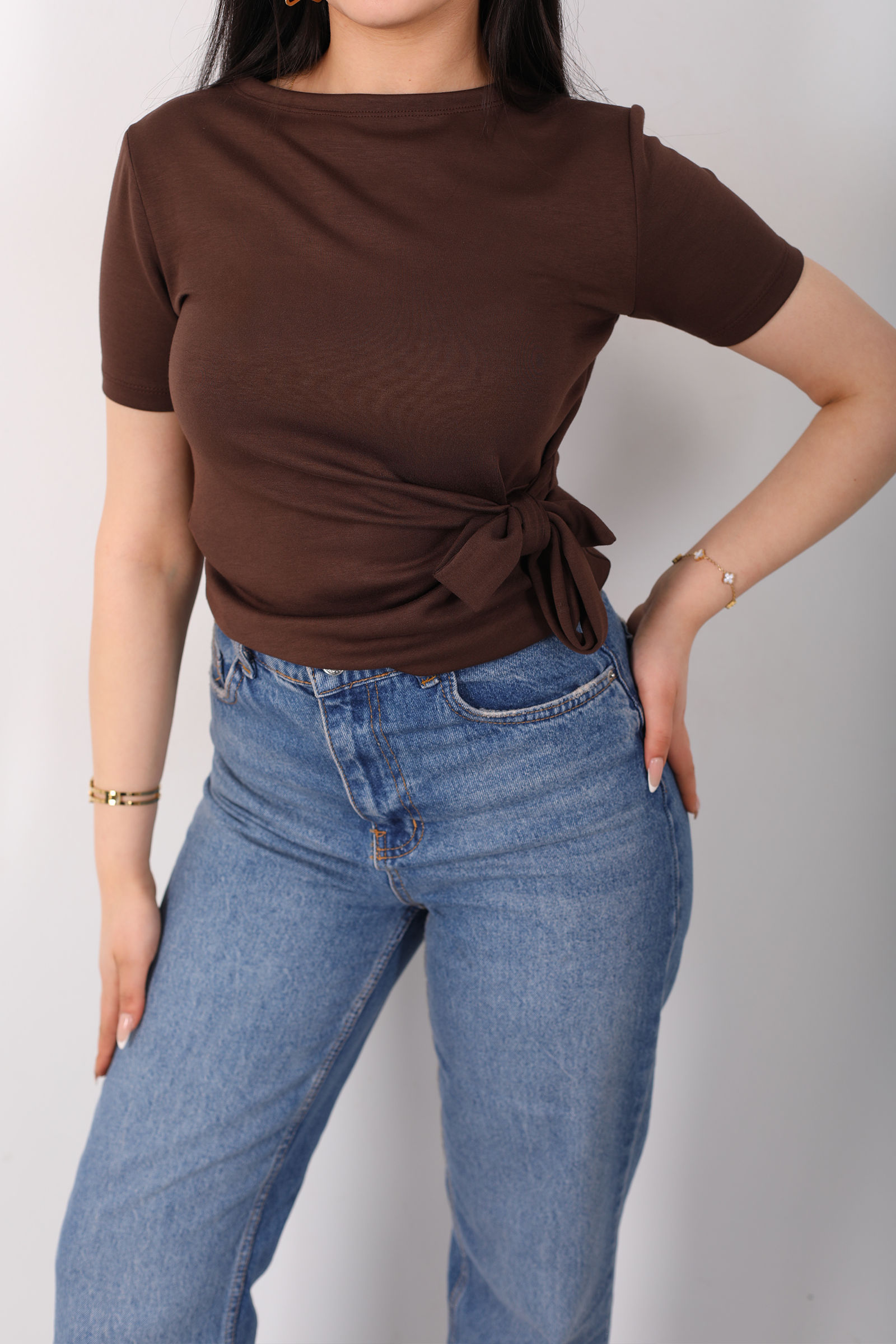 Yandan Bağlamalı Bisiklet Yaka Kahverengi Kadın Bluz