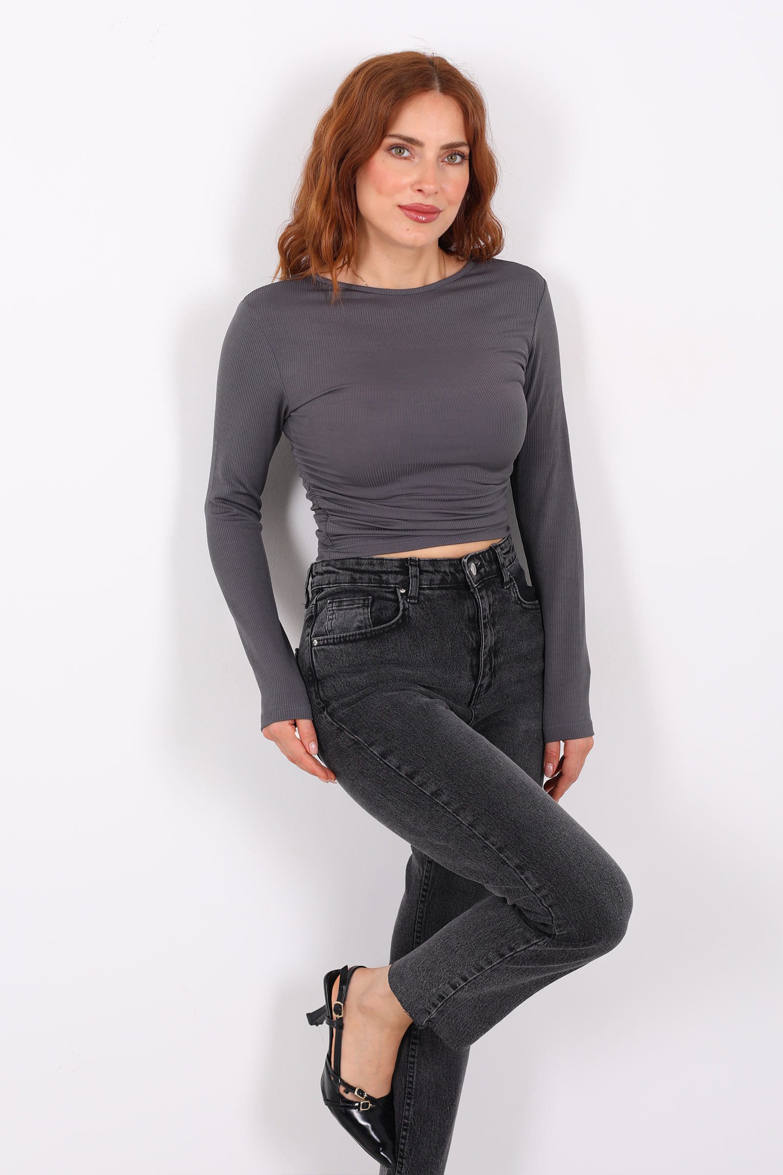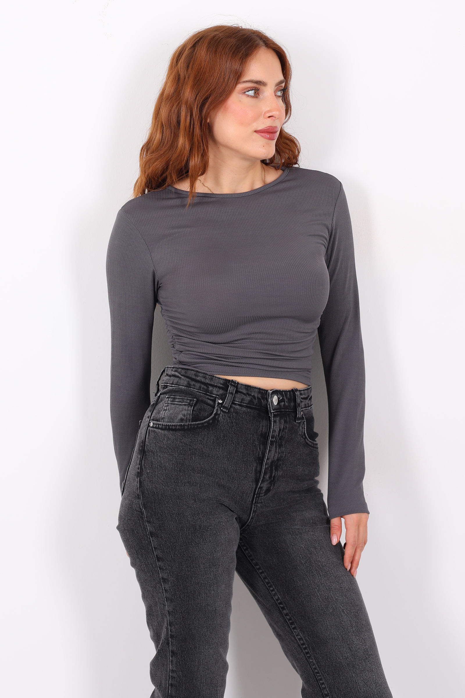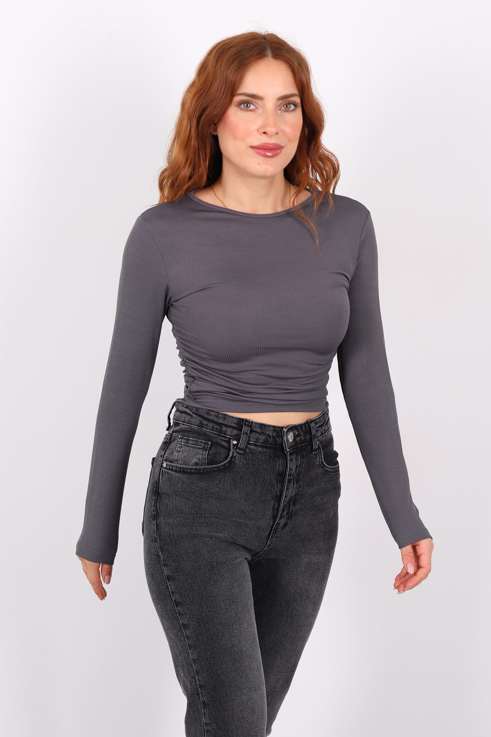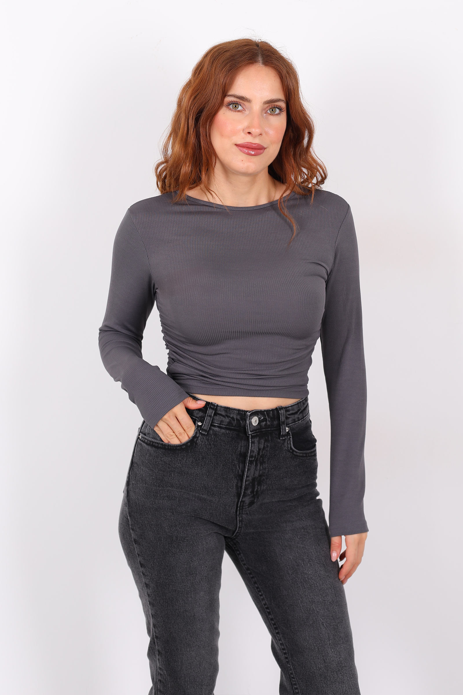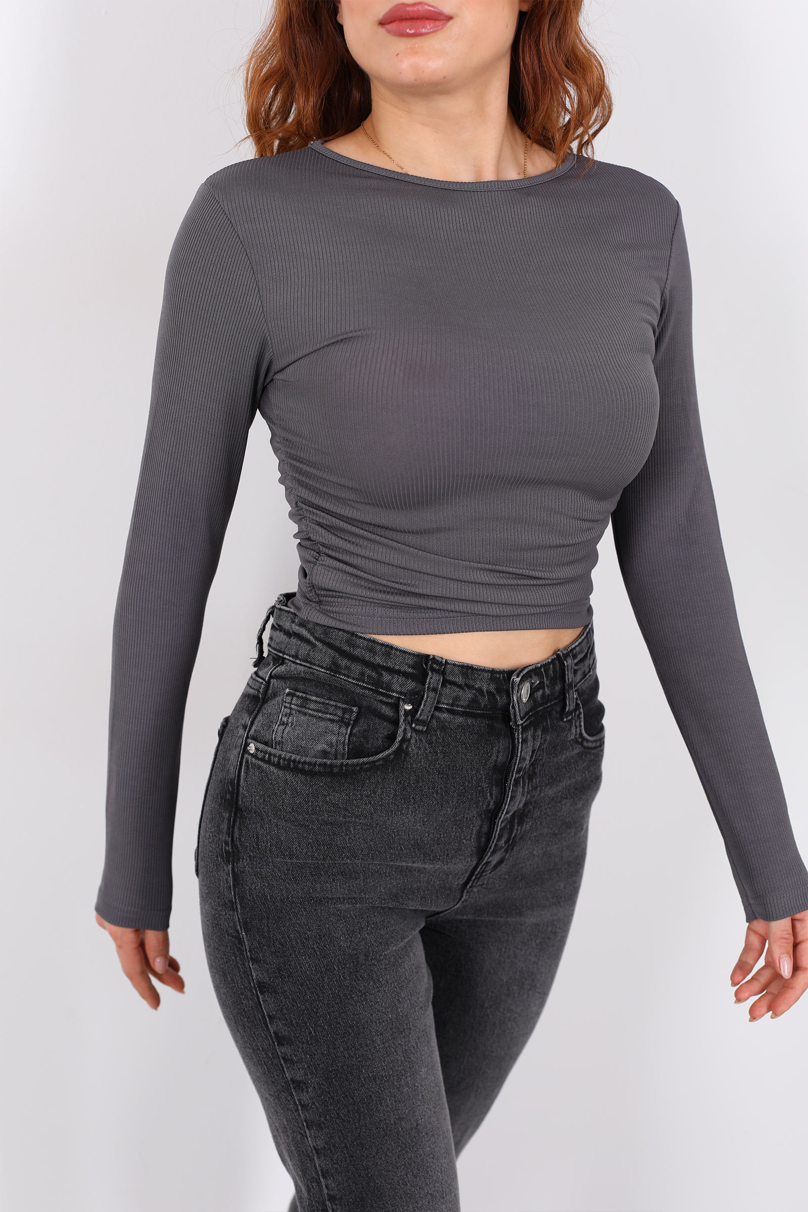 Gri tonlarının sofistike duruşu, yanlardaki büzgü detayı ile yeniden yorumlanıyor. Antrasit rengin derinliğini taşıyan bu bluz, hem zarif hem de güçlü bir karakter sunar. Yanlardaki büzgüler, kumaşa hacim ve hareket kazandırırken bele doğru zarif bir biçim verir bu sayede siluetiniz dengeli ve modern bir hâl alır.