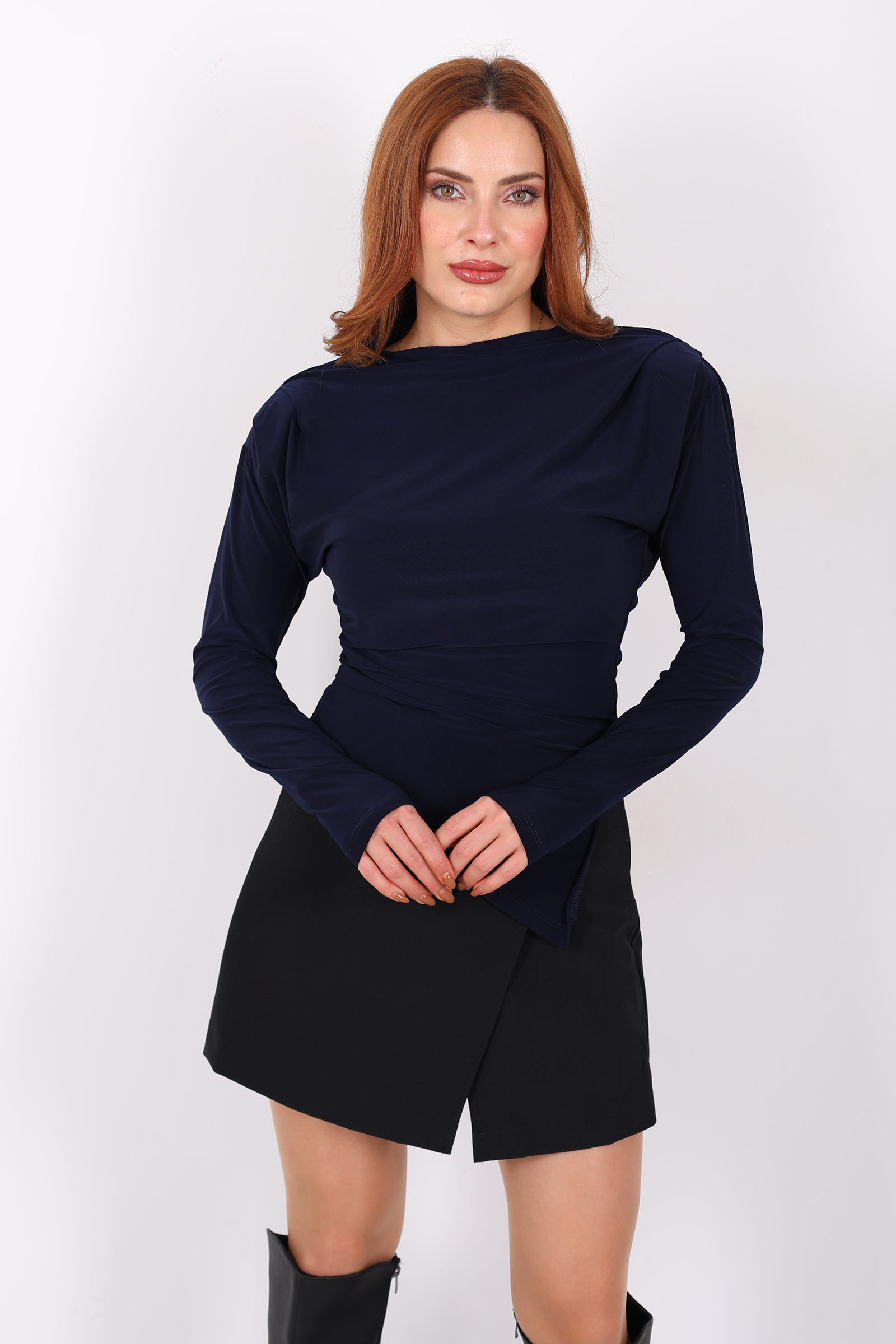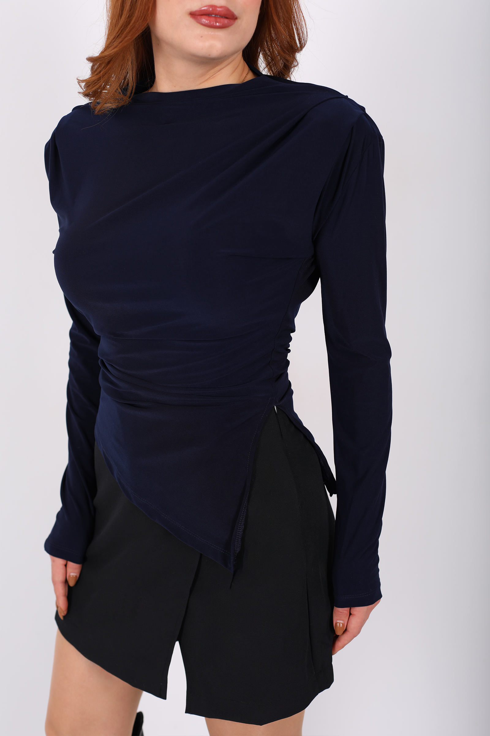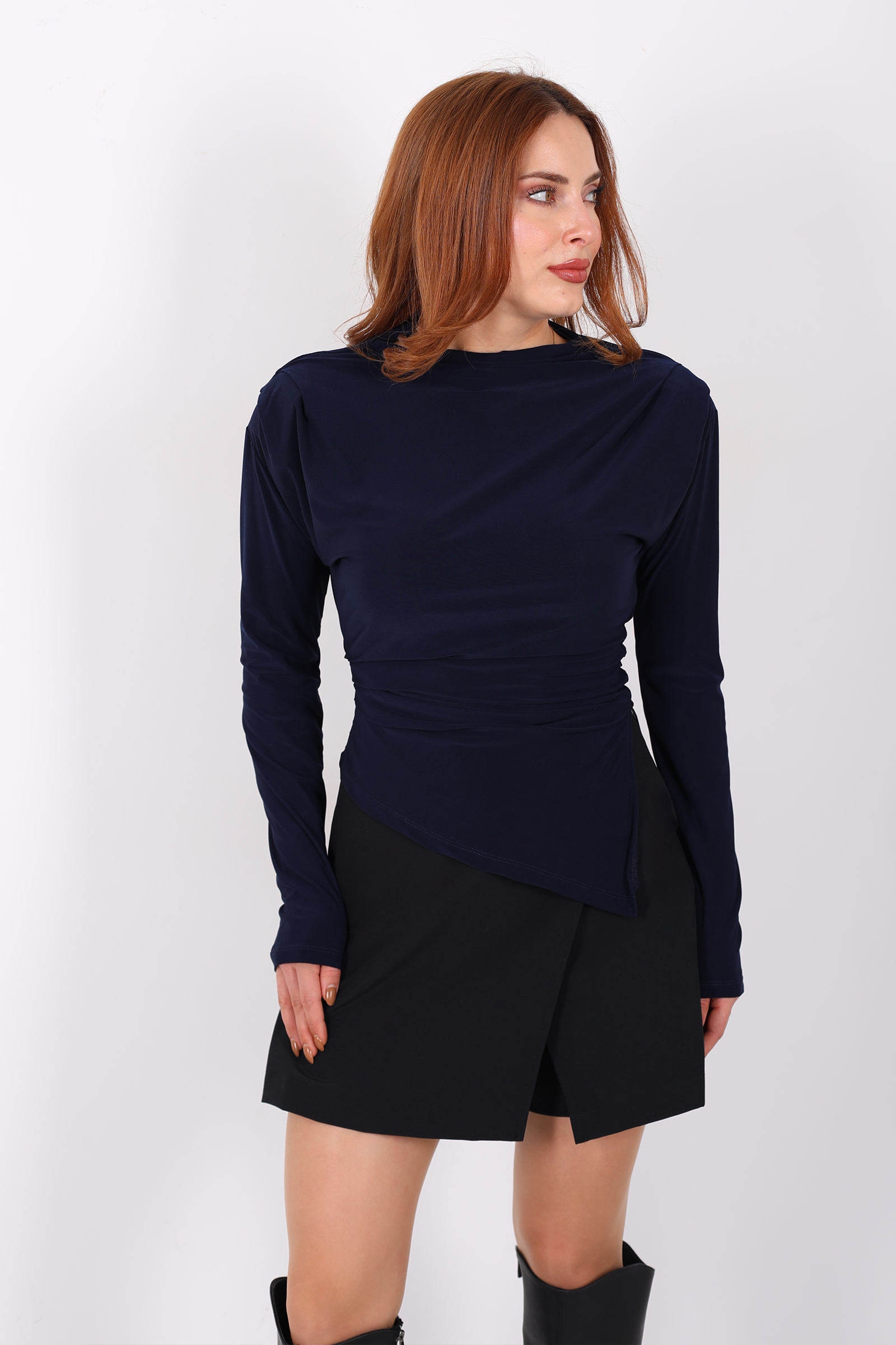 Yanı Büzgülü Asimetrik Lacivert Kadın Vatkalı Bluz