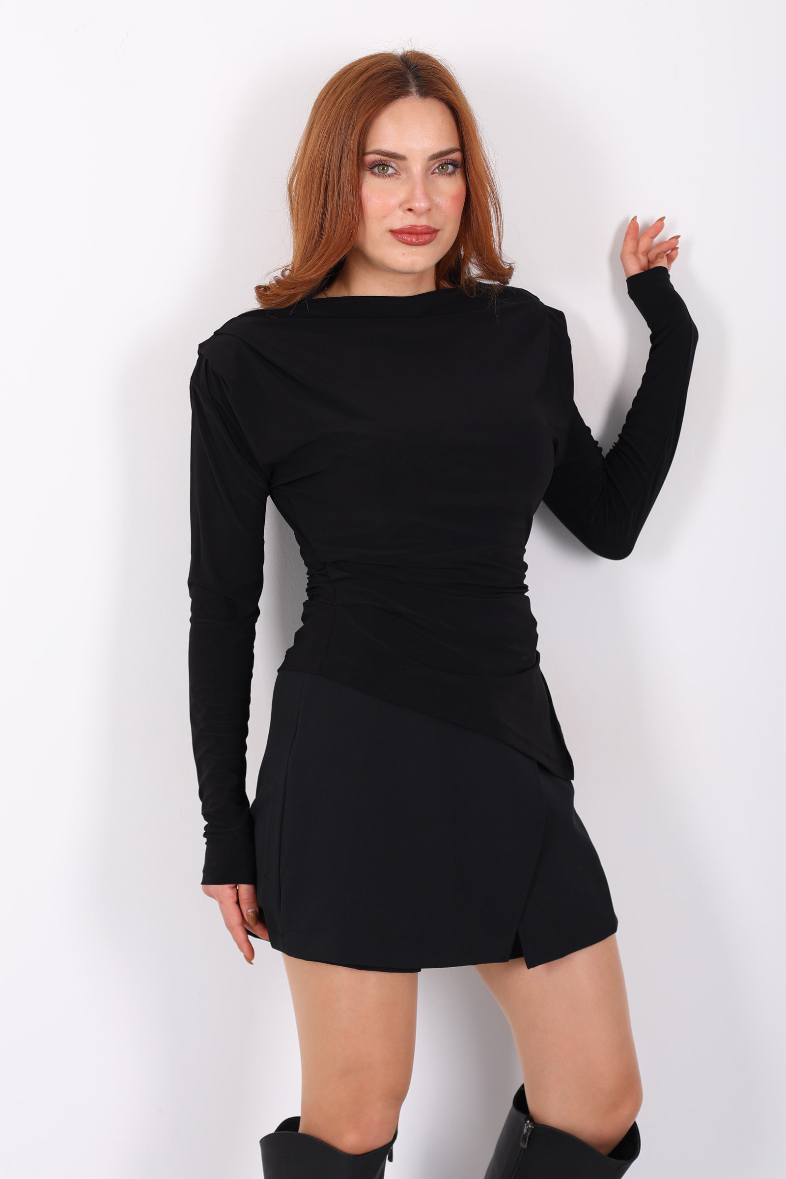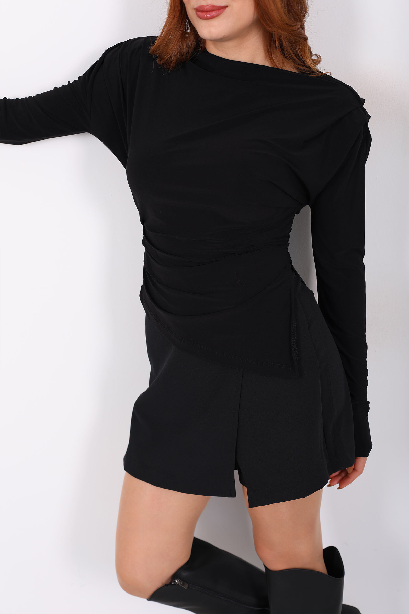 Yanı Büzgülü Asimetrik Siyah Kadın Vatkalı Bluz