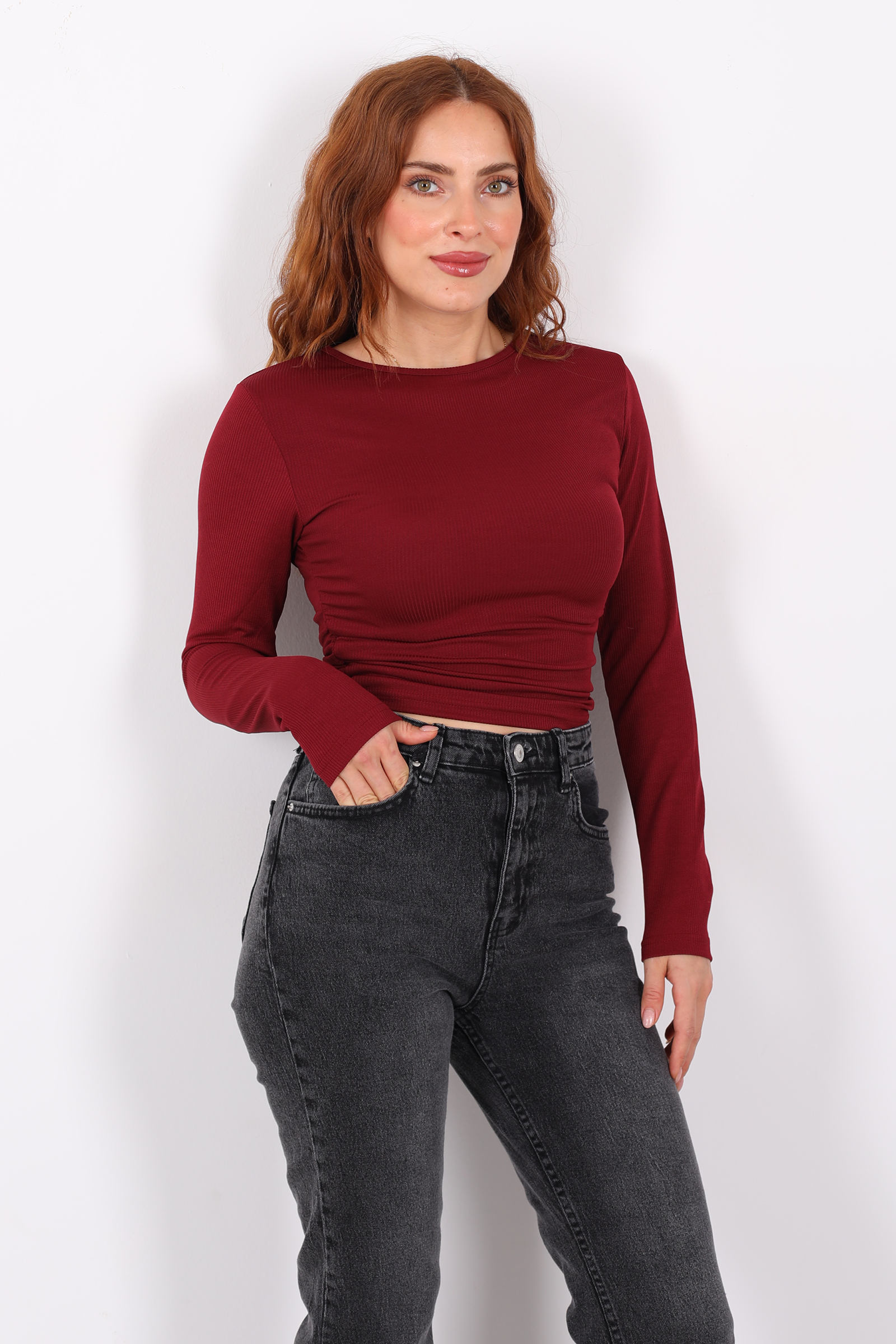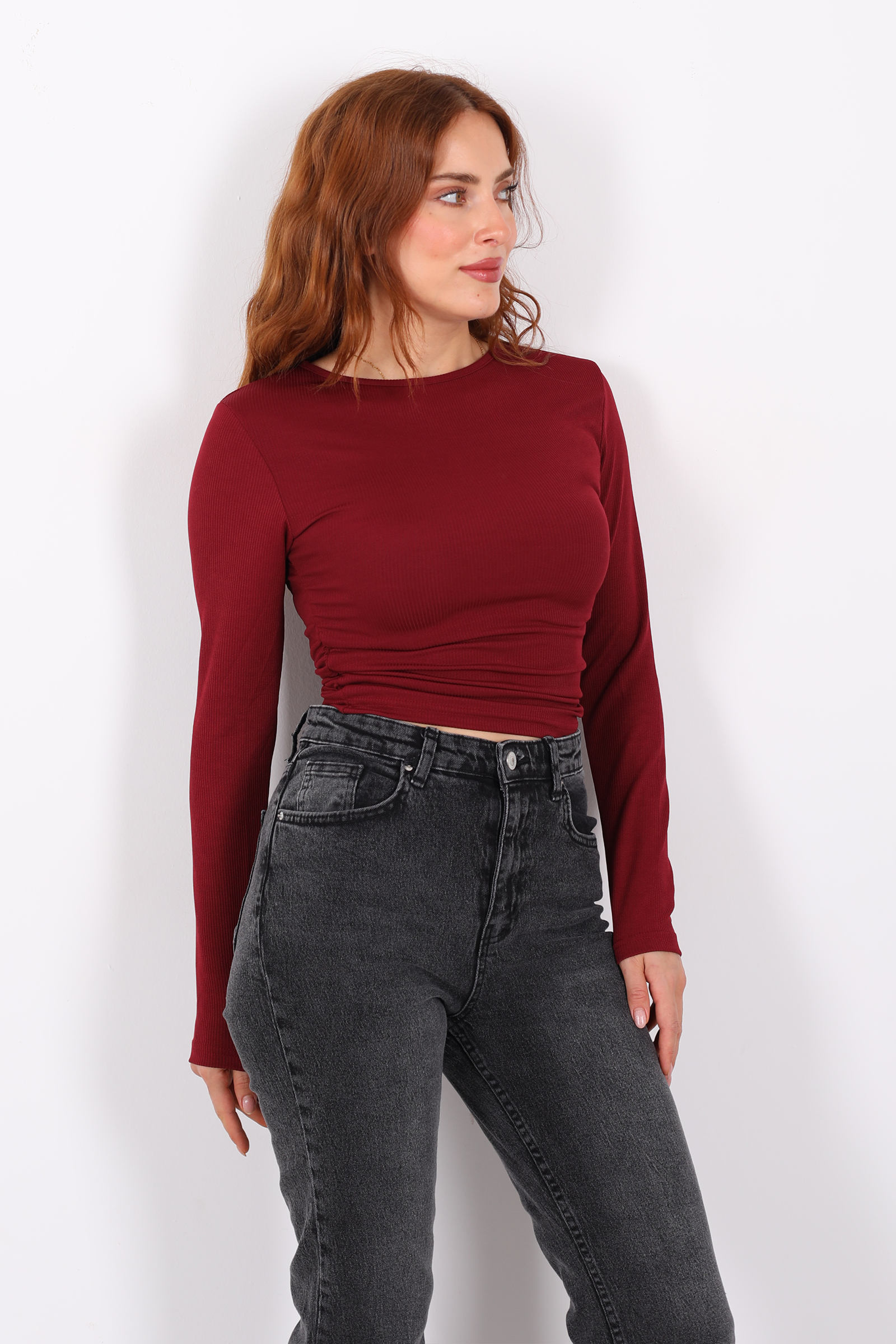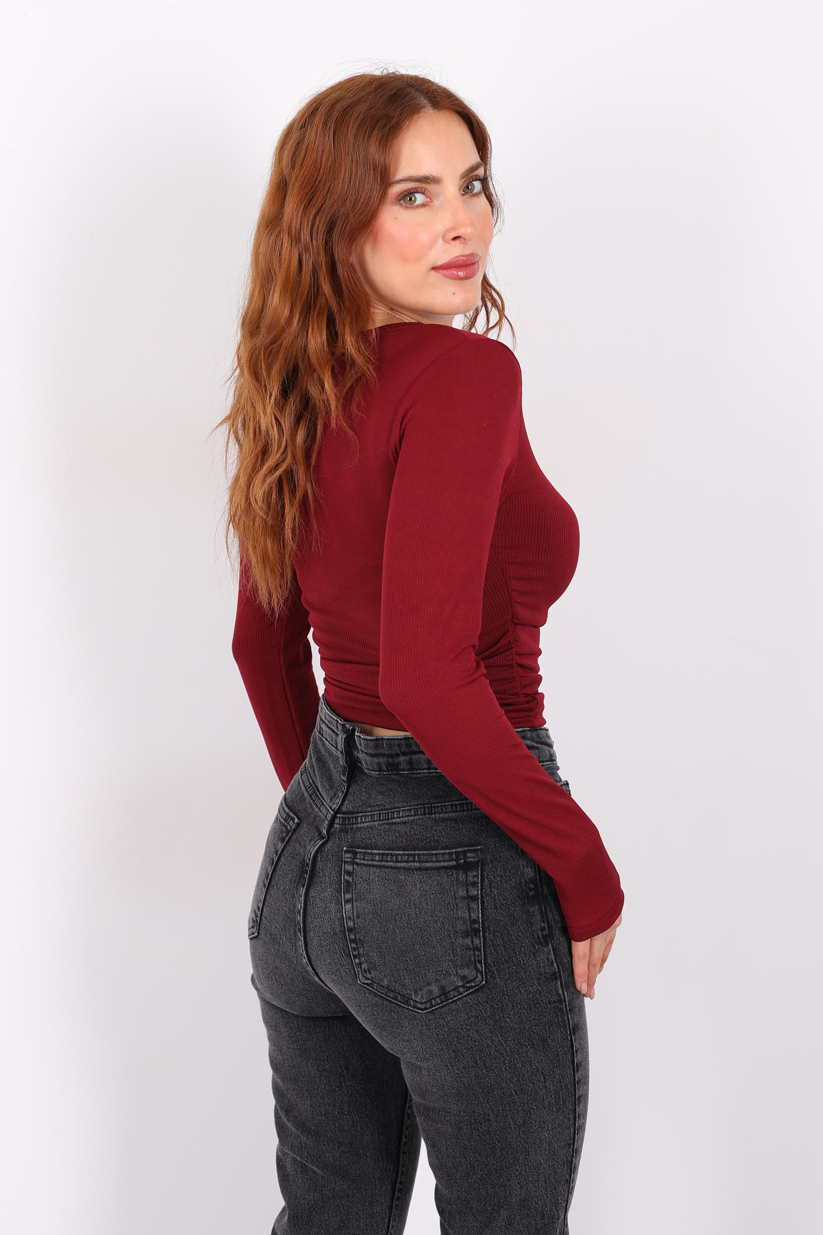 Bordo tonunun sıcak ve derin etkisi, yanı büzgülü tasarım ile birleşerek göze çarpan, sofistike bir görünüm yaratıyor. Yan büzgüler, bel ve yan hatlarda zarif bir hareket kazandırırken, gövdeye hafif bir kıvrım vererek bluzun klasik formuna modern bir yorum ekliyor.Bluzu koyu renkli kalem etek veya kumaş pantolon ile tamamlayarak profesyonel bir görünüm yaratabilirsiniz.