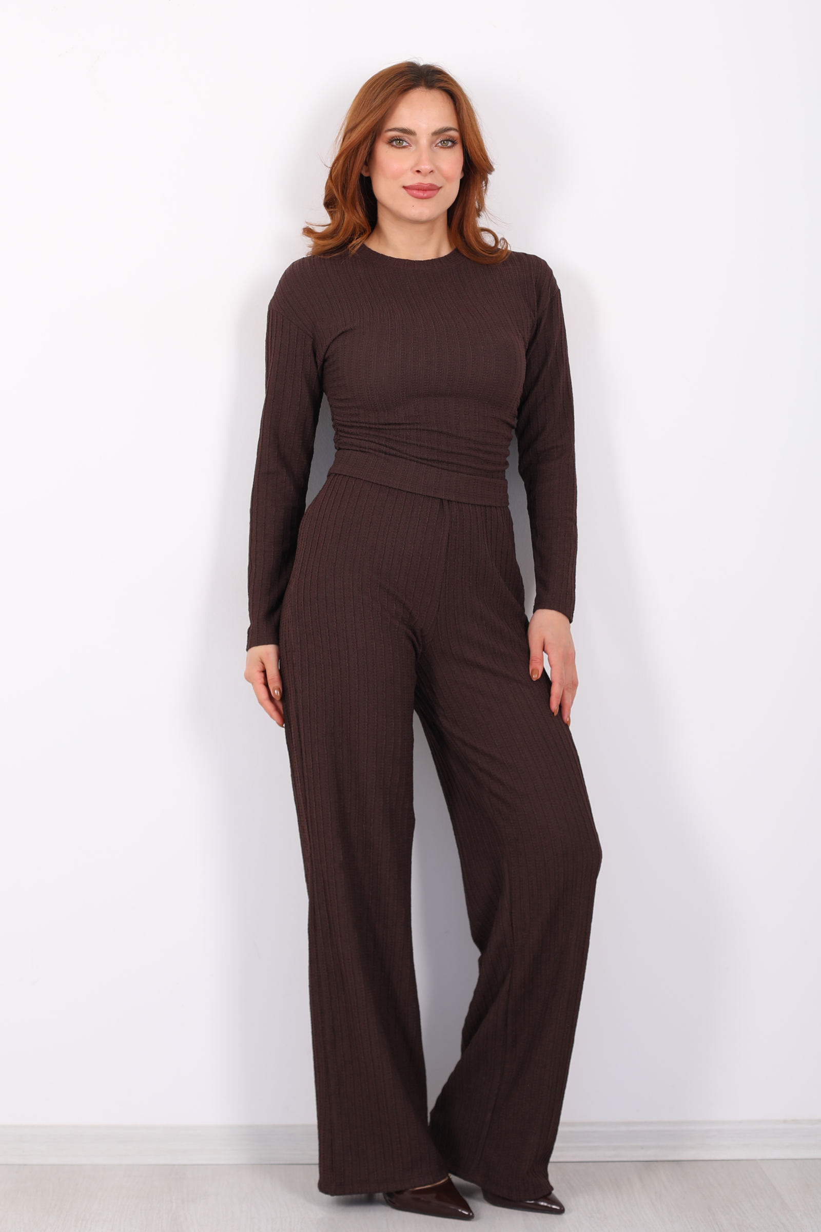 Yanı Büzgülü Kendinden Fitilli Kahverengi Kadın Takım