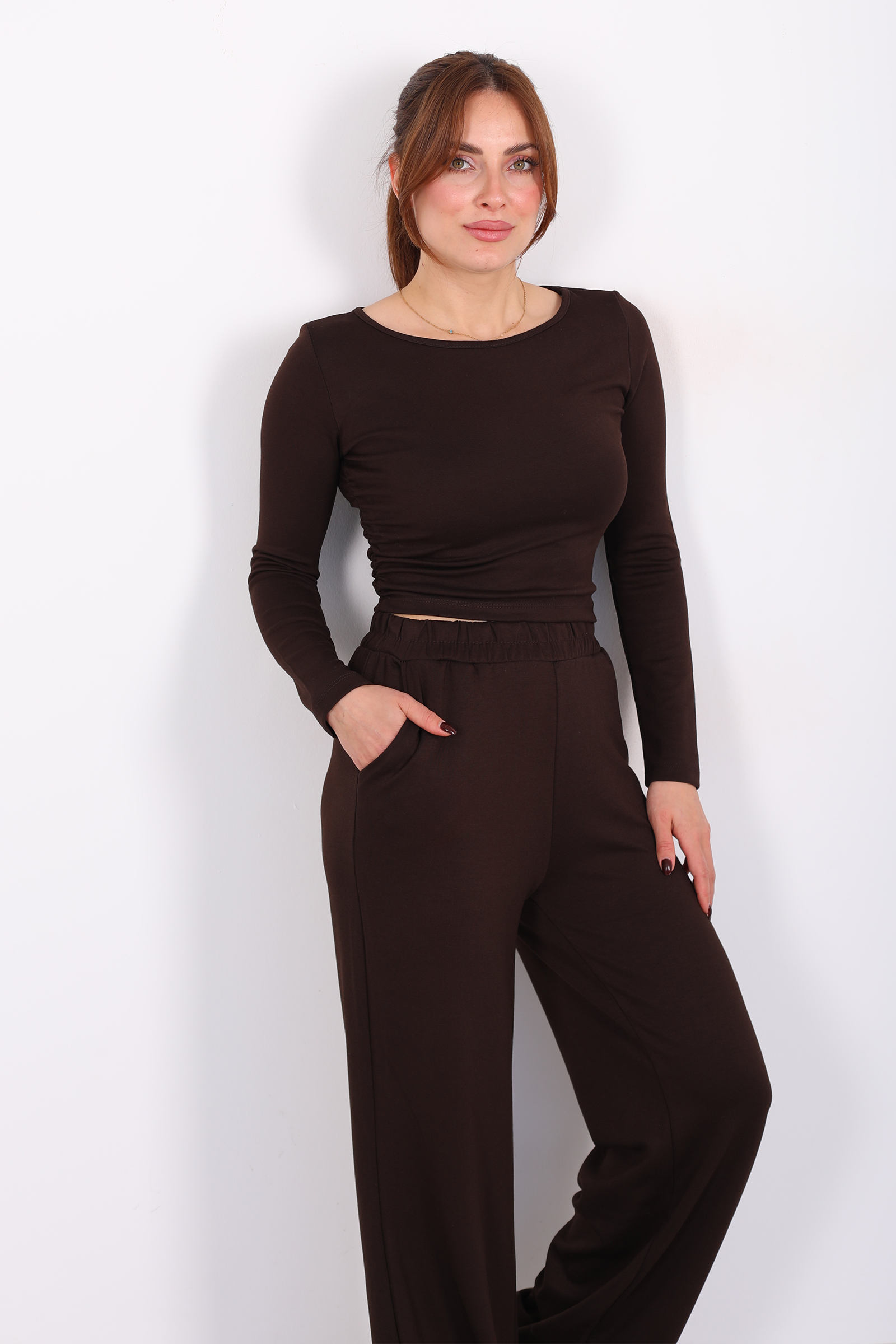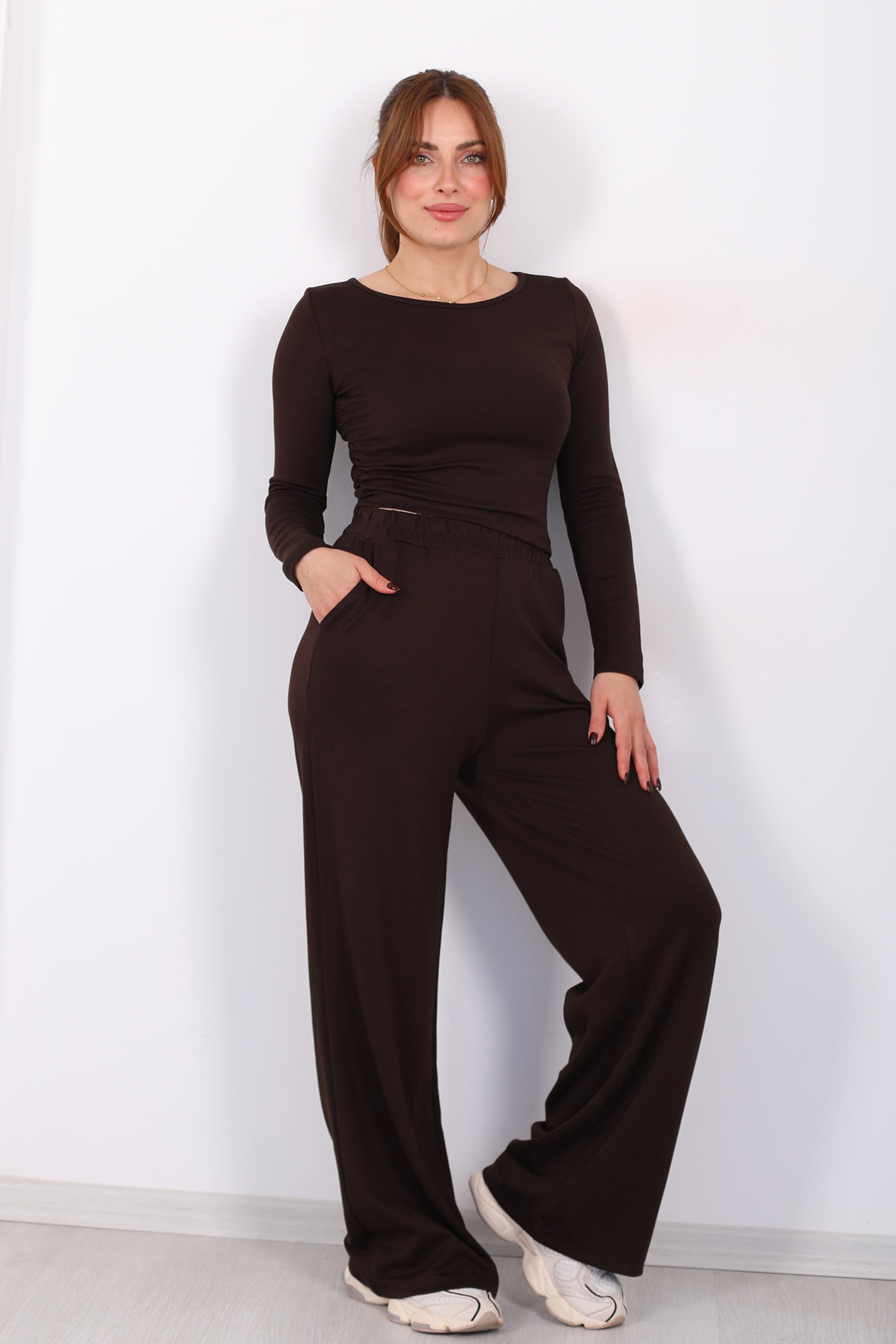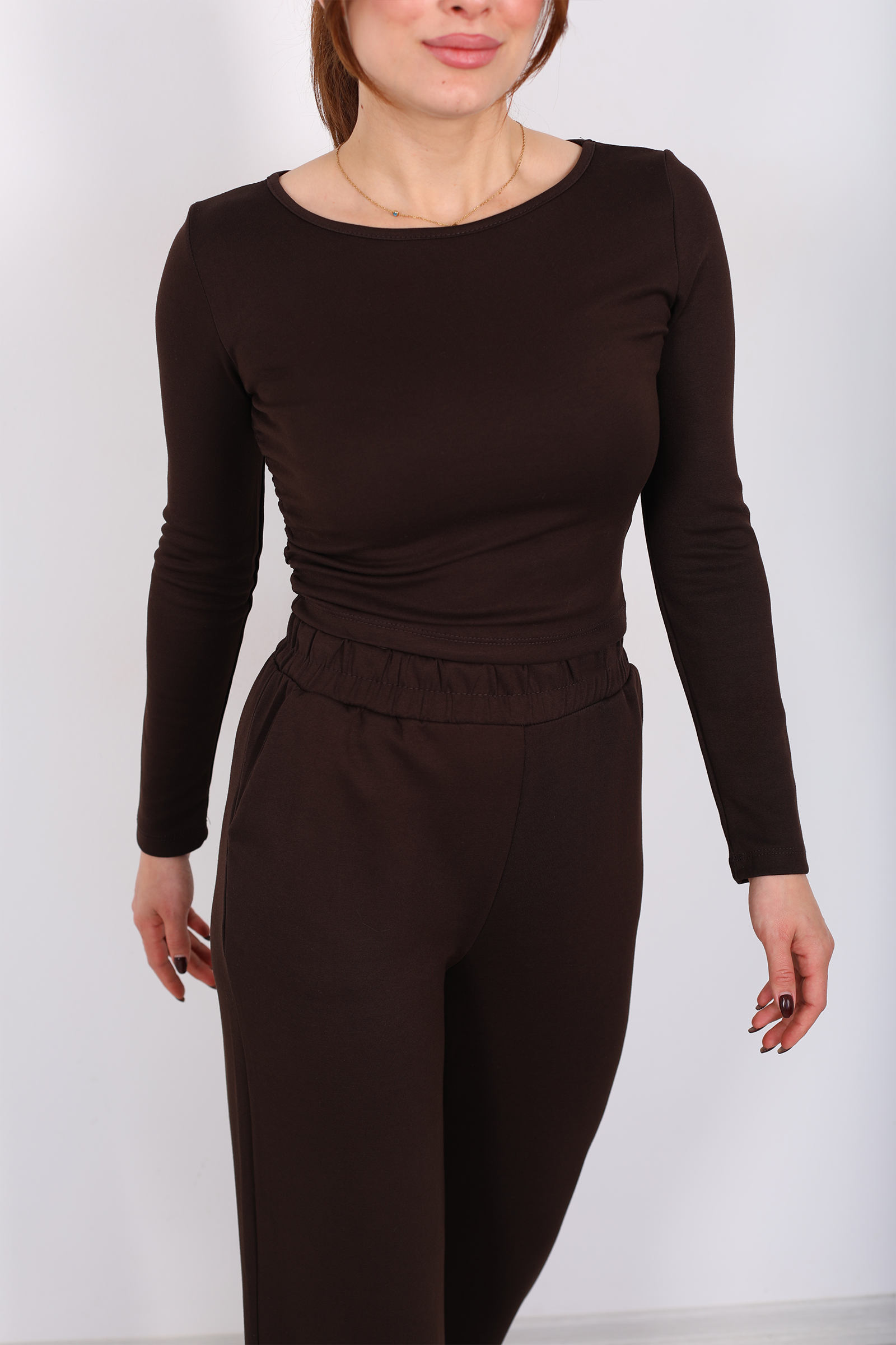 Yanı Büzgülü Modal Acı Kahve Kadın Pantolon Takım, acı kahvenin sıcak tonunu konforla harmanlayan modern bir kombindir. Üst parçanın yan büzgü detayı, tasarıma akışkan bir hareket kazandırırken alt parçanın modal kumaşı, gün boyu yumuşak ve esnek bir kullanım sunar. Acı kahve tonunun doğal cazibesi, bu takımı günlük kombinlerden minimalist şehir stillerine kadar geniş bir yelpazede öne çıkarır.